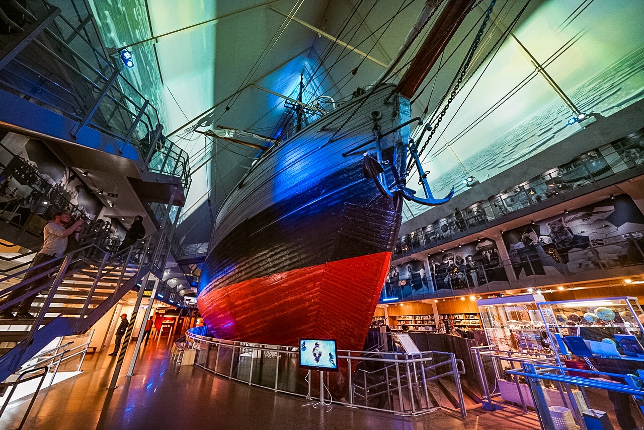Le Fram est le plus célèbre bateau de l’histoire polaire, connu pour ses fabuleuses expéditions dans les Pôles Nord et Sud. On peut monter à bord, pour explorer ce trésor national norvégien, le bateau en bois le plus solide jamais construit, cassant tous les précédents records. On peut aussi l’explorer pour voir comment le personnel naviguant a vécu et travaillé ensemble. On y visitera notamment les cabines des matelots, la cuisine, leur salle dînatoire, la cale du navire et enfin le pont. Le pont qui réserve d’ailleurs une surprise immersive! Une simulation d’expédition polaire : l’expérience à 270 degrés qui simule la banquise autour du bateau et sa soudaine entrée dans une tempête sur une mer agitée avec le son des vagues cernant le bateau et le mouvement du bateau pris au piège dans la glace (sol qui bouge et froid glacial) comme si on le vivait.