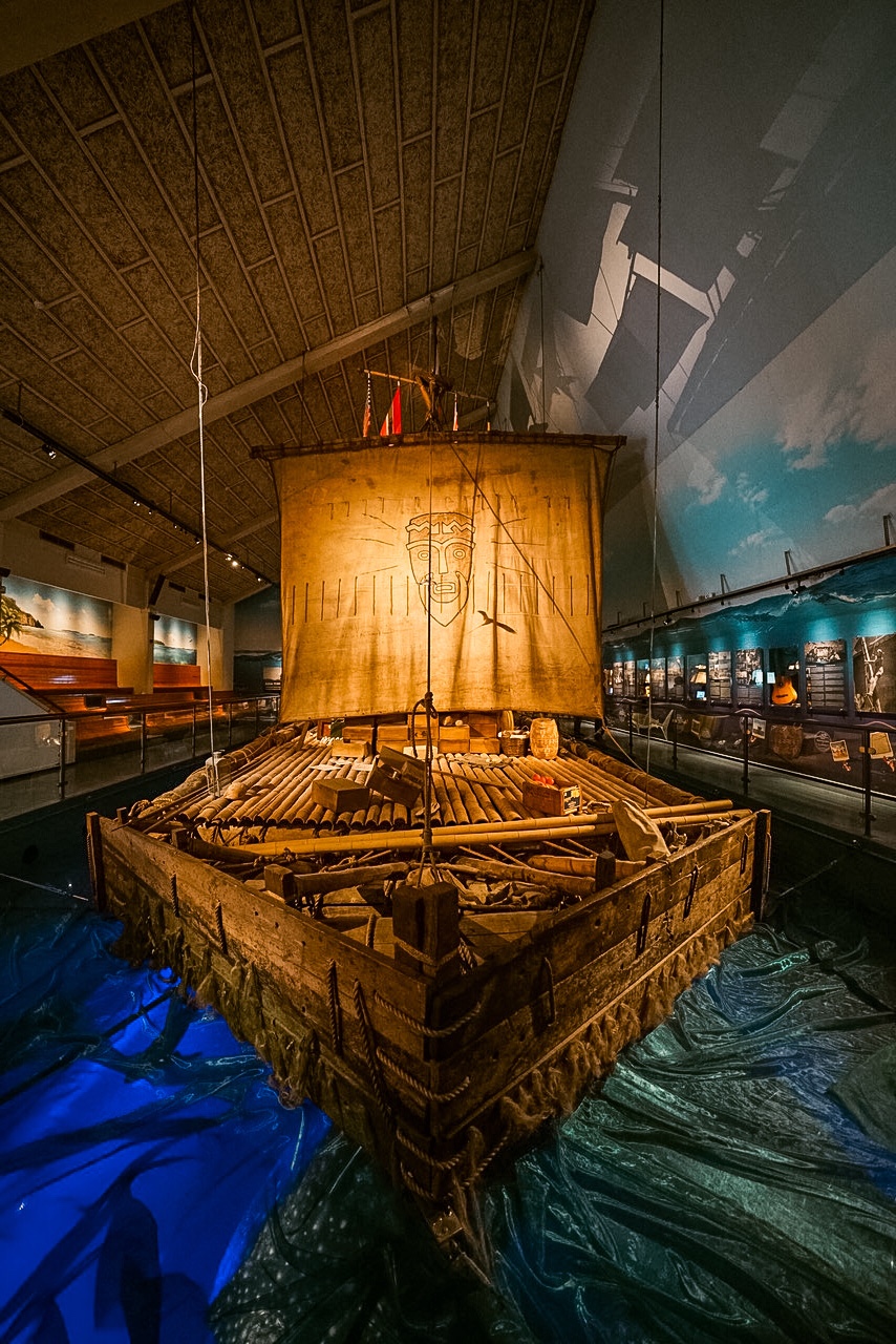 On y découvrira les embarcations d’origine utilisées lors des traversées (le radeau Kon-Tiki, le Ra II) ainsi que des objets comme des statues de l’Ile de pâques provenant des expéditions.