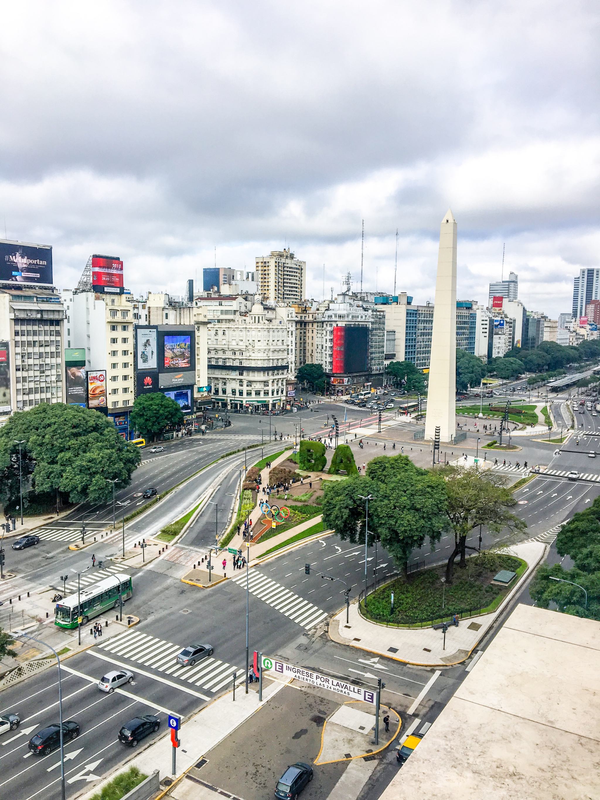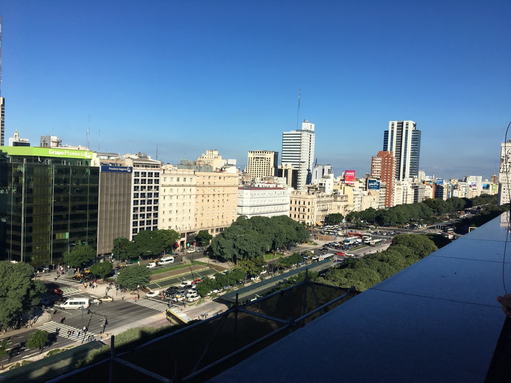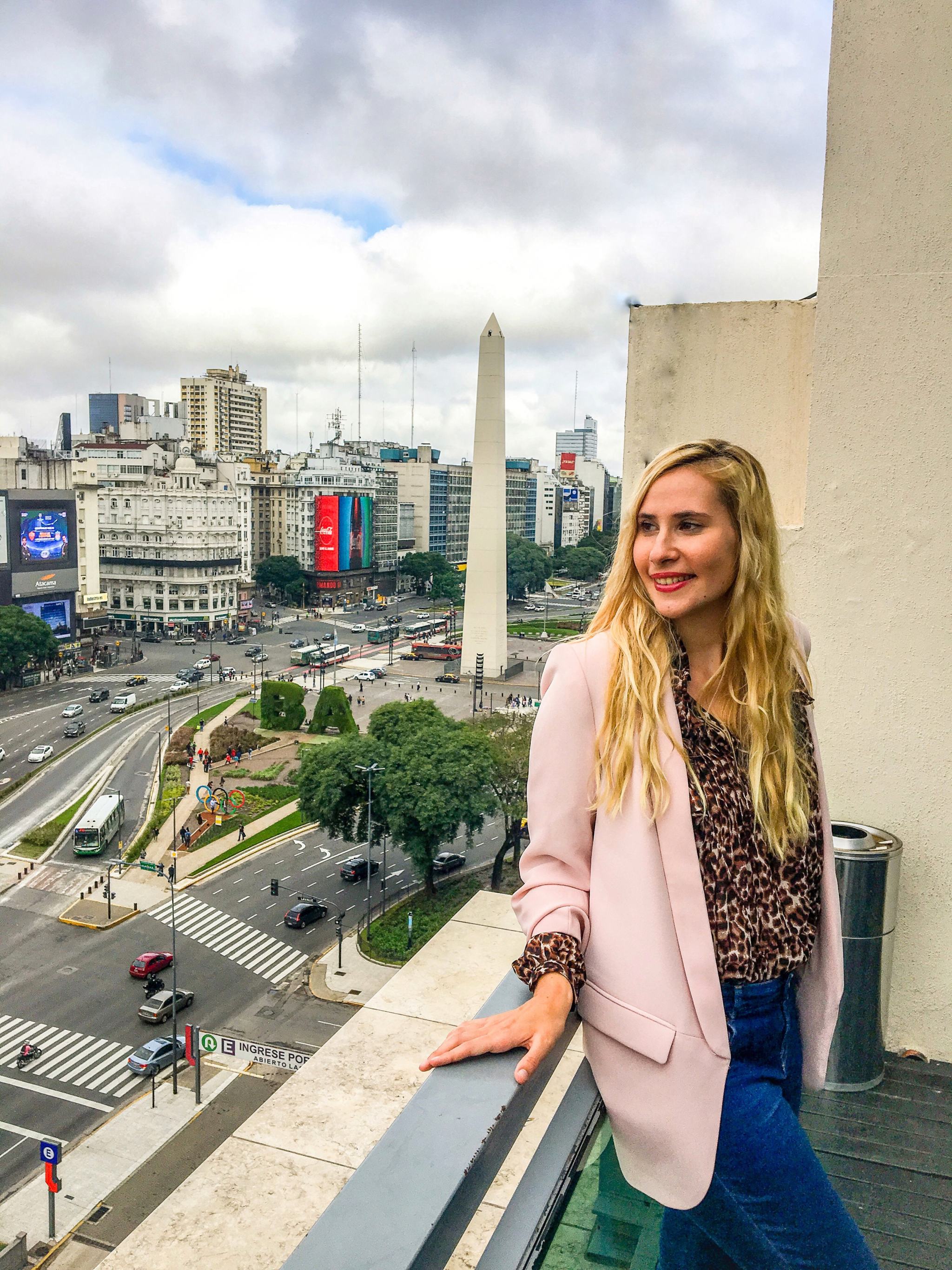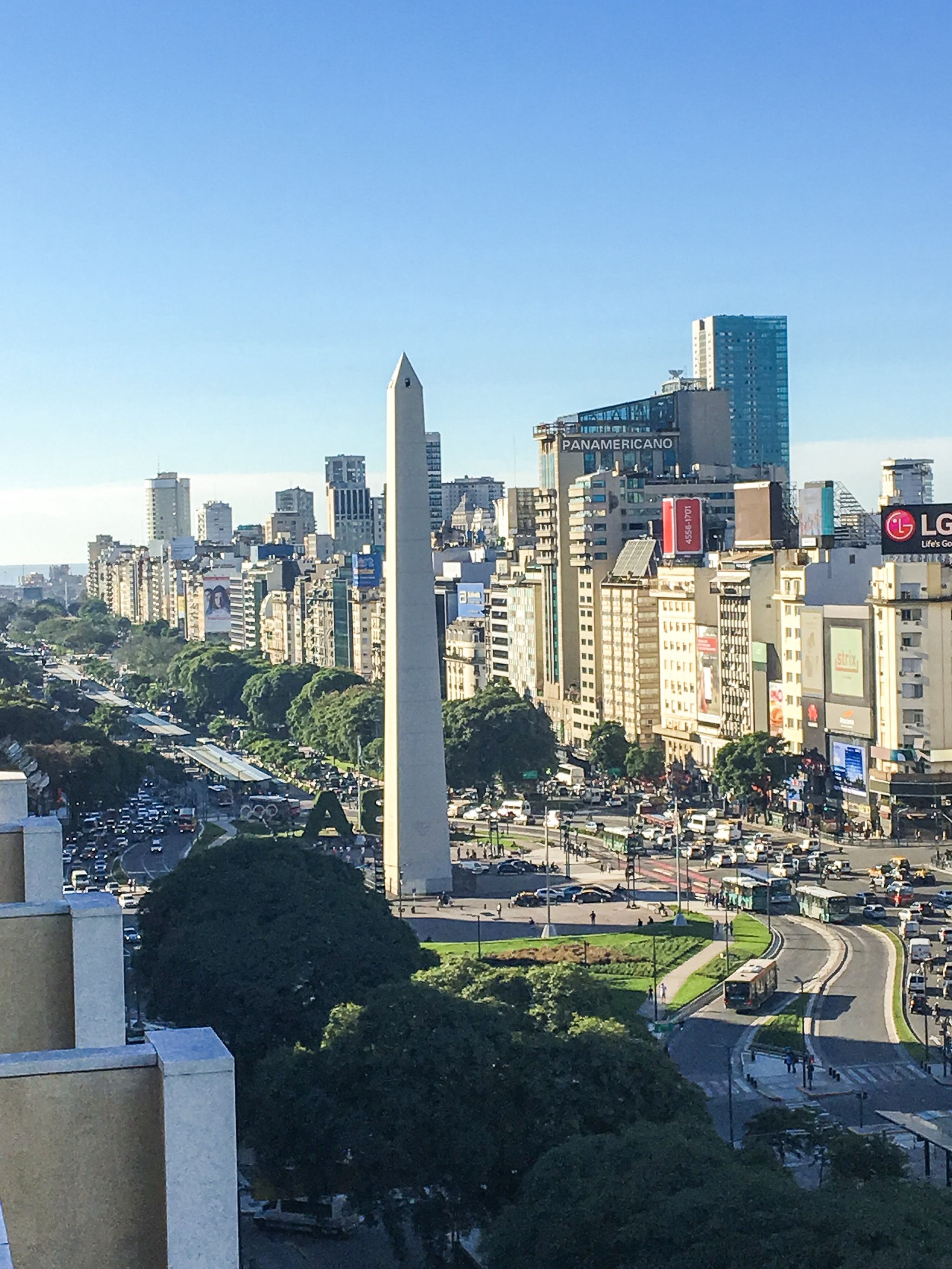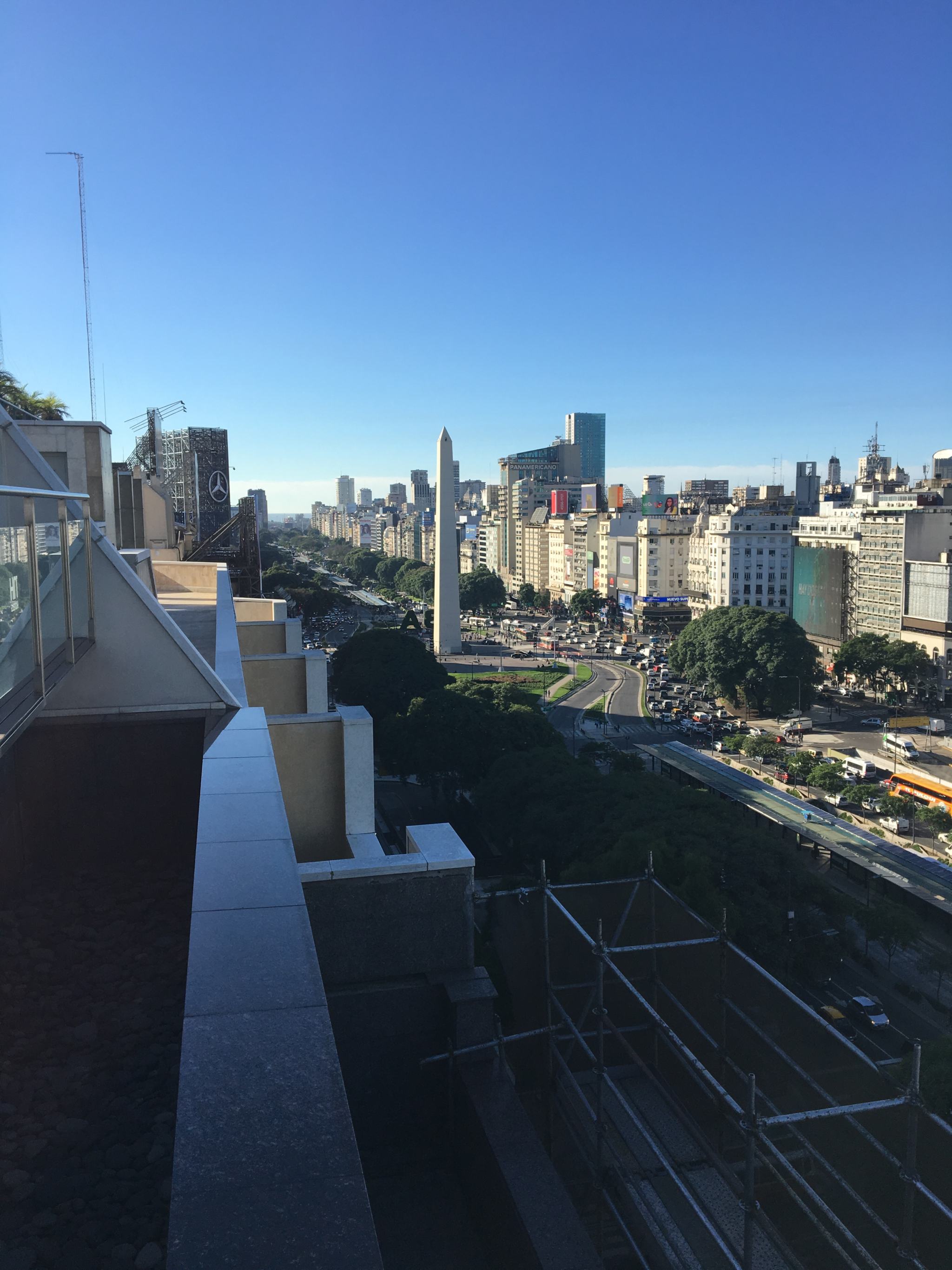 Si vous n’avez pas peur des hauteurs, vous pouvez tenter votre chance d’entrer sur les rooftops de grands hôtels, en demandant la permission bien sûr. J’ai rencontré les marketing managers de différents NH Hotels de la ville qui ont accepté de me laisser monter pour regarder la vue et faire quelques prises. Très jolies vues d’en haut, et avec le soleil on a été gâtés ! Première vue sur la plus large avenue du monde avec ses 140m de largeur et ses 4km de distance, l’Avenida 9 de Julio, nom d’hommage au 9 Juillet 1816, jour de l’Indépendance de l’Argentine. Sa largeur non singulière est due à la structure en damier, les carrés étant appelés les « manzanas ».
