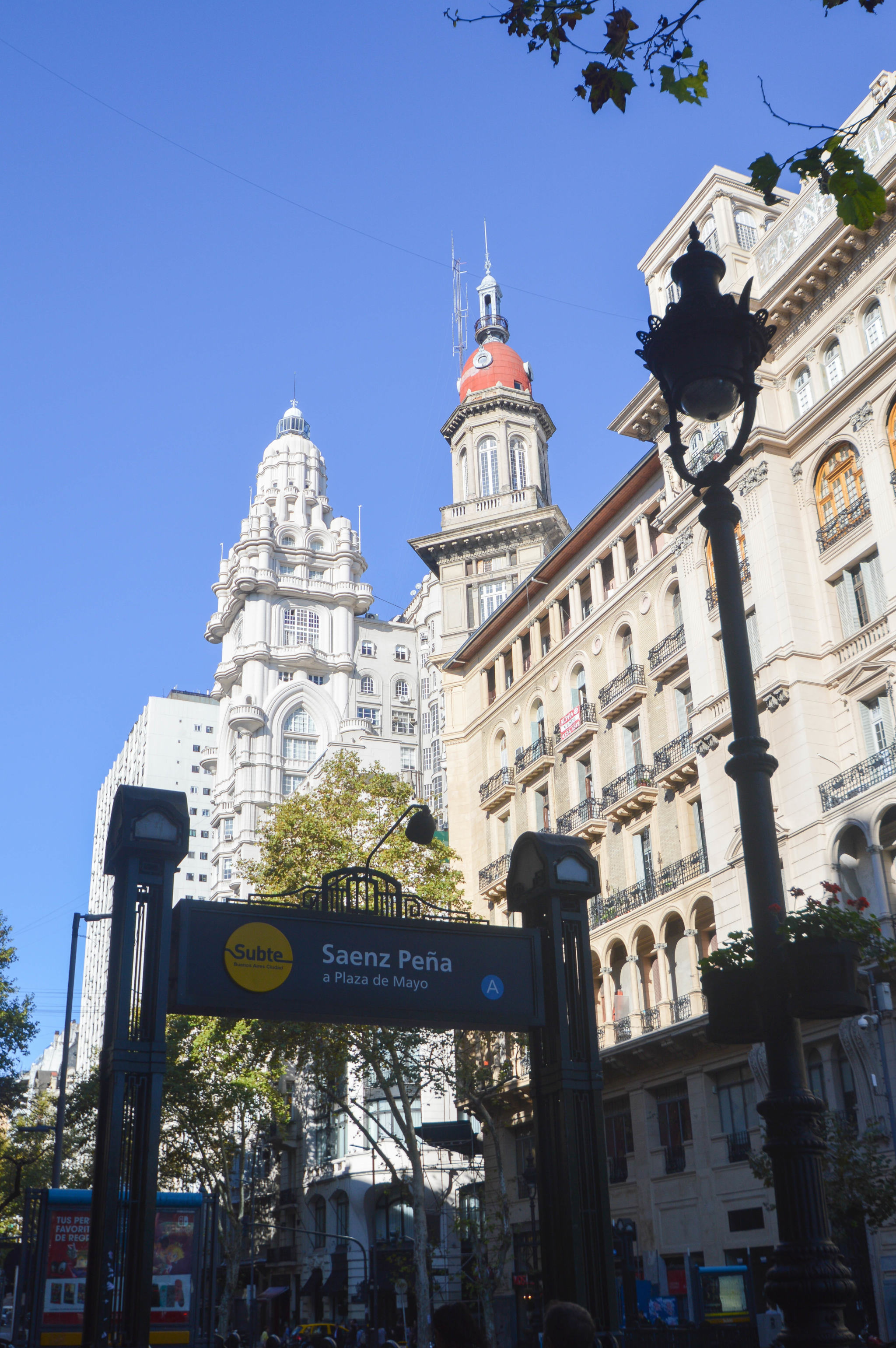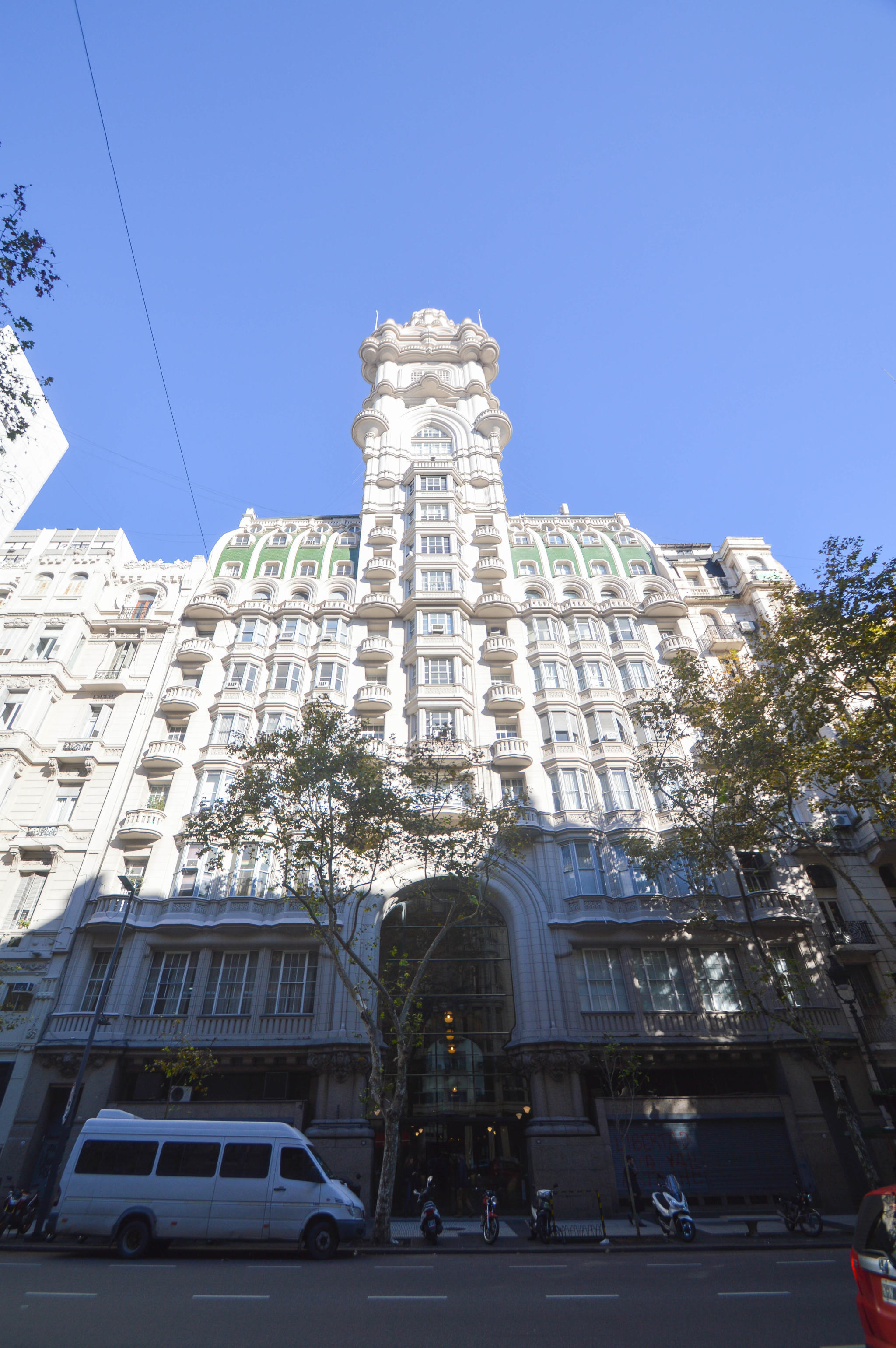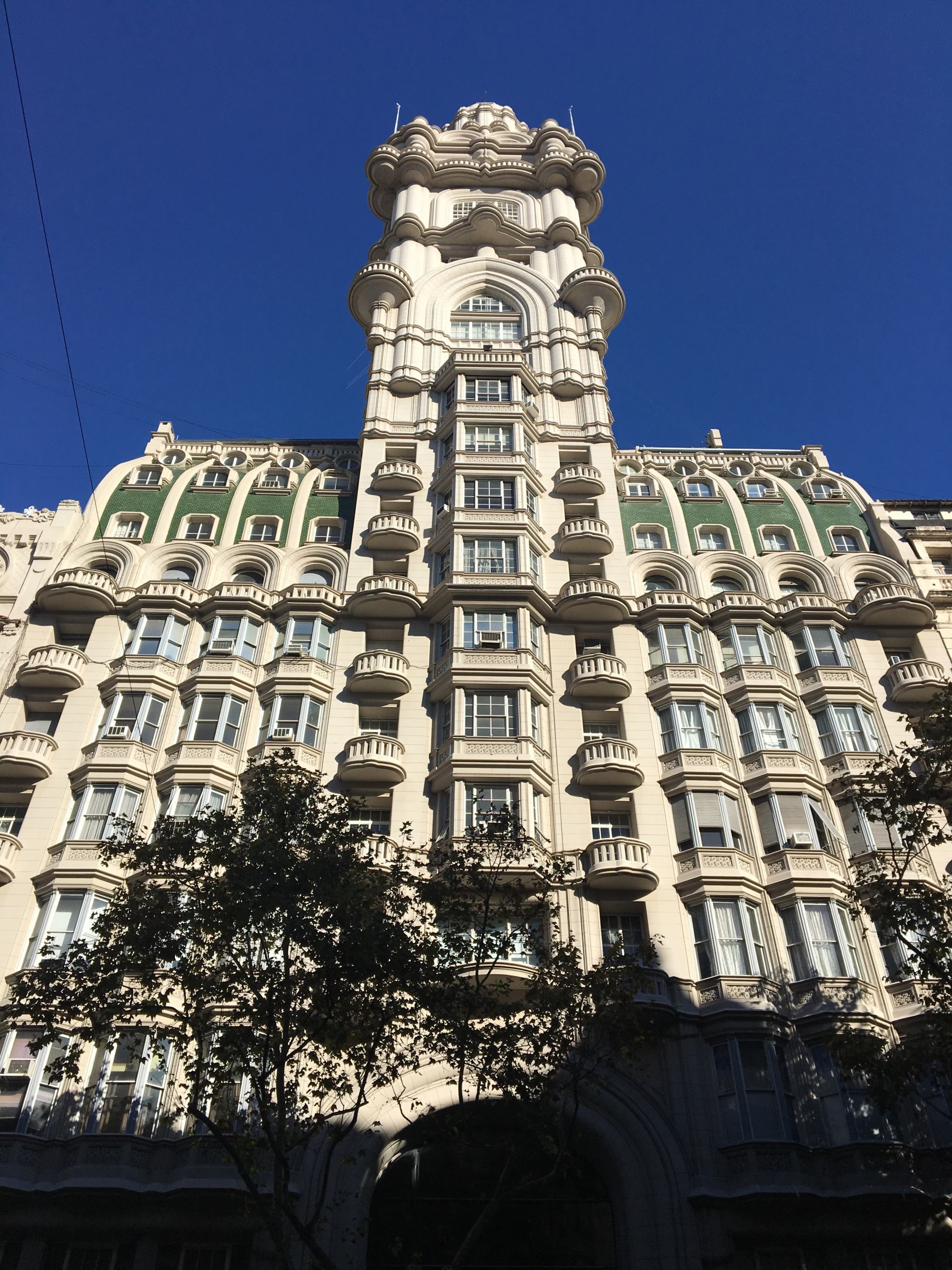 On croise aussi dans l’Avenida de Mayo, l’impressionant et dantesque Palacio Barolo, un gratte-ciel de 100 mètres dont on ne peut pas être frappé par l’architecture unique au mélange d’art nouveau et de néo-gothique, mais aussi un peu indienne dans la coupole. C’était le bâtiment le plus élevé de la ville avant que celui du Kavanagh ne fasse son apparition en 1936. Quatre ans pour être édifié et finalement inauguré en 1923 par l’architecte italien Mario Palanti et le chef d’entreprise textile Luis Barolo, tous deux fans de la « Divine Comédie » de Dante, dont il possède de nombreuses références car ils s’en sont inspirés pour la construction. Les 100 mètres représenteraient les 100 chants du poème et les 22 étages de l’édifice sont volontairement répartis en 3 secteurs qui correspondent à l’enfer (au rez-de-chaussée), le purgatoire (14 premiers étages) et le paradis (8 derniers étages + le phare au sommet). Le phare a servi de guide pour les bateaux à l’époque mais maintenant est juste une décoration. Le bâtiment est principalement occupé de bureaux et de galeries. Depuis 2009, il est reconnu monument historique national.