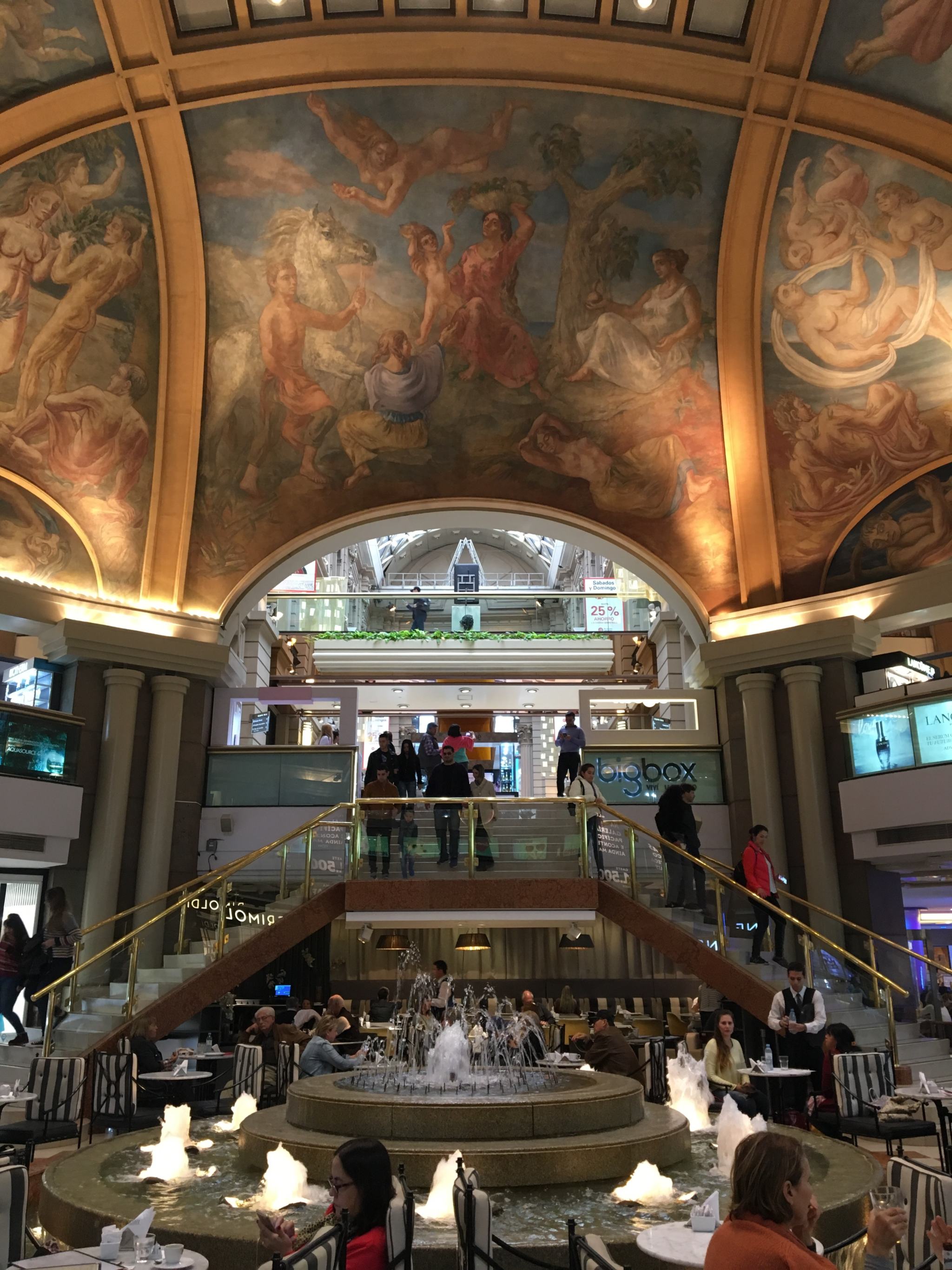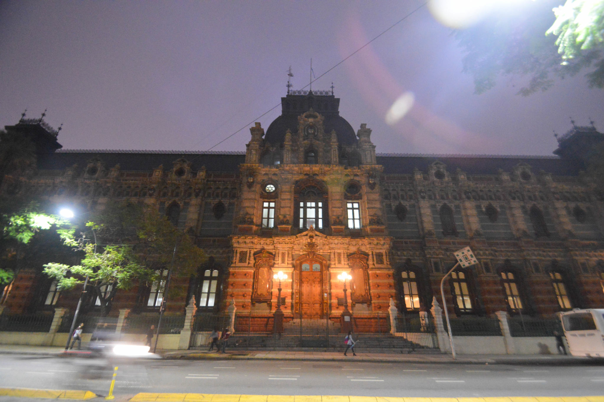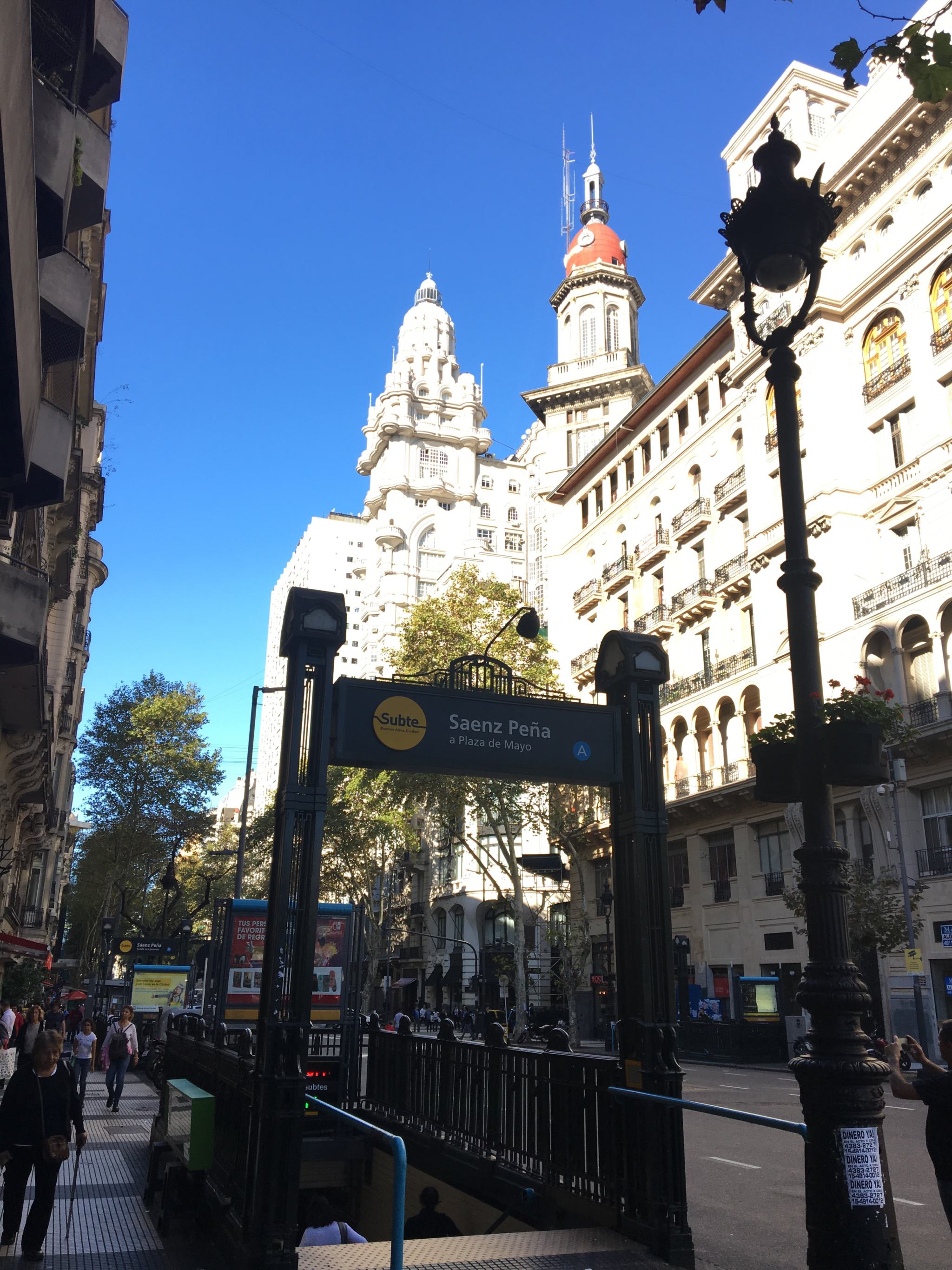 On croise aussi dans l’Avenida de Mayo, l’impressionant et dantesque Palacio Barolo, un gratte-ciel de 100 mètres dont on ne peut pas être frappé par l’architecture unique au mélange d’art nouveau et de néo-gothique, mais aussi un peu indienne dans la coupole. C’était le bâtiment le plus élevé de la ville avant que celui du Kavanagh ne fasse son apparition en 1936. Quatre ans pour être édifié et finalement inauguré en 1923 par l’architecte italien Mario Palanti et le chef d’entreprise textile Luis Barolo, tous deux fans de la « Divine Comédie » de Dante, dont il possède de nombreuses références car ils s’en sont inspirés pour la construction. Les 100 mètres représenteraient les 100 chants du poème et les 22 étages de l’édifice sont volontairement répartis en 3 secteurs qui correspondent à l’enfer (au rez-de-chaussée), le purgatoire (14 premiers étages) et le paradis (8 derniers étages + le phare au sommet). Le phare a servi de guide pour les bateaux à l’époque mais maintenant est juste une décoration. Le bâtiment est principalement occupé de bureaux et de galeries. Depuis 2009, il est reconnu monument historique national.