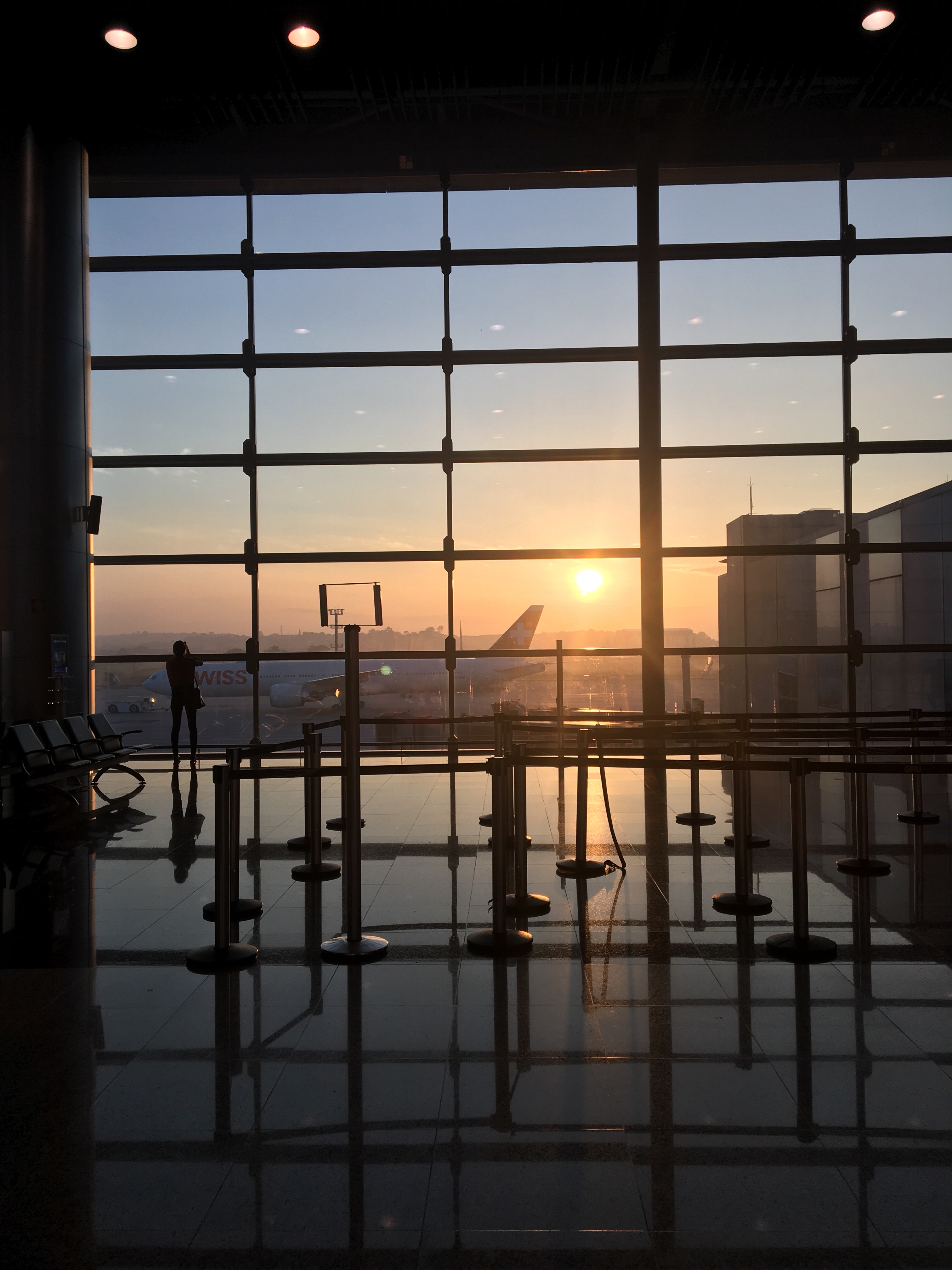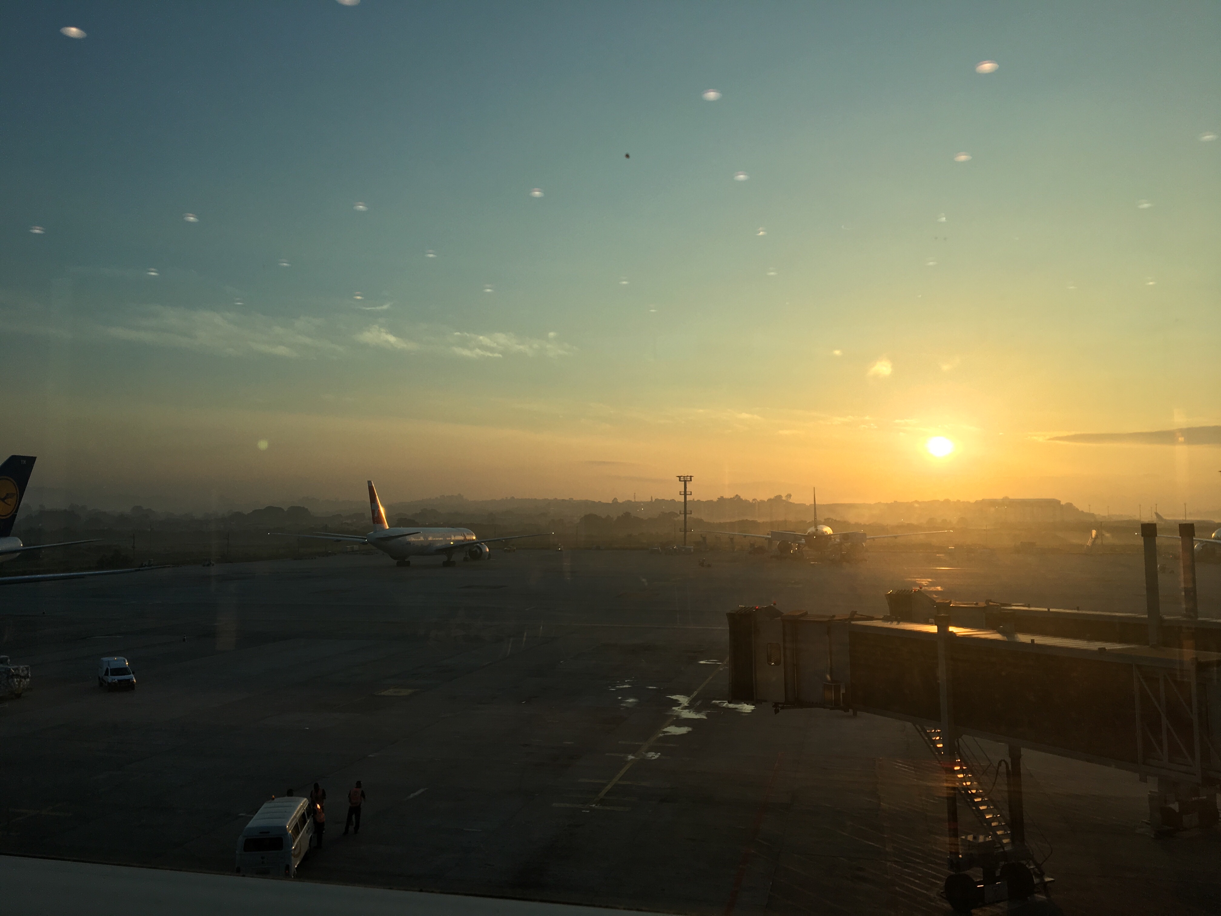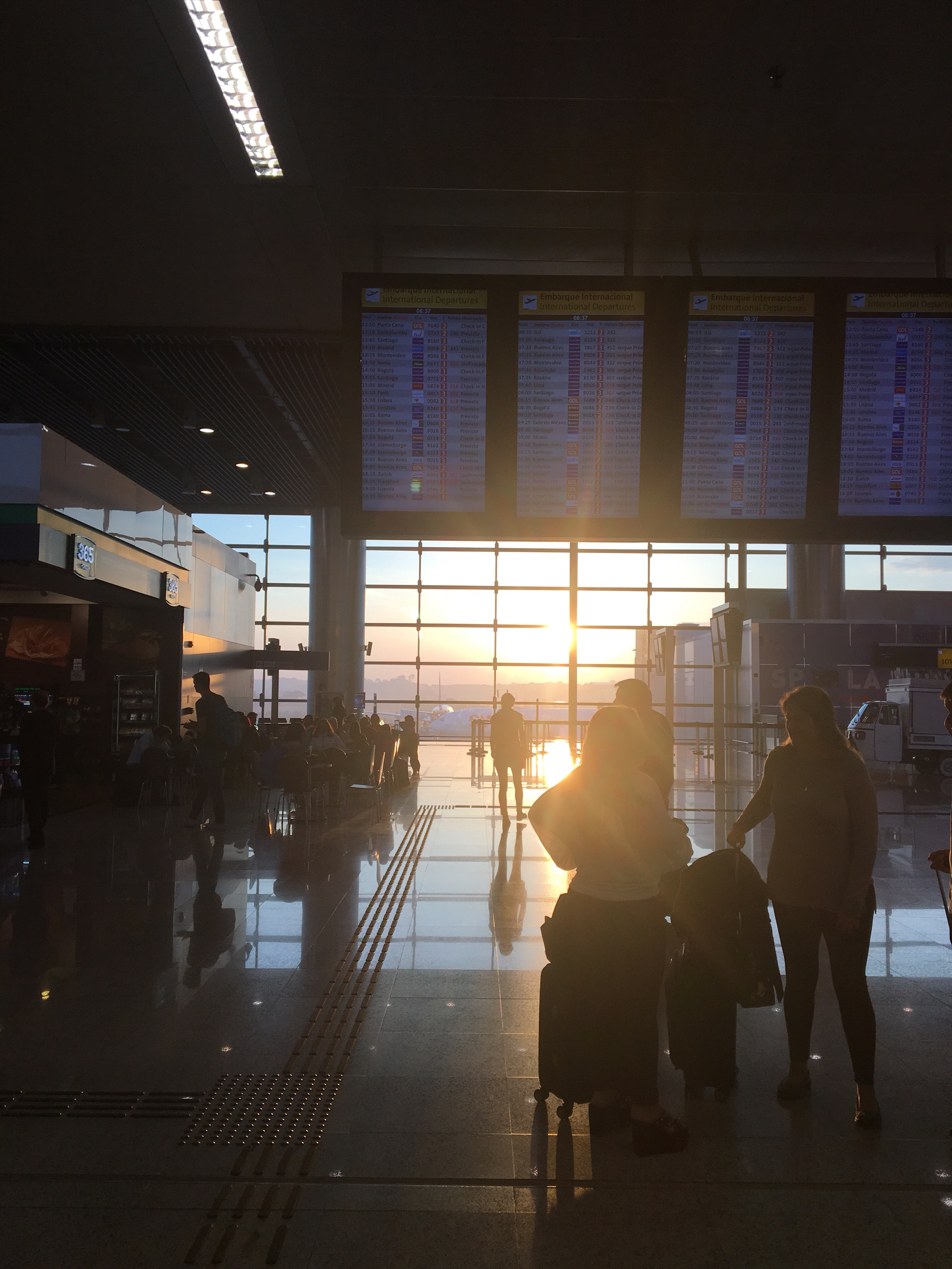 En cherchant notre nouvelle porte d’embarquement, nous passons devant toutes les boutiques de l’aéroport, on voit du café brésilien, des grosses bouteilles d’alcool dans des rayons massifs, des tenues fleuries annonçant la couleur et la chaleur d’ici, un Victoria Secret…et on arrive face à un chaleureux lever de soleil, il est maintenant 6h45, on comprend mieux ce que veulent dire les 20 degrés si tôt le matin !