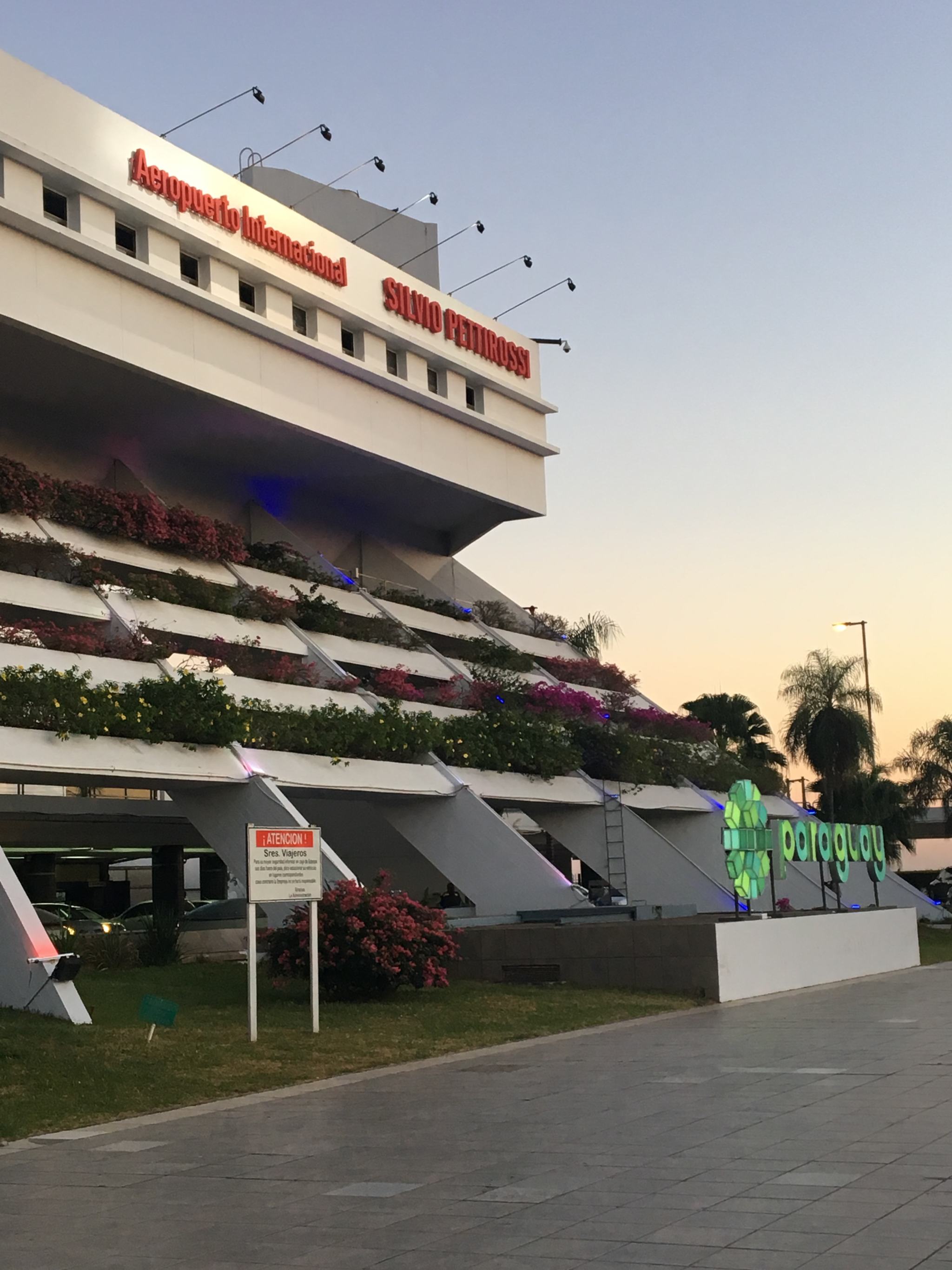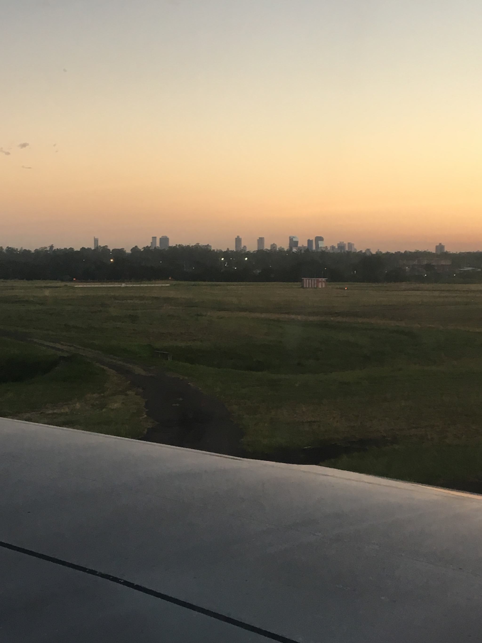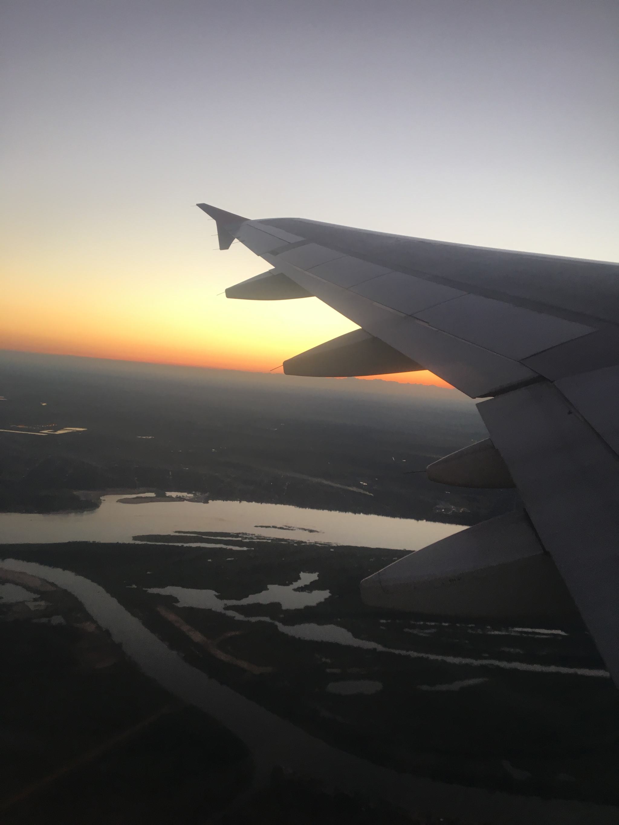 En cherchant notre nouvelle porte d’embarquement, nous passons devant toutes les boutiques de l’aéroport, on voit du café brésilien, des grosses bouteilles d’alcool dans des rayons massifs, des tenues fleuries annonçant la couleur et la chaleur d’ici, un Victoria Secret…et on arrive face à un chaleureux lever de soleil, il est maintenant 6h45, on comprend mieux ce que veulent dire les 20 degrés si tôt le matin !