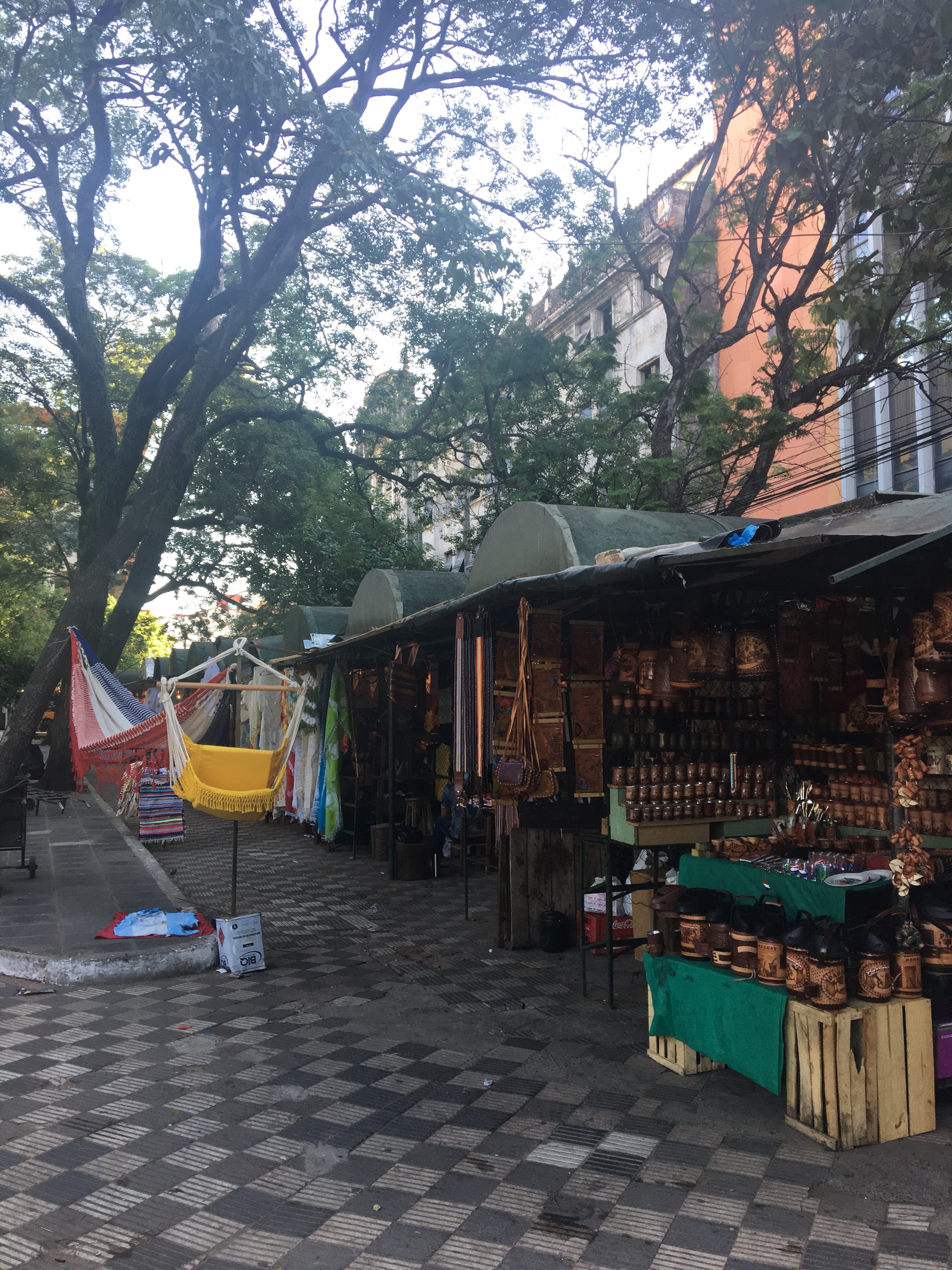 16h : Balade sur la Plaza de la Libertad et son petit marché local. C’est ici que nous découvrons pour la première fois ce que sont les tissus ñandutis, une matière locale de dentelle signifiant en Guarani (le deuxième langage local) toile d’araignée. Tout l’artisanat est là, entre porte-monnaies, verres de tereré, tasses, vêtements, que de magnifiques objets qui feront de beaux souvenirs à ramener et à garder précieusement.