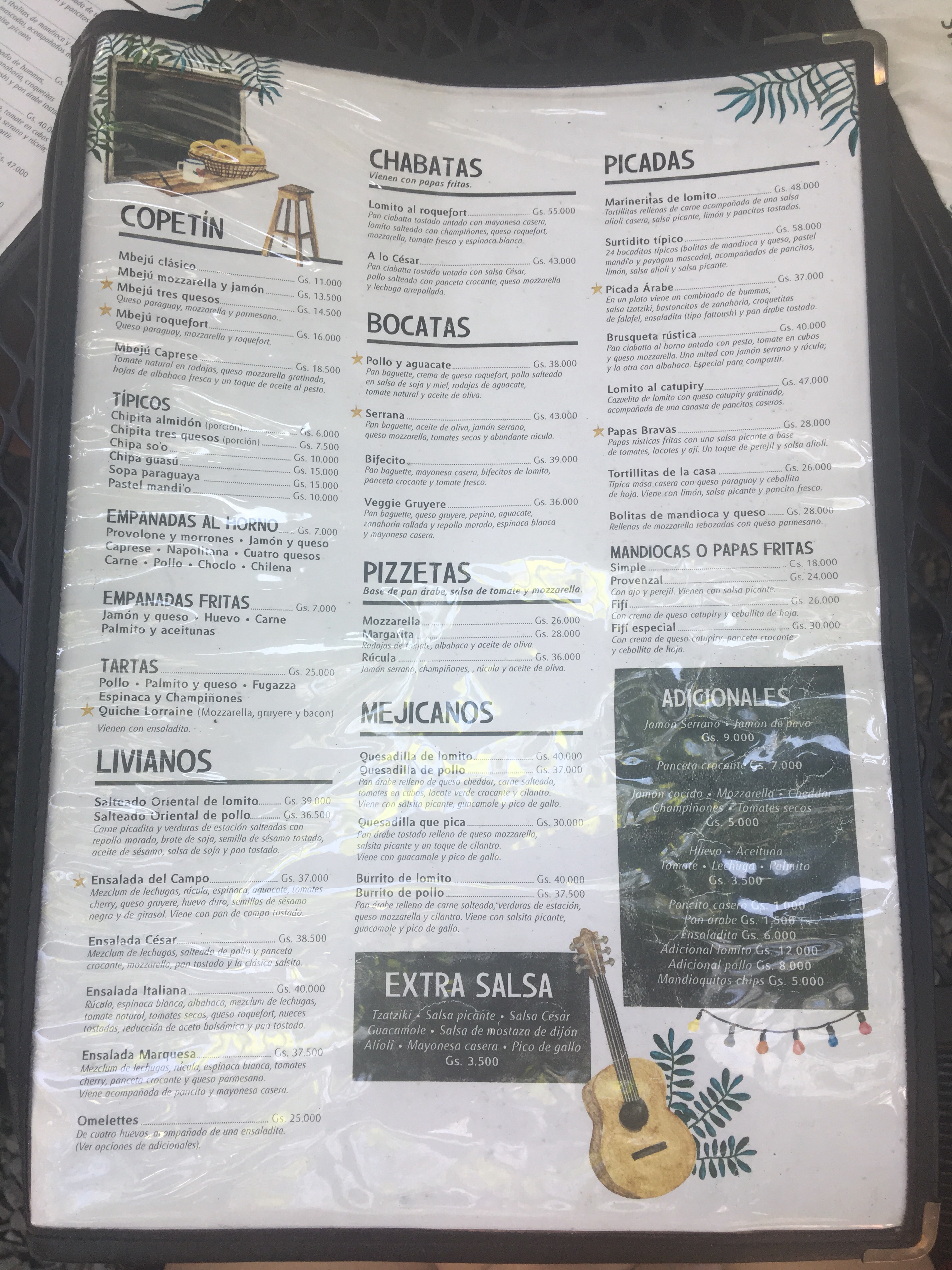 Le midi, retour au bercail, à Asu (diminutif de Asunción) précisément dans le quartier du lycée international français où nous allons manger au restaurant La Galette, stratégiquement placé là ! Un beau lieu créé par un pur breton expatrié, tombé amoureux du Paraguay, qui a ouvert son propre restaurant.