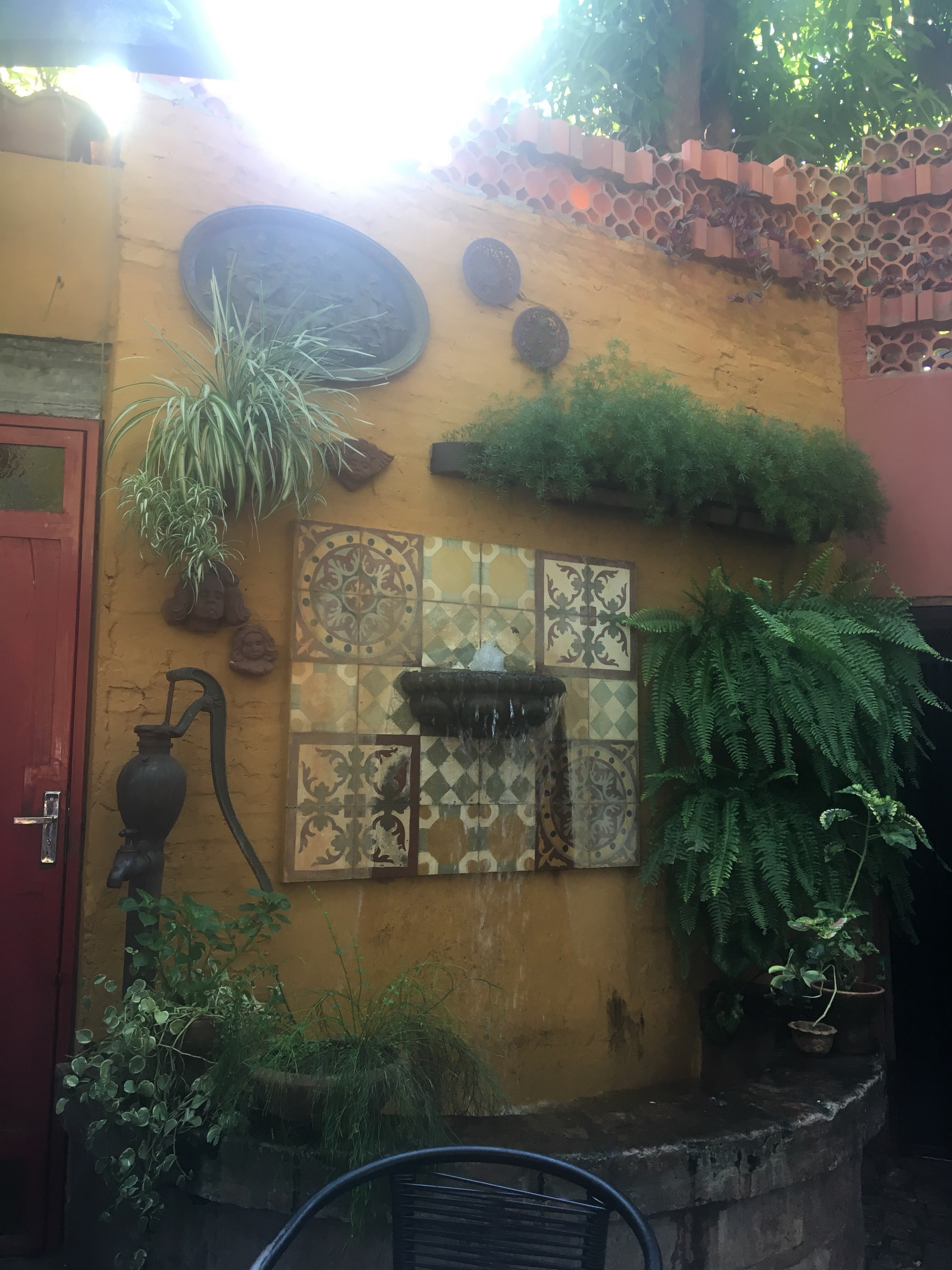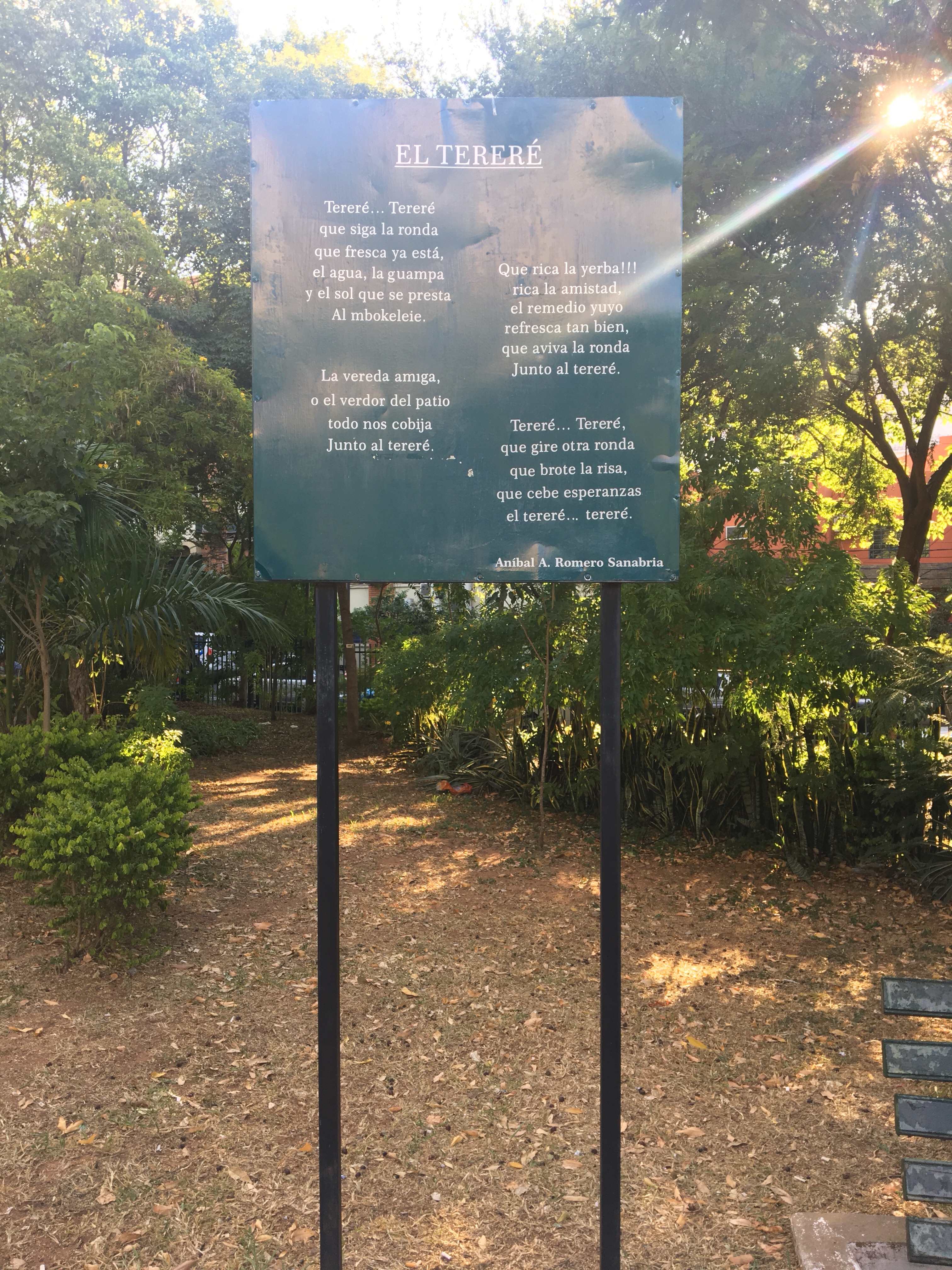 Nous arrivons au café, c’est un lieu splendide aux dalles noires et blanches à l’intérieur, avec son côté salon de thé, puis dehors le côté restaurant sous une belle verrière naturelle avec une ancienne fontaine et des plantes. Le décor est buccolique. C’est parti pour goûter plein de spécialités locales ! Je vous mets le détail sur la photo juste en dessous. Mbeju, sopa paraguaya, pastel mandio, chipa, empanadas, chipa guazu, fait avec de la farine, du manioc, de la farine de maïs, etc déjà une addiction à tout ça. Ici, ce qui fait beaucoup parti de la culture, c’est la boisson locale à base de plante de maté, le tereré, que je mentionnais plus haut et les asados, ces barbecues géants conviviaux qui rassemblent tout un quartier.