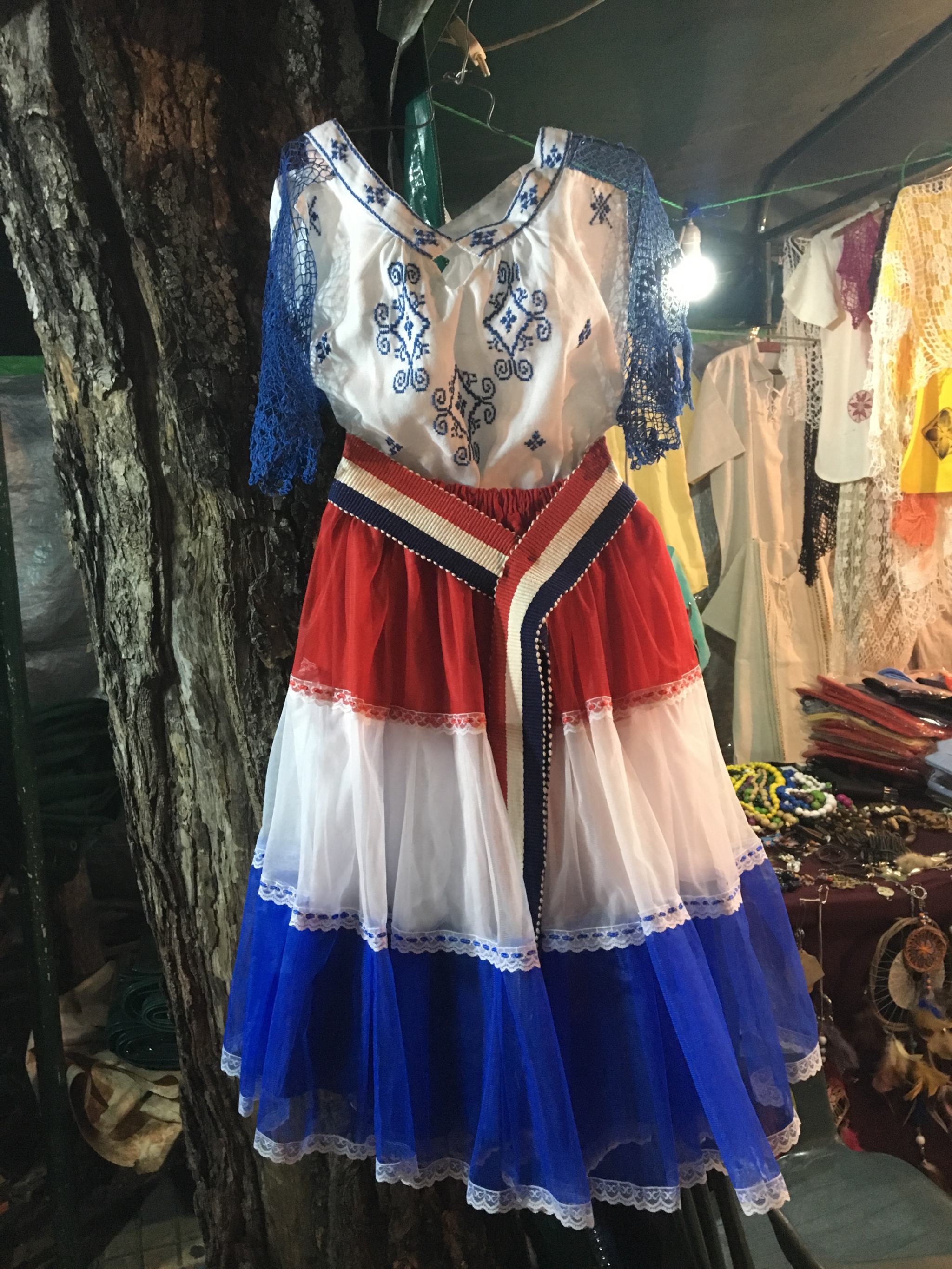Nous y achetons des dessus de table pour une quinzaine d’euros (210,000 guaranis) et j’essaye une robe de danse Paraguayenne bien colorée. Très jolie mais je ne l’ai pas prise car trop chère. Les prix séparés étaient de 50€ pour le top et 500€ pour la jupe qui a nécessité 3 mois de réalisation. Le travail est très minutieux ça se voit dans le détail et au toucher.