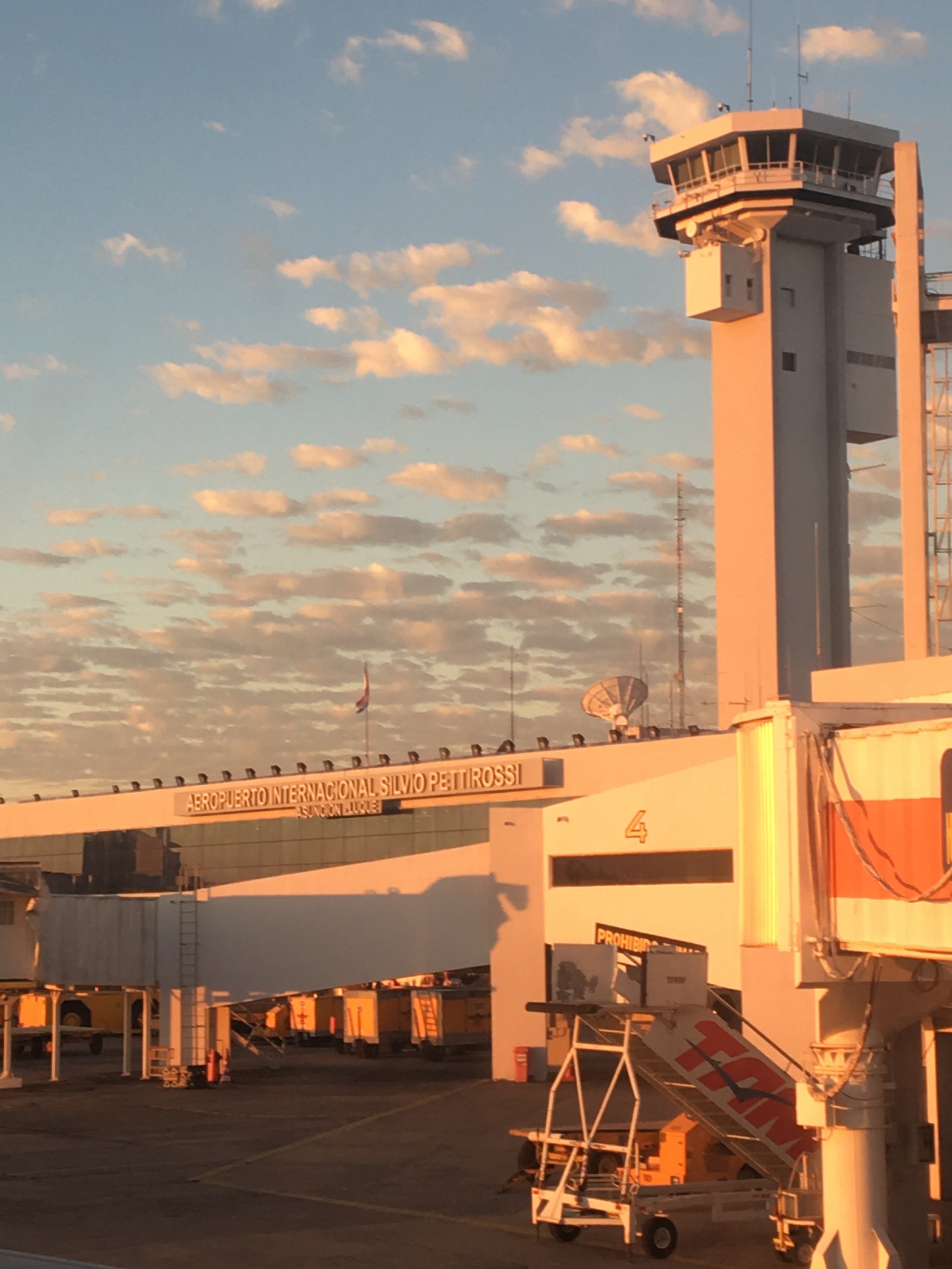 10h heure de Paris (6h du matin heure locale) / Aéroport International de Guarulhos : Nous avons tout juste le temps de récupérer notre bagage et de le ré-enregistrer pour le prochain vol qui décolle à 7h30 et qui durera 2h15. 1h de décalage horaire est à considérer entre le Paraguay avec le Brésil, l’Argentine et l’Uruguay, on arrivera à 8h44 heure locale paraguayenne. Les vols internationaux ne sont pas très bien indiqués dans l’aéroport de Guarulhos, seulement les vols domestiques, ce qui nous a rendu la tâche difficile. De plus, les agents ne font pas beaucoup d’effort pour parler une autre langue que le portugais. Il fallait finalement suivre le chemin des vols domestiques et revenir au 2ème étage. Pour ré-enregistrer les bagages, il n’y avait qu’une seule grande file où un agent appelait les passagers aux comptoirs par destinations : Buenos Aires, Montevideo, Asunción etc