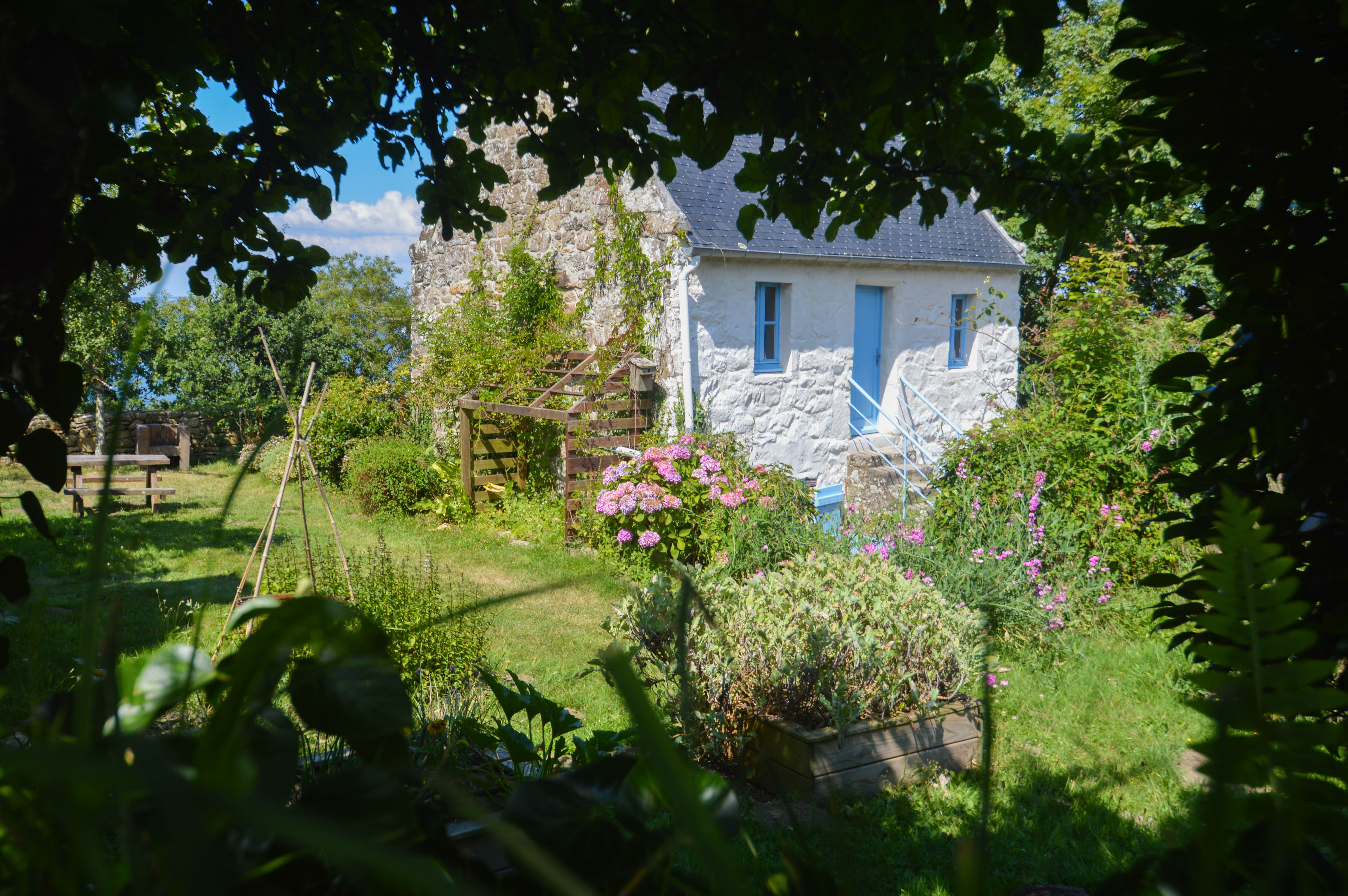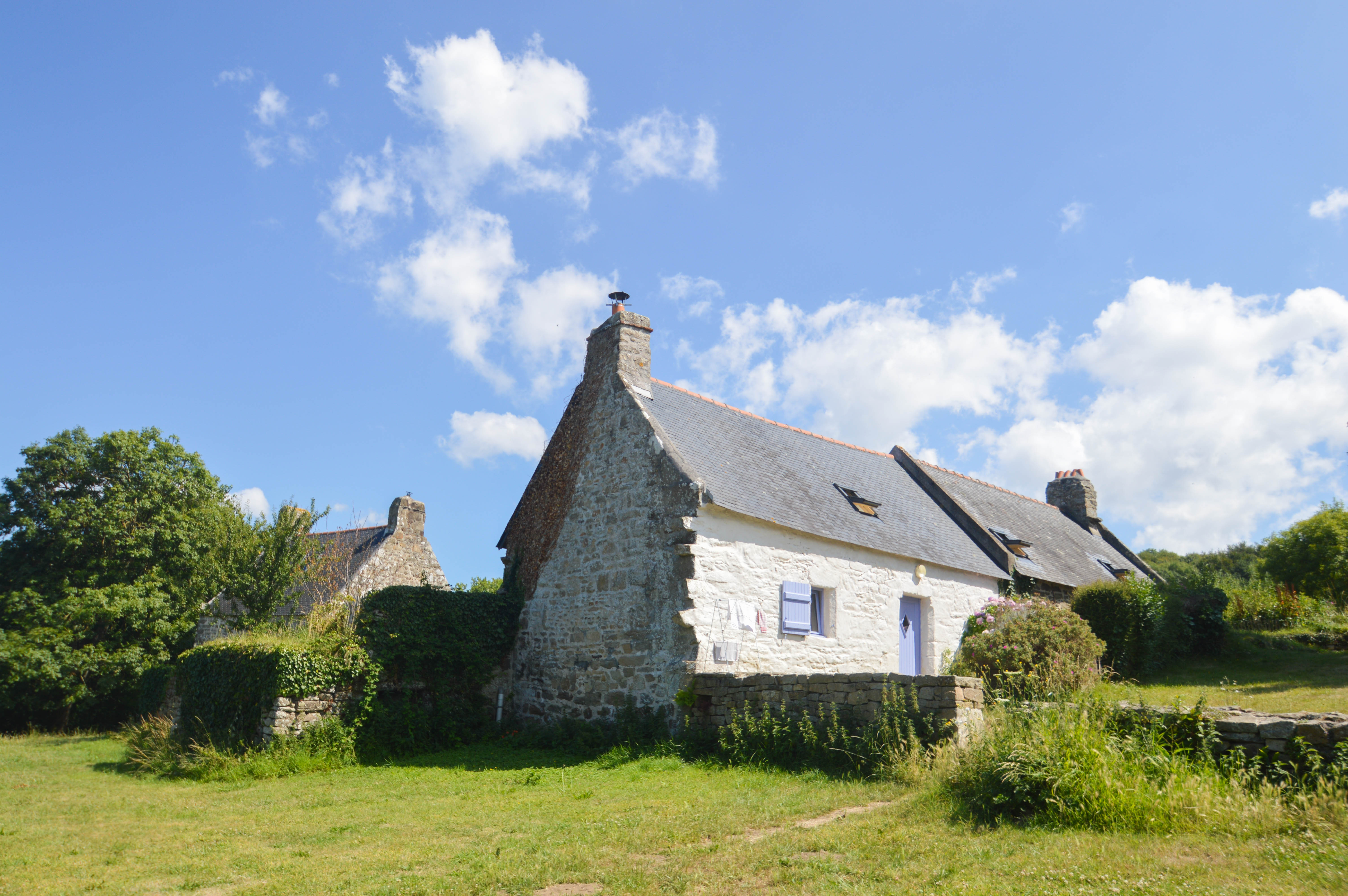 18h, la journée n’est pas finie ! Changement de cap vers la plage de l’Île Vierge qui se situe sur la grande presqu’île de Crozon. De Crozon à Camaret, du Cap de la Chèvre à Morgat, en passant par cette fameuse île vierge, elle est au carrefour du Parc naturel régional d’Armorique et du Parc marin d’Iroise, ainsi que de la Rade de Brest et la Baie de Douarnenez. Sur la route, nous sommes interpellés par un magnifique champ d’hortensias qui nous font de l’oeil ! Pas moyen, nous sommes obligés de nous arrêter. Ce petit village aux airs de « Hobbit Town » s’appelle Montourgard. Nous faisons quelques plans et prises photos dans cet endroit atypique puis repartons pour la plage de Crozon malgré le temps qui se gâte. La place est telle que je l’ai laissée l’an dernier…toujours aussi merveilleuse même si elle n’est pas bien mise en valeur par le ciel gris ! Nous décidons d’y revenir le lendemain afin de mieux en percevoir les couleurs des bruyères et voir le soleil briller sur l’étendue turquoise.