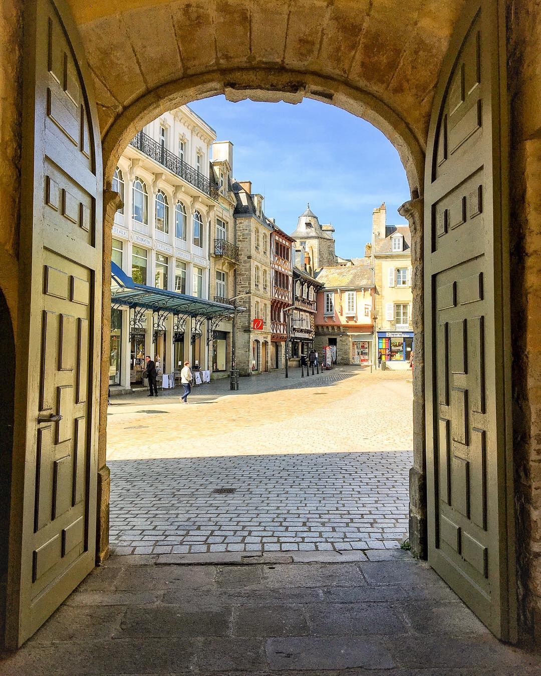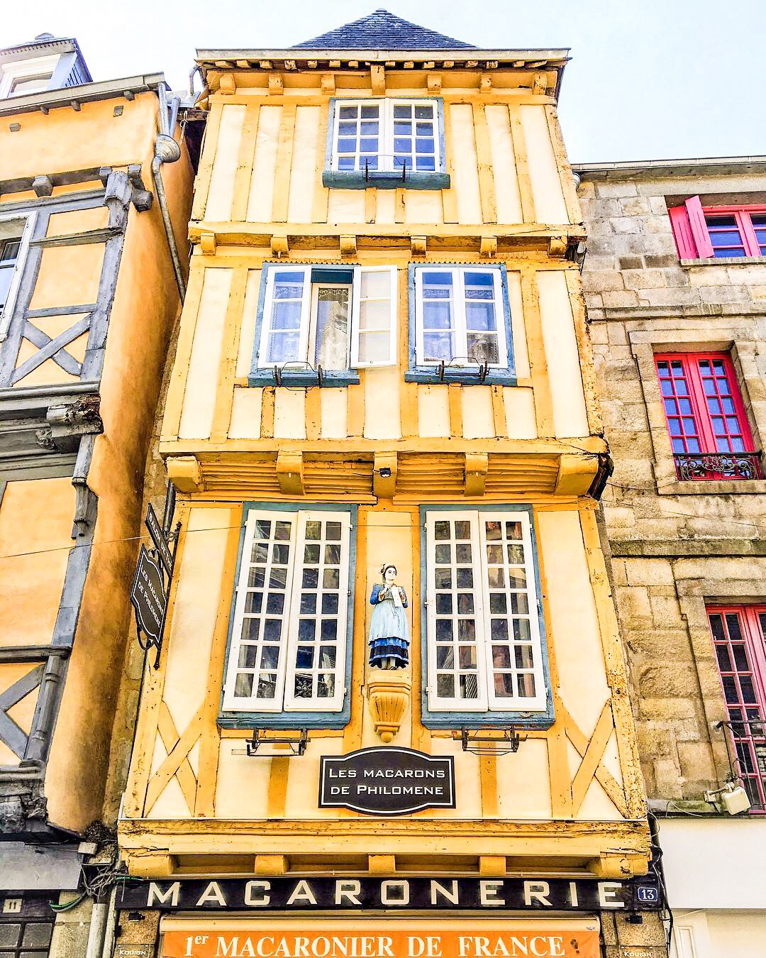Petit buffet copieux à notre bel hôtel et départ vers la capitale de la Cornouaille, Quimper, pour rejoindre Jean-Luc qui nous fait découvrir sa ville. Je l’avais aussi visité l’an dernier mais revenir dans cette ville mythique me fait toujours plaisir. On prend la température de l’ambiance festive qui règne ici pour le Festival de la Cornouaille 2018 mettant en avant toute la culture bretonne ! Pris dans le défilé celtique de cornemuse et de déguisements locaux, drapeaux étendus un peu partout, on repasse devant certains points d’intérêt comme les Halles où sont vendus des produits locaux et de saison, le 1er macaronier de France ou encore la Basilique-Eglise Saint-Corentin dont l’intérieur m’a frappé pour son air de Sagrada Familia. On croise des maisons à colombages, de granit et on essaye de comprendre pourquoi certaines sont bâties avec une sorte d’avancée à l’étage supérieur. Cela est dû au fait qu’auparavant, on ne payait les impôts au m2 que sur l’étage inférieur, ainsi la surface du supérieur pouvait être aussi large que désirée.