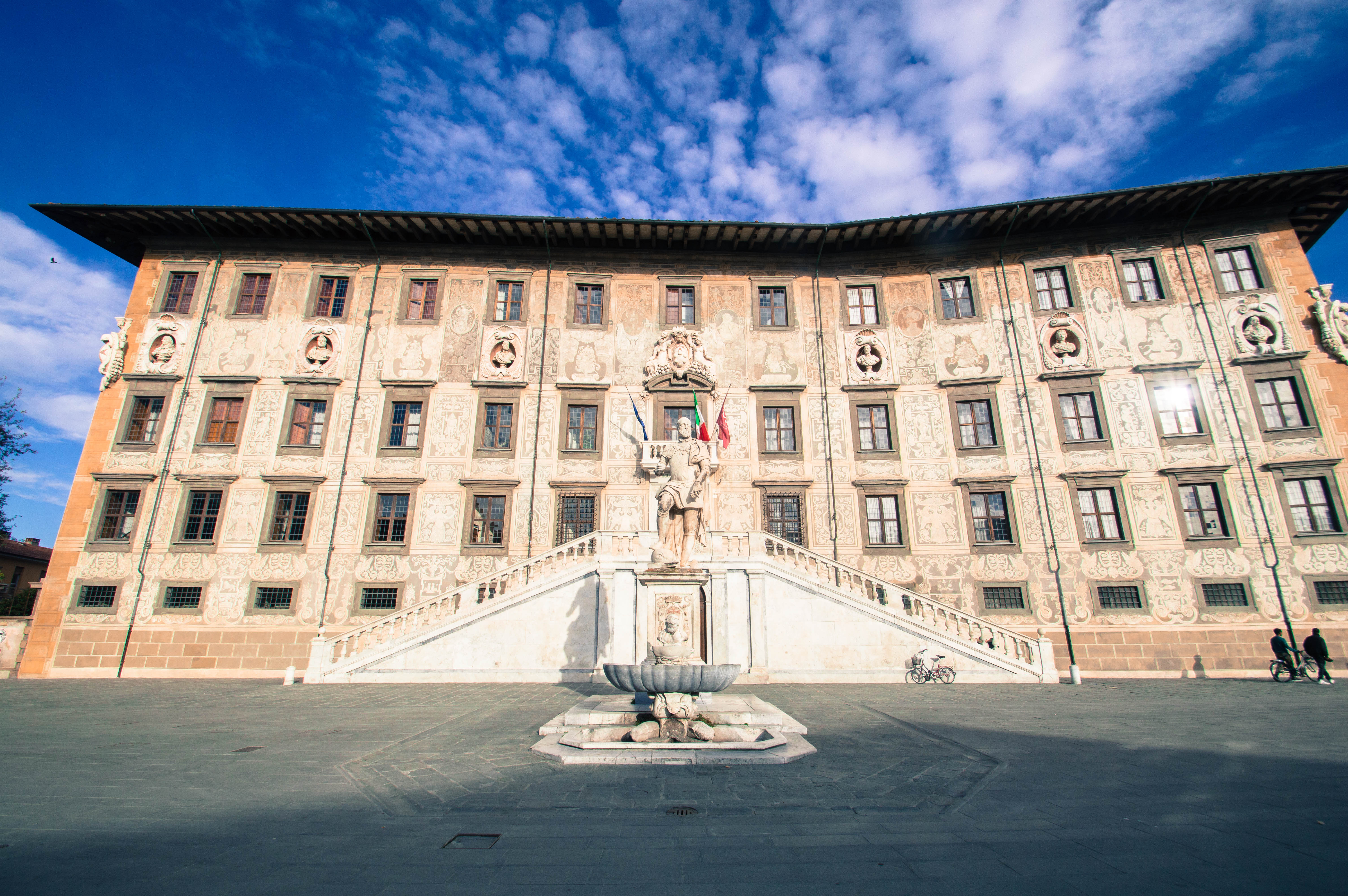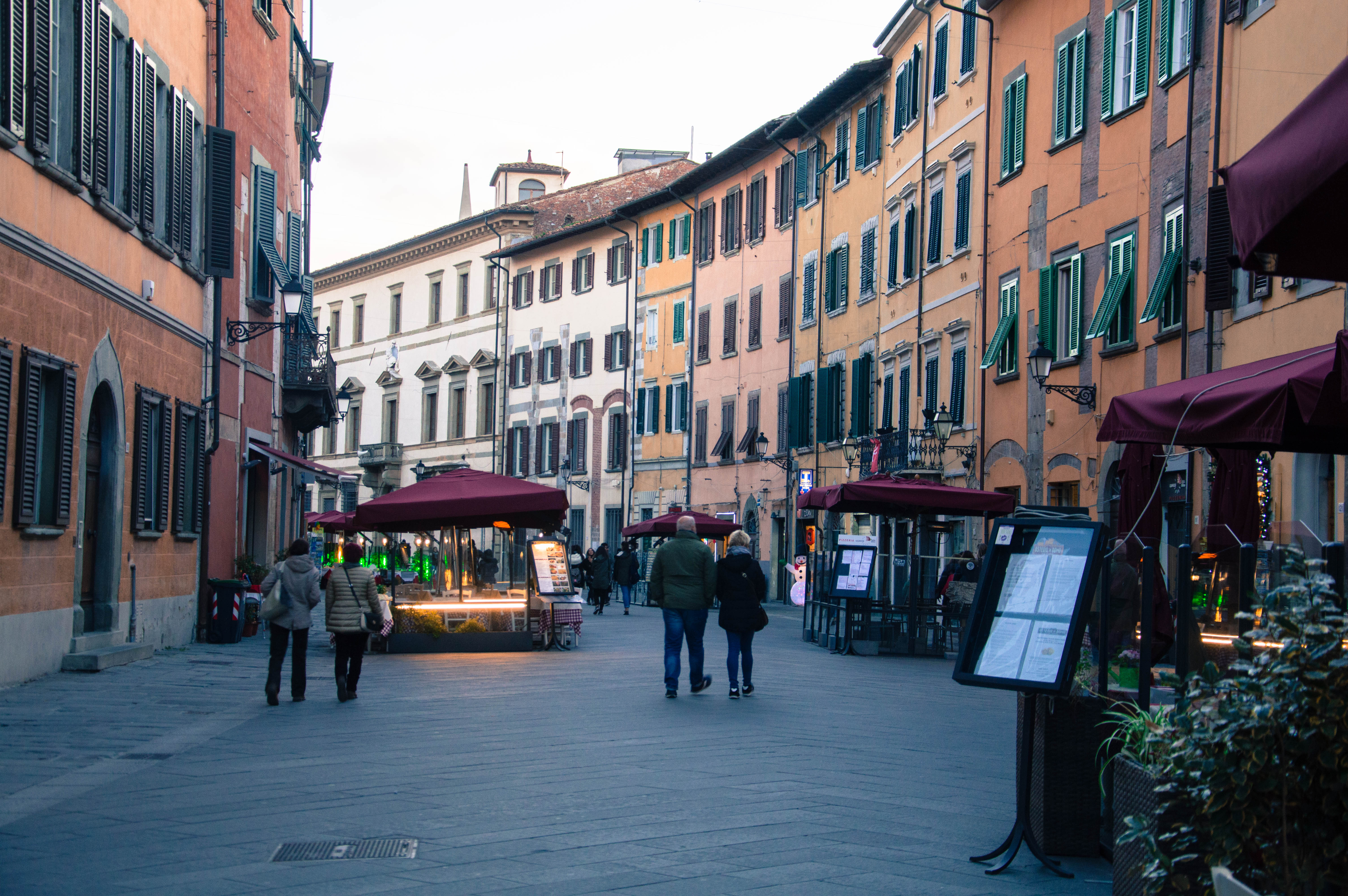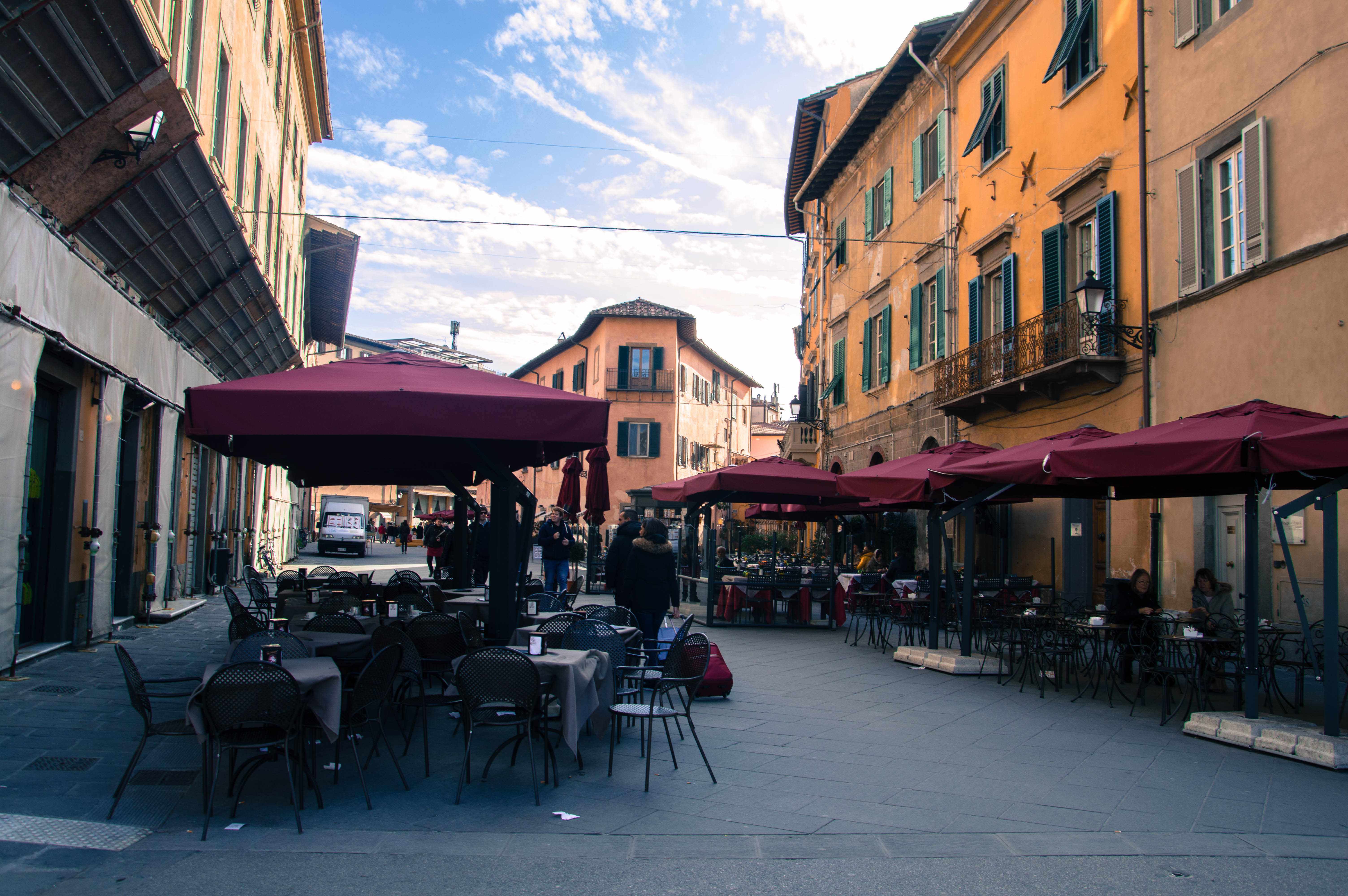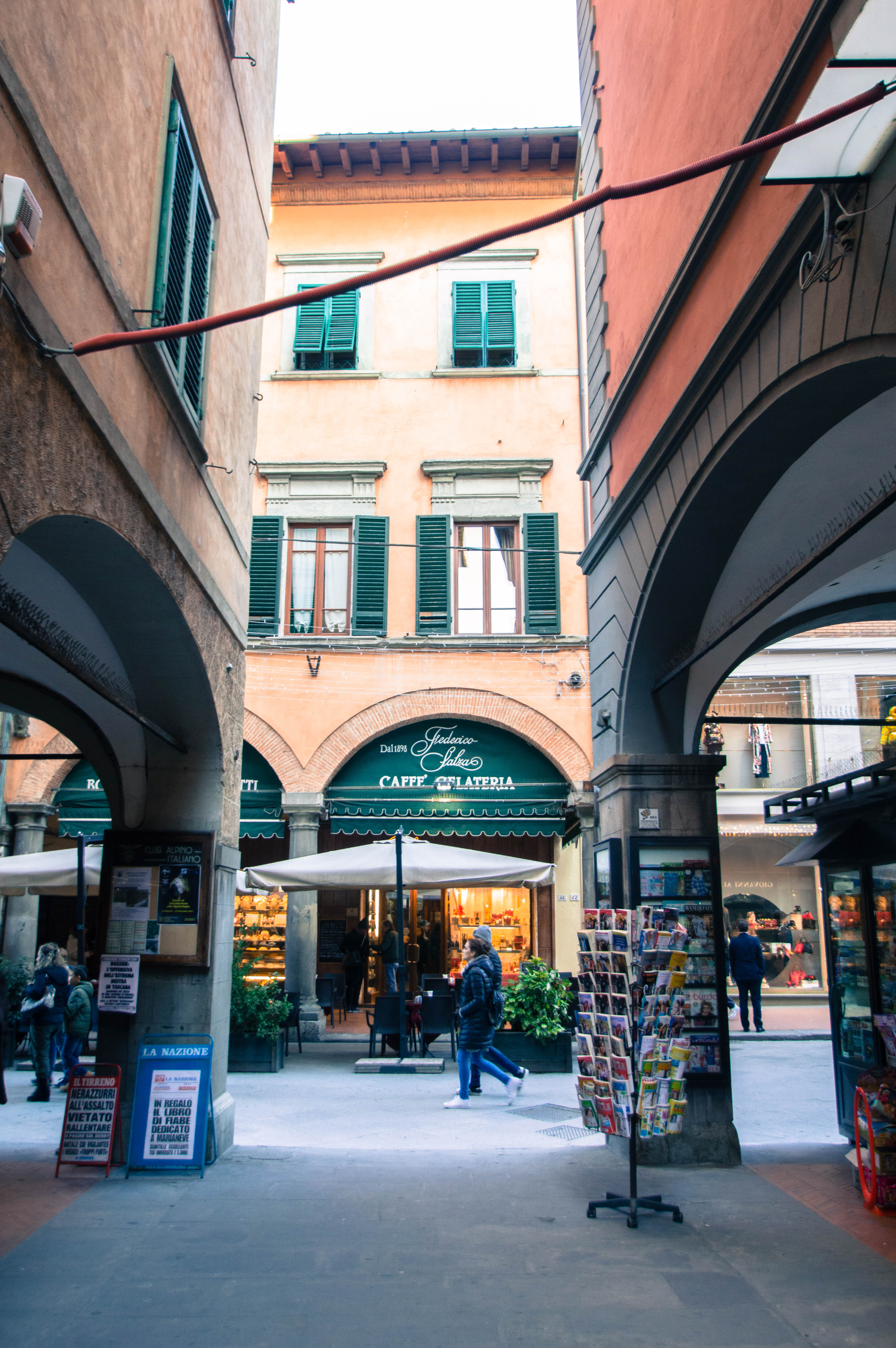 Notre arrivée en Toscane s’est faite sous le soleil à 8h30 du matin. Au sortir de la gare, depuis la Piazza della Stazione, nous enclenchons notre découverte de Pise sans perdre un instant. Nous empruntons la première rue qui s’offre à nous et qui nous mène à la Piazza Vittorio Emanuele II. La ville s’éveille, les marchés de Noël s’installent. La rue principale commerçante de Corso Italia est encore déserte et les rayons du soleil viennent titiller les décorations ainsi que les façades des immeubles.