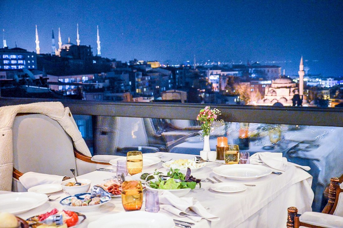 L’hôtel SURA dispose de deux bâtiments, l’un avec la piscine et le Spa, l’autre avec le restaurant et la terrasse. D’ailleurs, nous prévoyons un petit-déjeuner sur ce rooftop en espérant ne pas voir la pluie venir. Une des meilleures vues panoramiques sur la ville, ses alentours, et surtout sur le duo Sainte-Sophie/Mosquée Bleue, le Bosphore, les bateaux et la mer au loin.