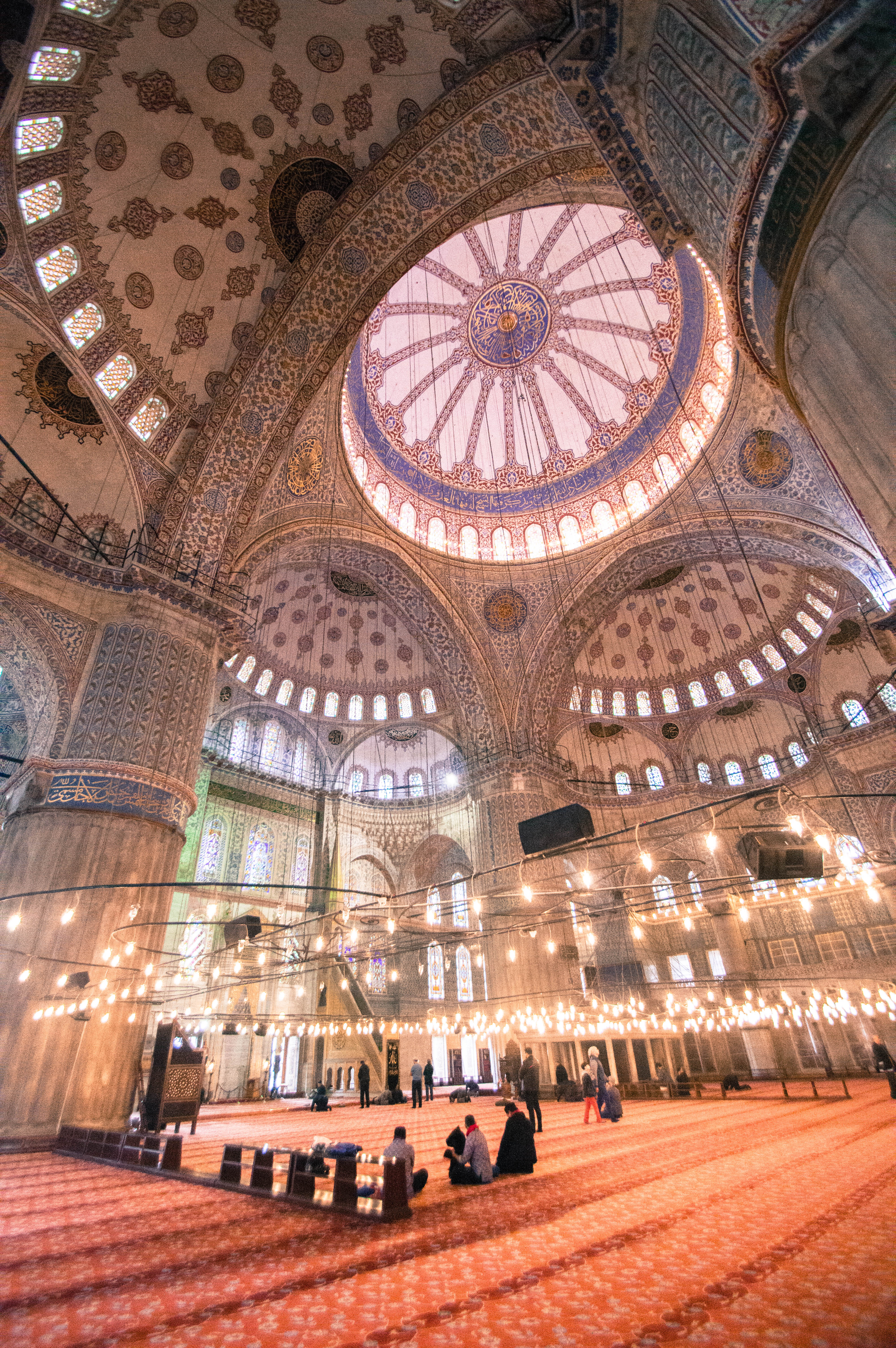 2. La Mosquée Bleue. Rien qu’au nom, elle fait rêver. Dominante et impressionnante, celle qui fait face à Sainte-Sophie et a été construite comme sa rivale, est ornée de 20 000 carreaux de faïence céramique bleue d’Iznik en son intérieur. Depuis l’immense cour d’entrée, on aperçoit ses 6 minarets. Pour pénétrer à l’intérieur, il faut enlever ses chaussures, des sacs sont mis à disposition afin de les garder à la main pendant la visite.