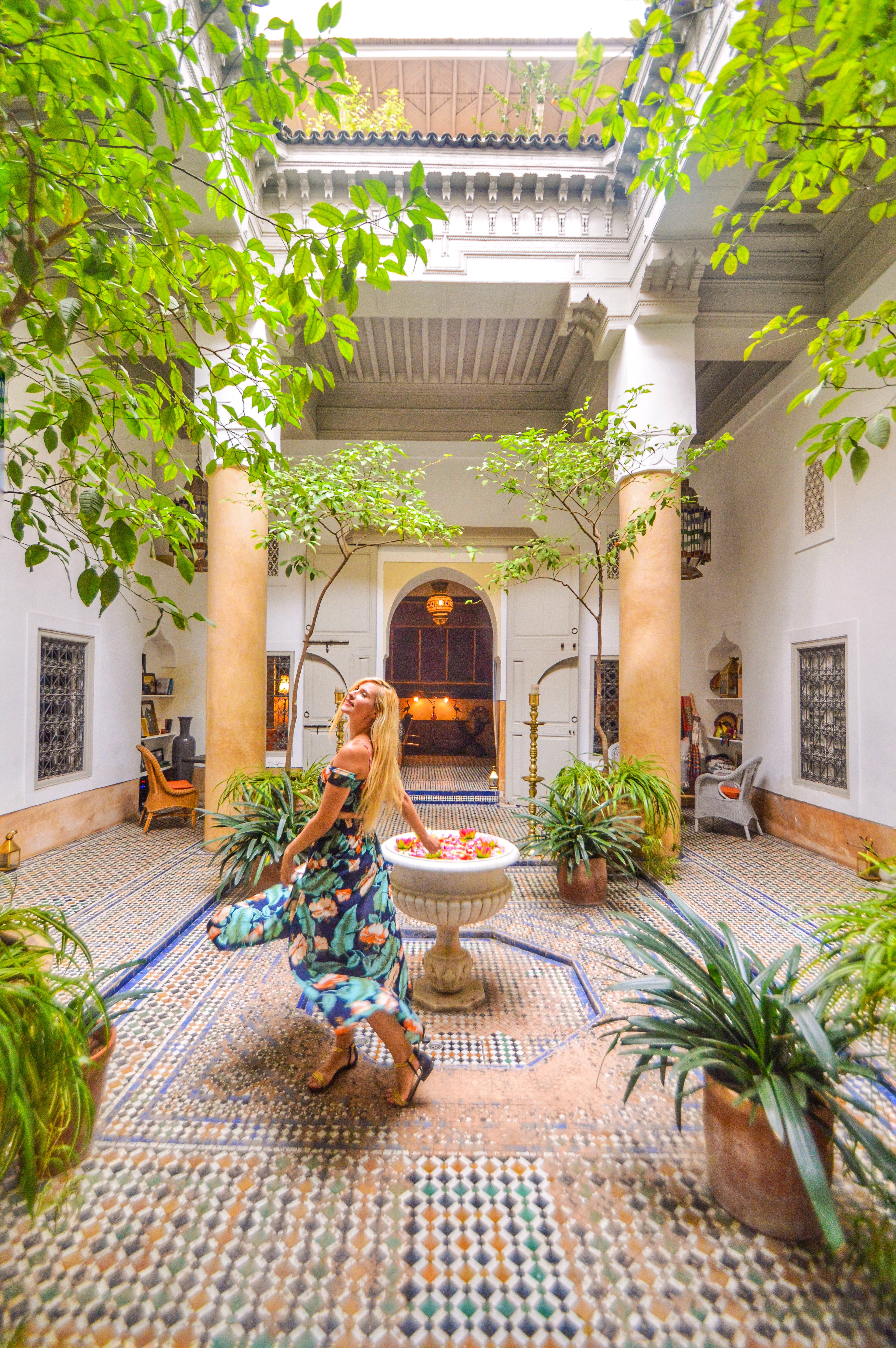 Ici, ce n’est pas le moderne qui prime mais l’authenticité, voilà pourquoi vous ne trouverez par exemple pas de piscine dans la cour intérieure. L’authenticité marocaine est partout, aussi bien dans les jolies pièces de l’artisanat local entreposées dans les chambres que dans la vaisselle de cuisine qui sera servie aux repas mais surtout belle et bien présente dans le patio. Point central de la bâtisse, il a été construit de manière à ce que la lumière tombe parfaitement sur lui en sa fontaine en marbre, cernée de carreaux de céramique. Cette dernière ne vous rappelle d’ailleurs rien ? Si vous l’avez remarqué, elle a la particularité d’avoir le même architecte que le Palais de la Bahia et la même provenance de matériaux, d’où sa ressemblance.