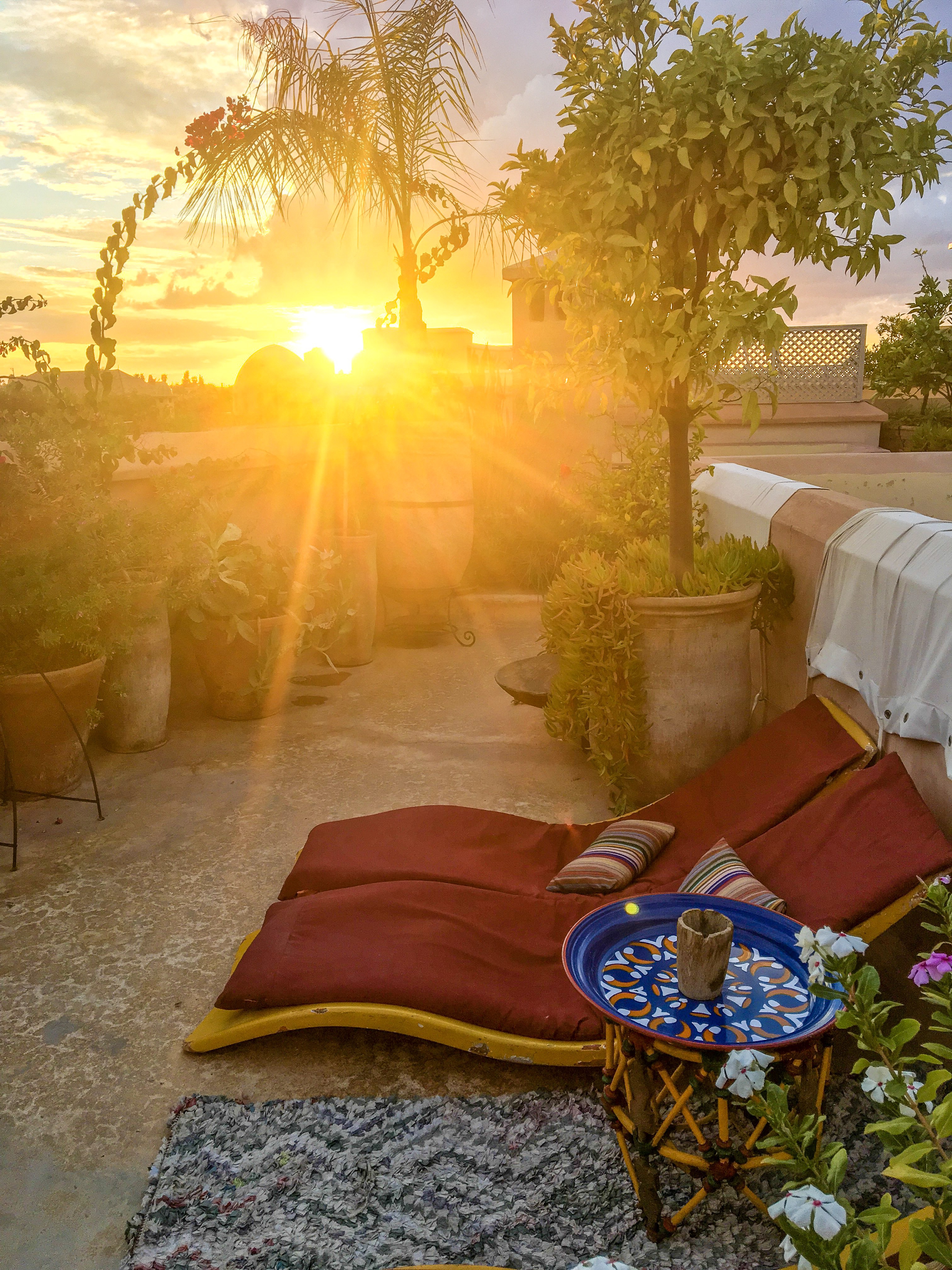 On finit en beauté avec la terrasse et sa vue panoramique sur Marrakech, façon Aladdin. On peut y apercevoir de près la Mosquée Ben Youssef, le Musée de Marrakech et au loin le minaret de la Koutoubia et les Montagnes de l’Atlas. La voici sous les différentes versions de la journée.