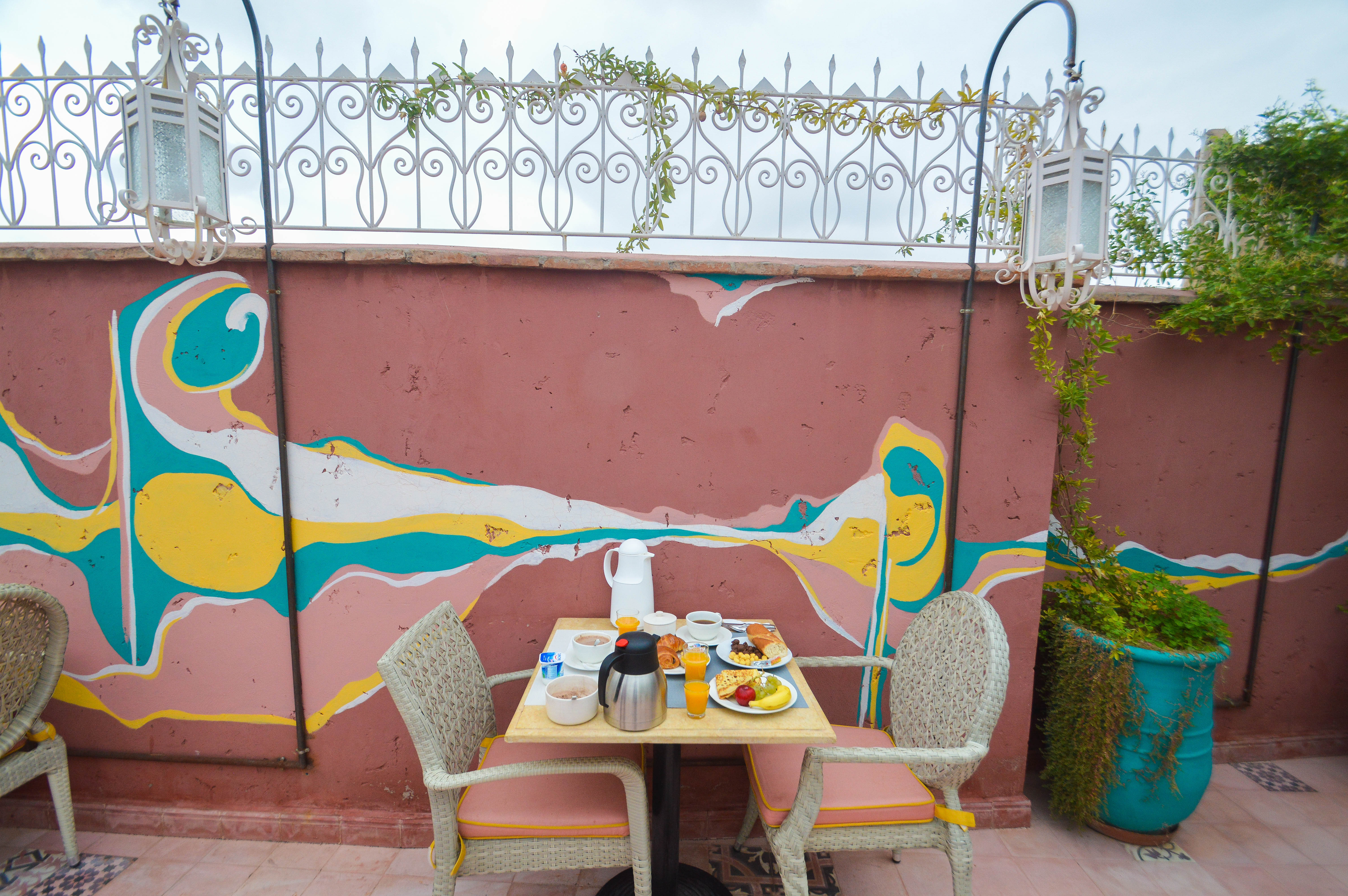 Les mets et boissons sont à déguster tout au long de la journée, par exemple un thé menthe avec ses petits gâteaux traditionnels marocains, une petite corne de gazelle ? Tout en sachant que tous les jours déjà une petite gourmandise est offerte chaque jour en chambre. Que d’attentions dans ce riad 🙂