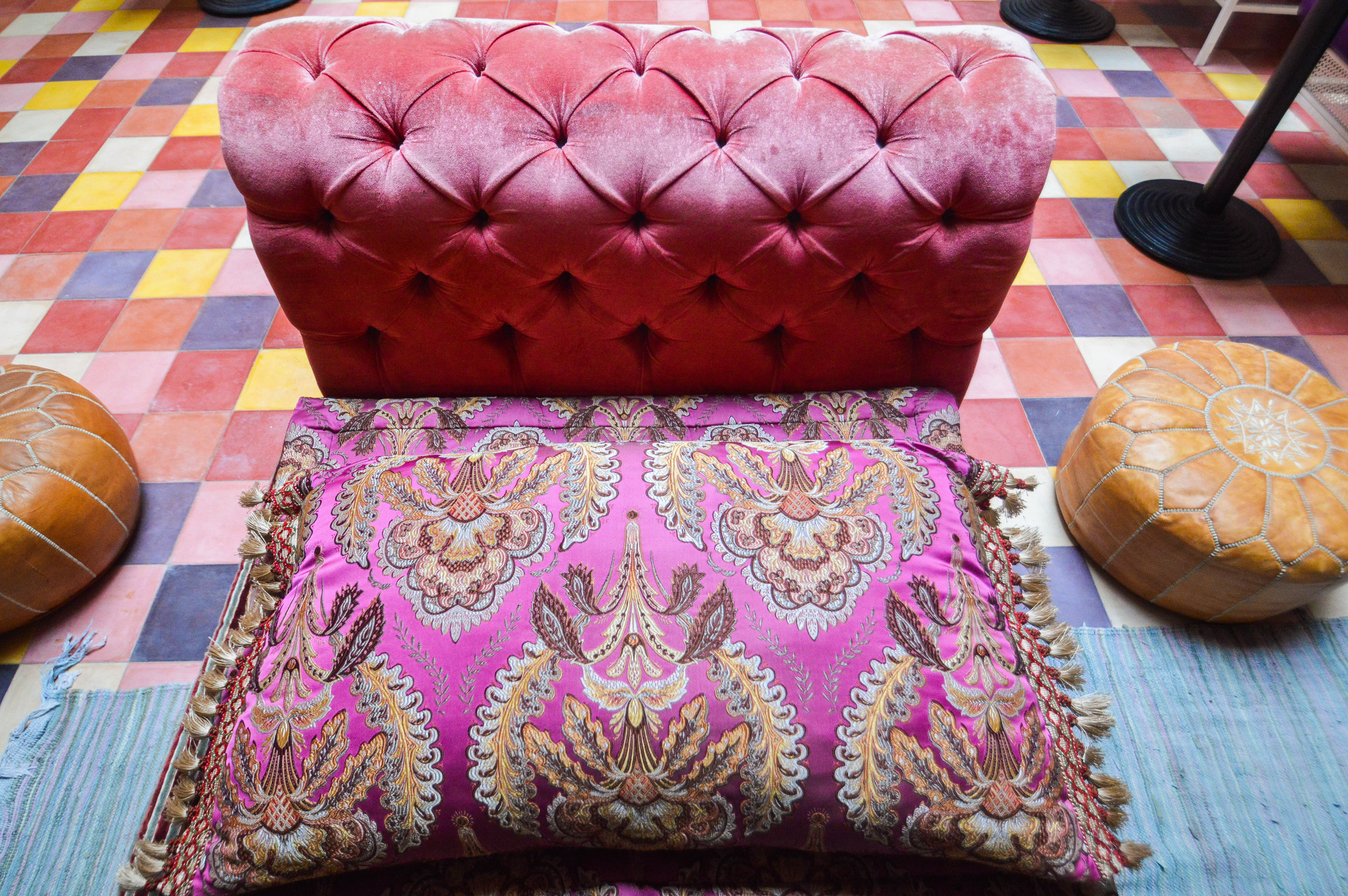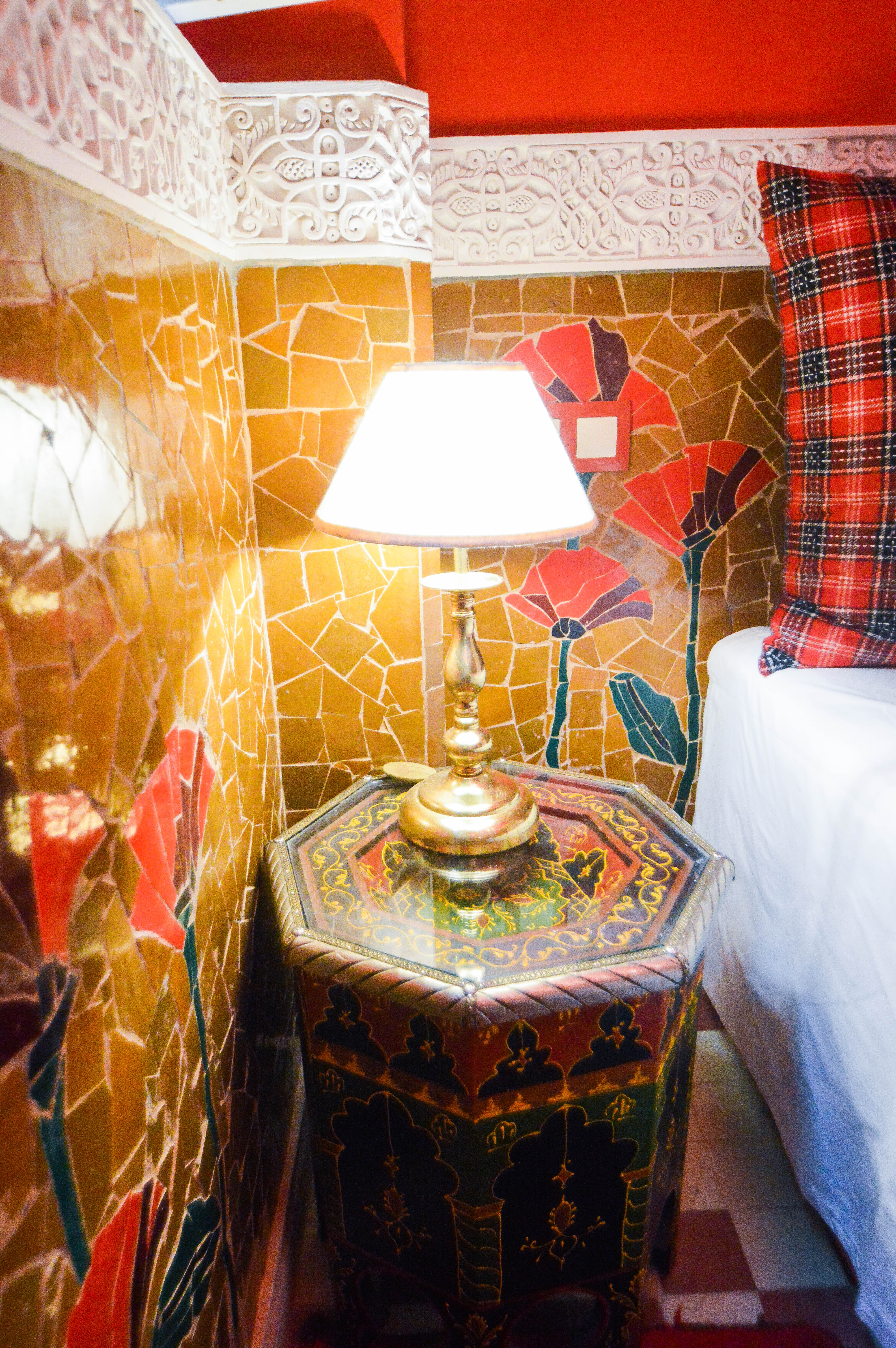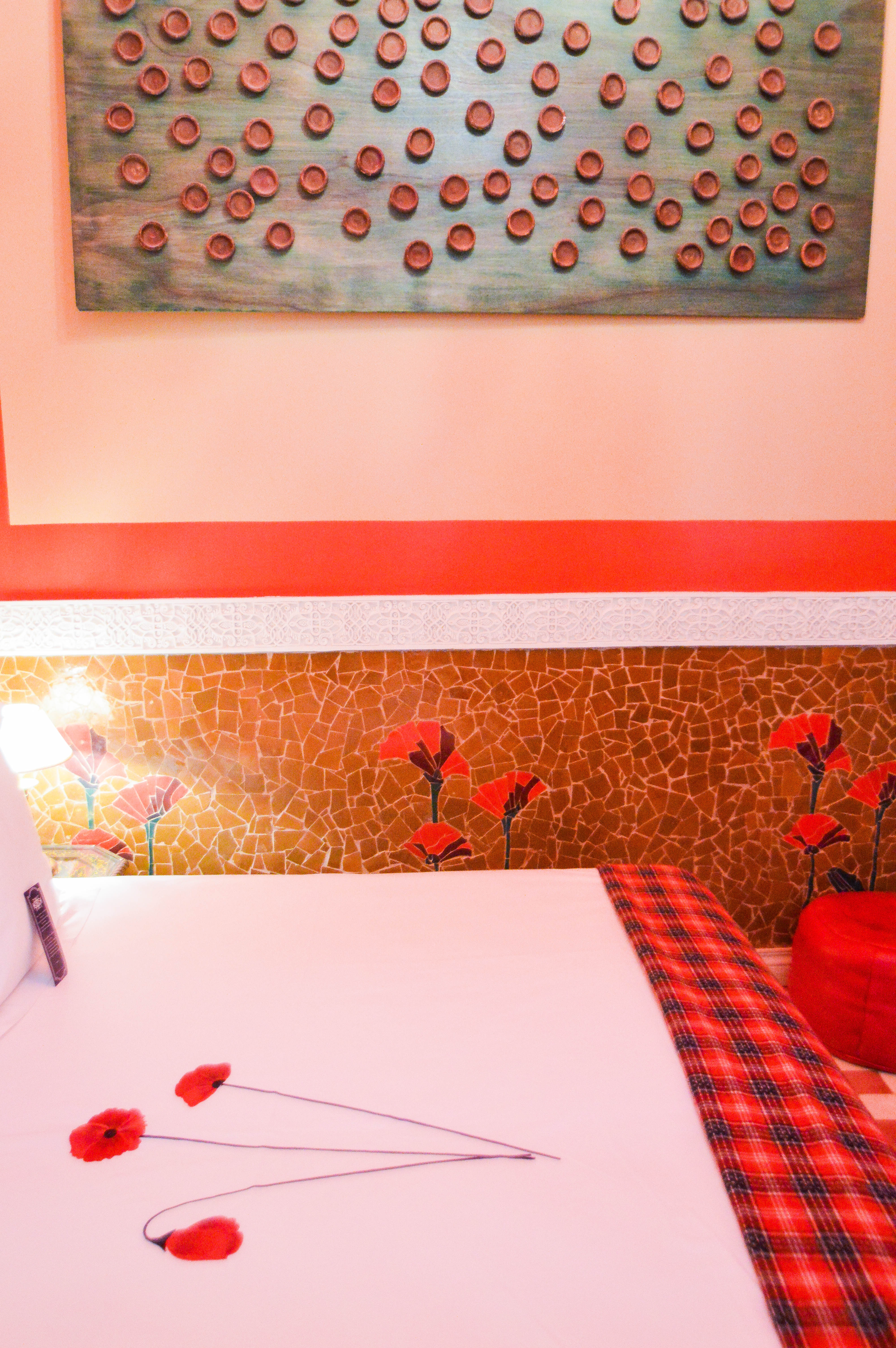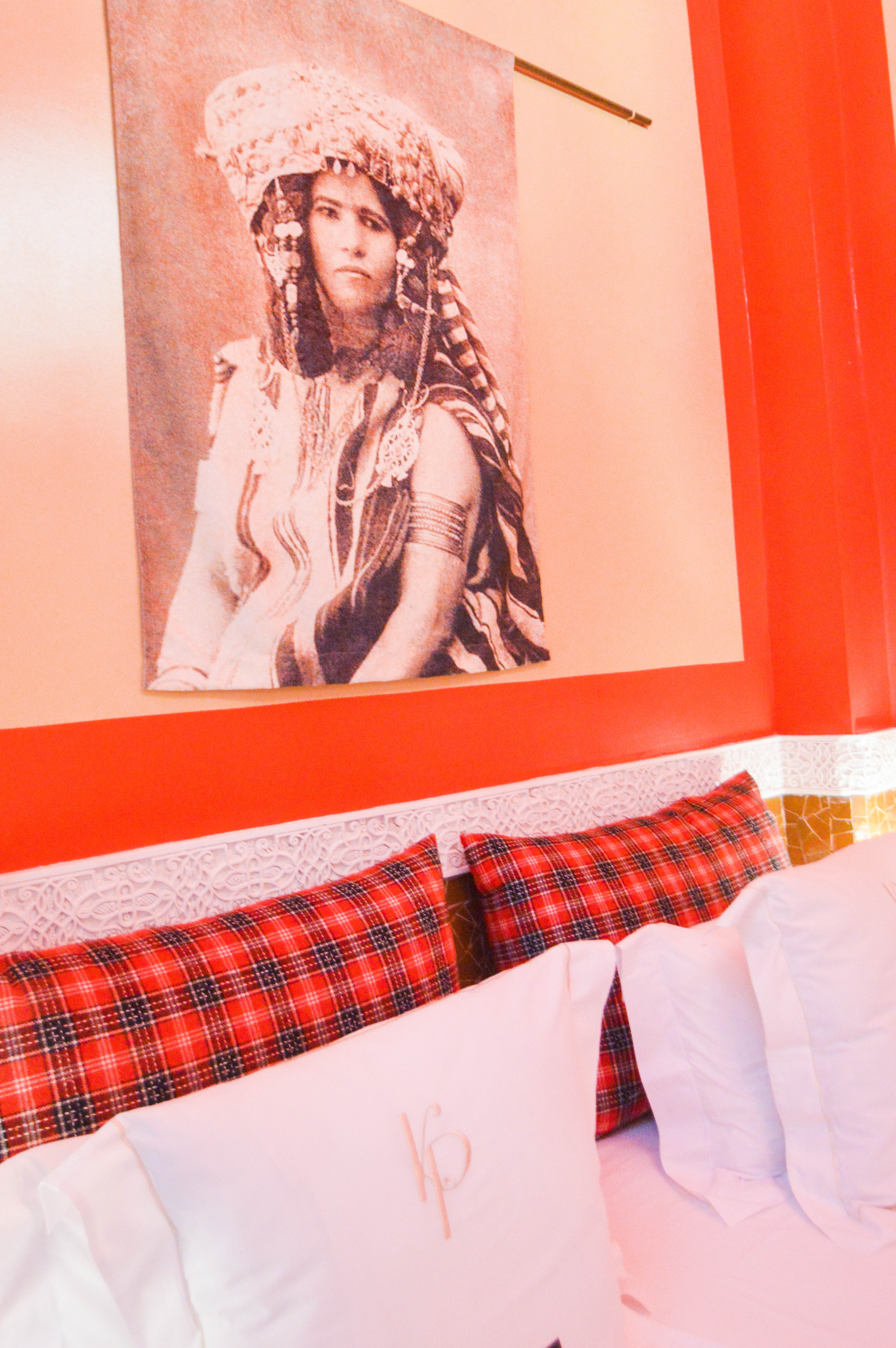 Troisième et dernière découverte au rez-de-chaussée avec vue directe sur le patio jardin, nous déboulons dans une explosion de couleur vive ! Cela ne cesse plus de nous étonner car après de la blancheur et de l’or, nous arrivons dans un champ de coquelicots. Les sous-bassements en zelliges « fassi » taillés à la main ont été faits sur mesure et représentent les gerbes de coquelicots de l’Atlas. Harmonie des couleurs au sol et aux murs et écossais sur les coussins et le couvre-lit. En termes de décoration, calligraphie florale et art abstrait avec les rouges à lèvres berbères qui sont de petits plats de terre faits avec des pétales de coquelicots.