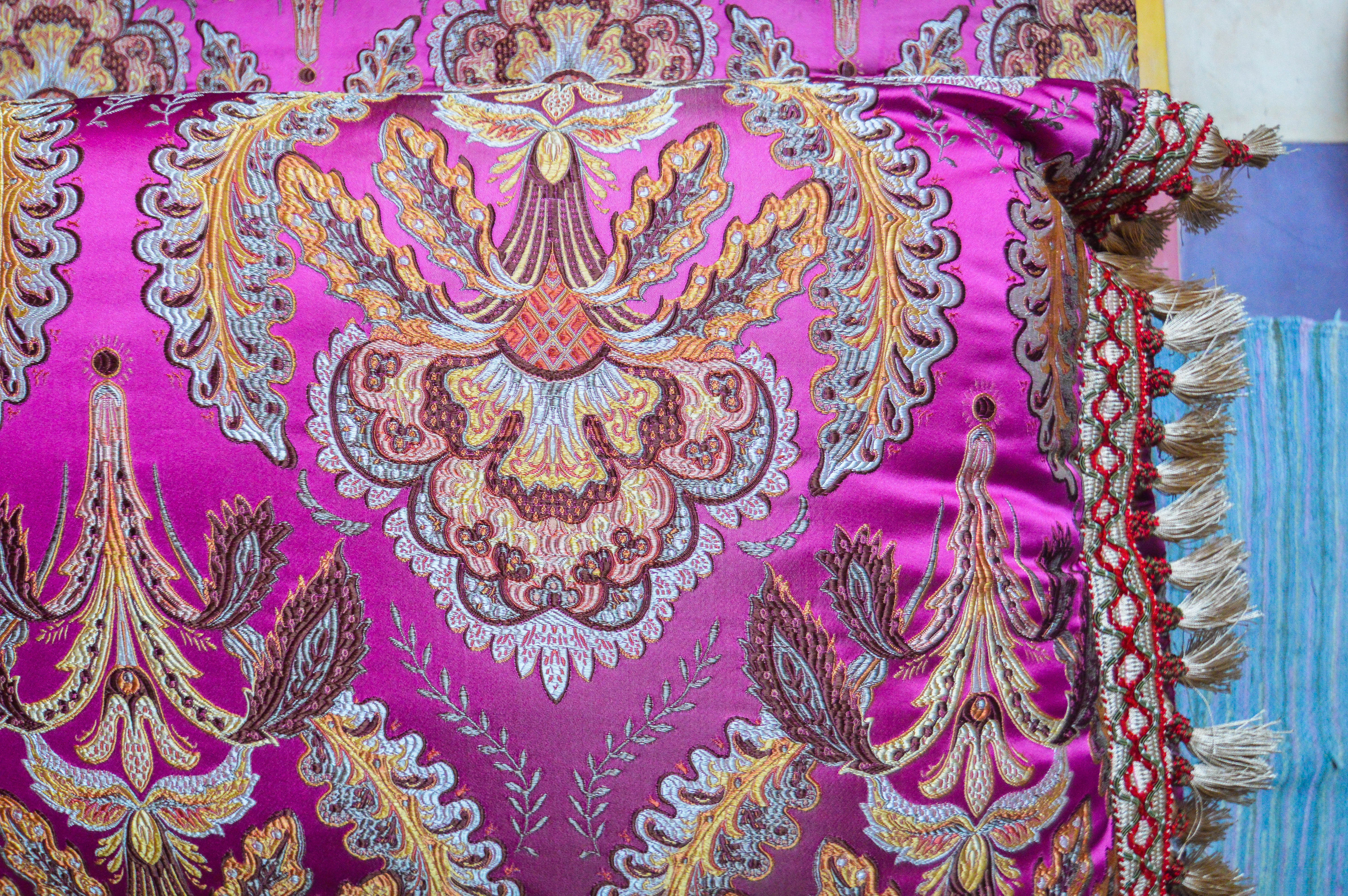 Egalement ouverte sur le patio jardin, cette Suite est celle où j’ai séjourné. Suite pour 3 personnes avec un lit double pouvant être décomposé en lits simples et un autre se trouvant en haut dans la mezzanine en grille de slimania couleur or. Tous les sous-bassements sont en tissus de Caftan, brodés dans des teintes jaune, mordoré, vert et pourpre. Cette décoration simple et monochrome valorise la chaleur du brocart. Le lustre à pampilles et les chevets lumière ainsi que le grand cadre miroir mural au dessus du lit, confèrent un côté immense à l’espace de la pièce. Au mur, un Caftan de l’époque tissé de fils d’or est accroché.