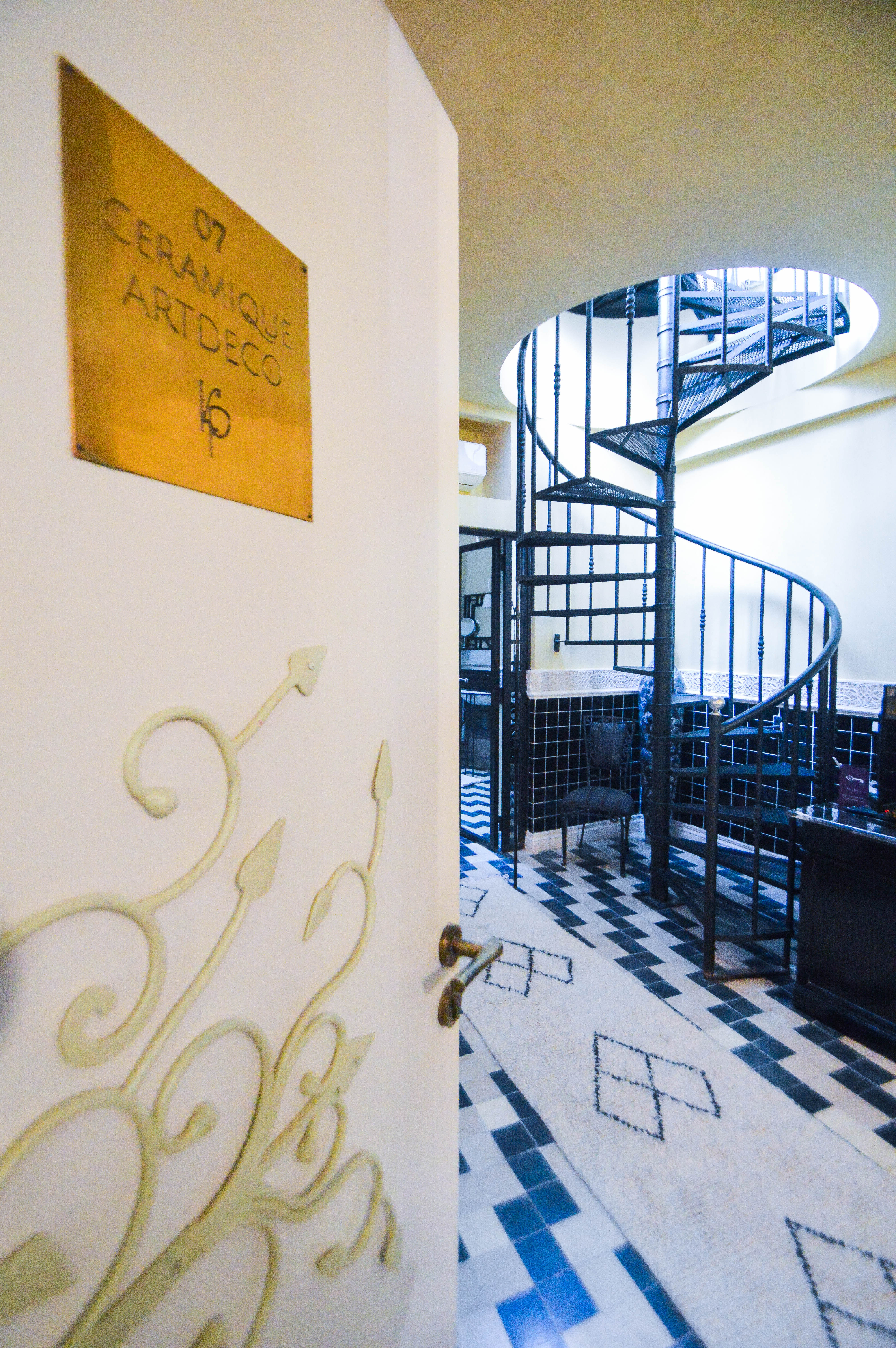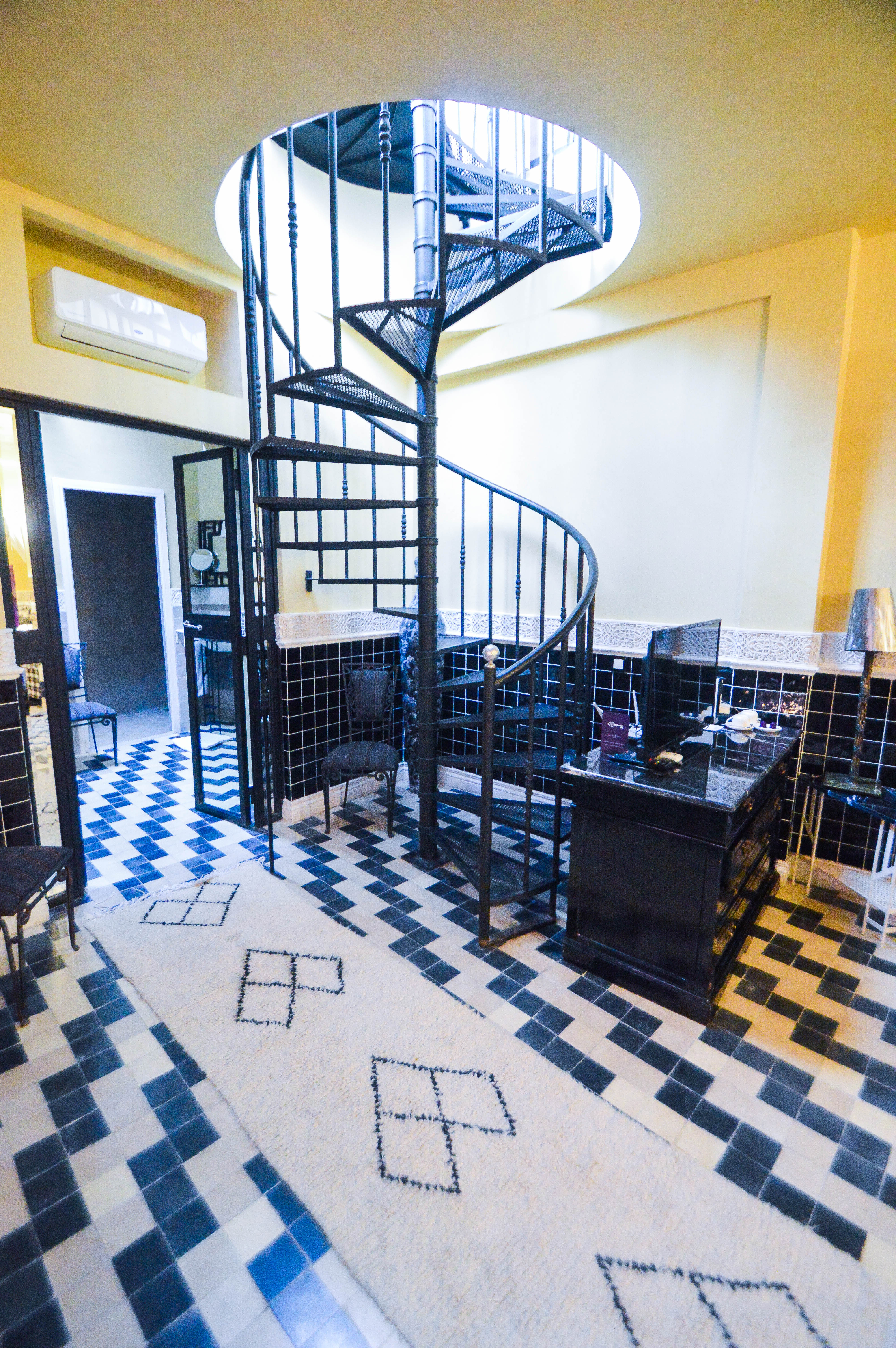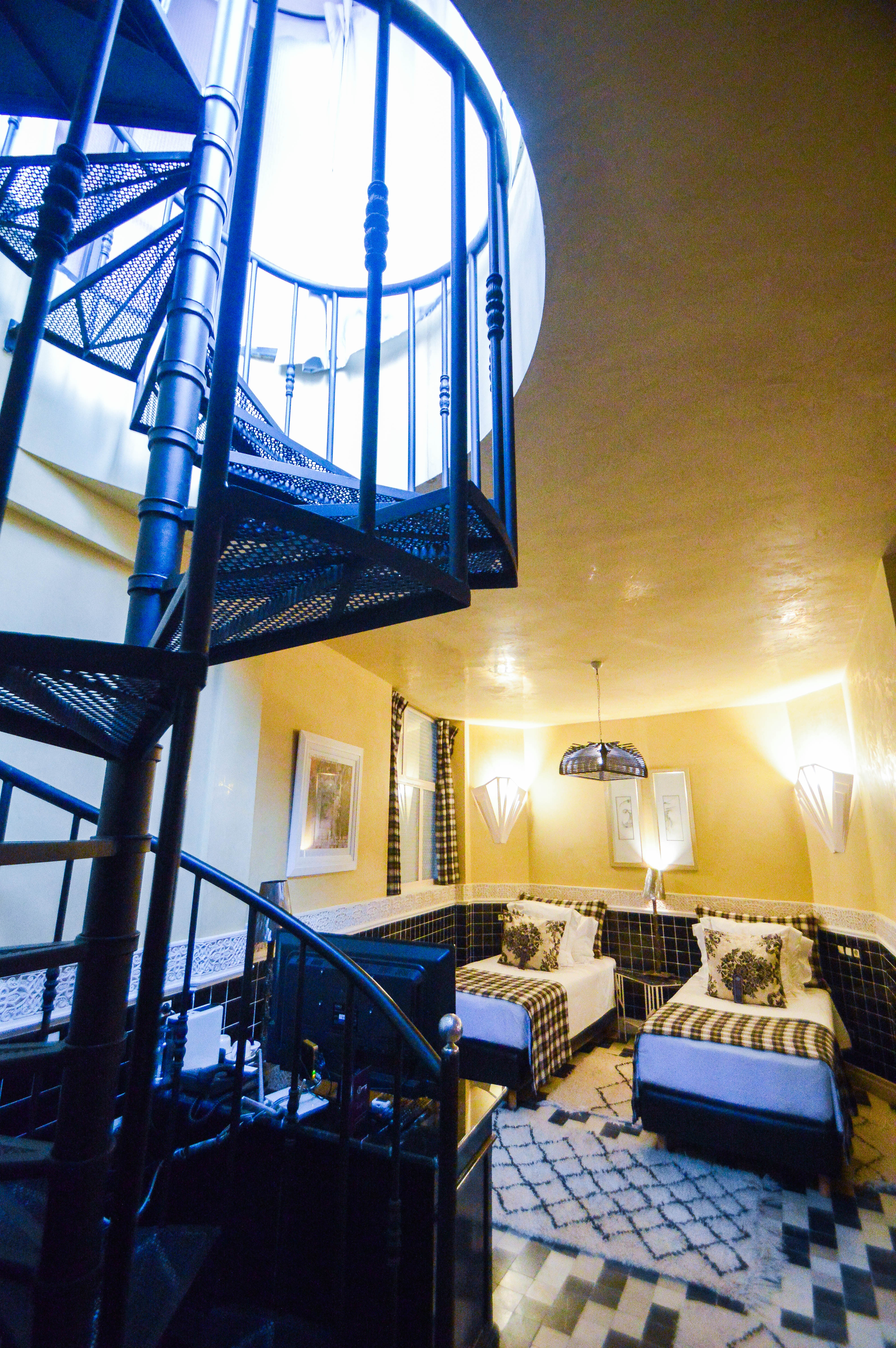 Tous les espaces du riad ont été esquissés et pensés avec précision. C’est ainsi que toutes les cloisons dans les espaces de vie ont été supprimées pour laisser entrer la luminosité naturelle ensoleillée, remplacées par de la dentelle forgée comme on le voit sur cet escalier. On trouve aussi des jeux de miroirs, des camaïeux de sols aux couleurs de l’arc-en-ciel et dans chaque chambre, un style différent et de grands moucharabiehs en bois blanc qui confèrent aux petites fenêtres typiques de plus larges ouvertures. Un réel talent pour casser les codes et sortir de l’ordinaire, on doit bien reconnaître l’originalité de cet assemblement qui crée la surprise à chaque pas tel un fil d’Ariane qui se déroule. Aucun détail n’a donc échappé à Marie pour créer le savoir-recevoir voulu par Joël dans le respect de la tradition marocaine mélangé au modernisme.