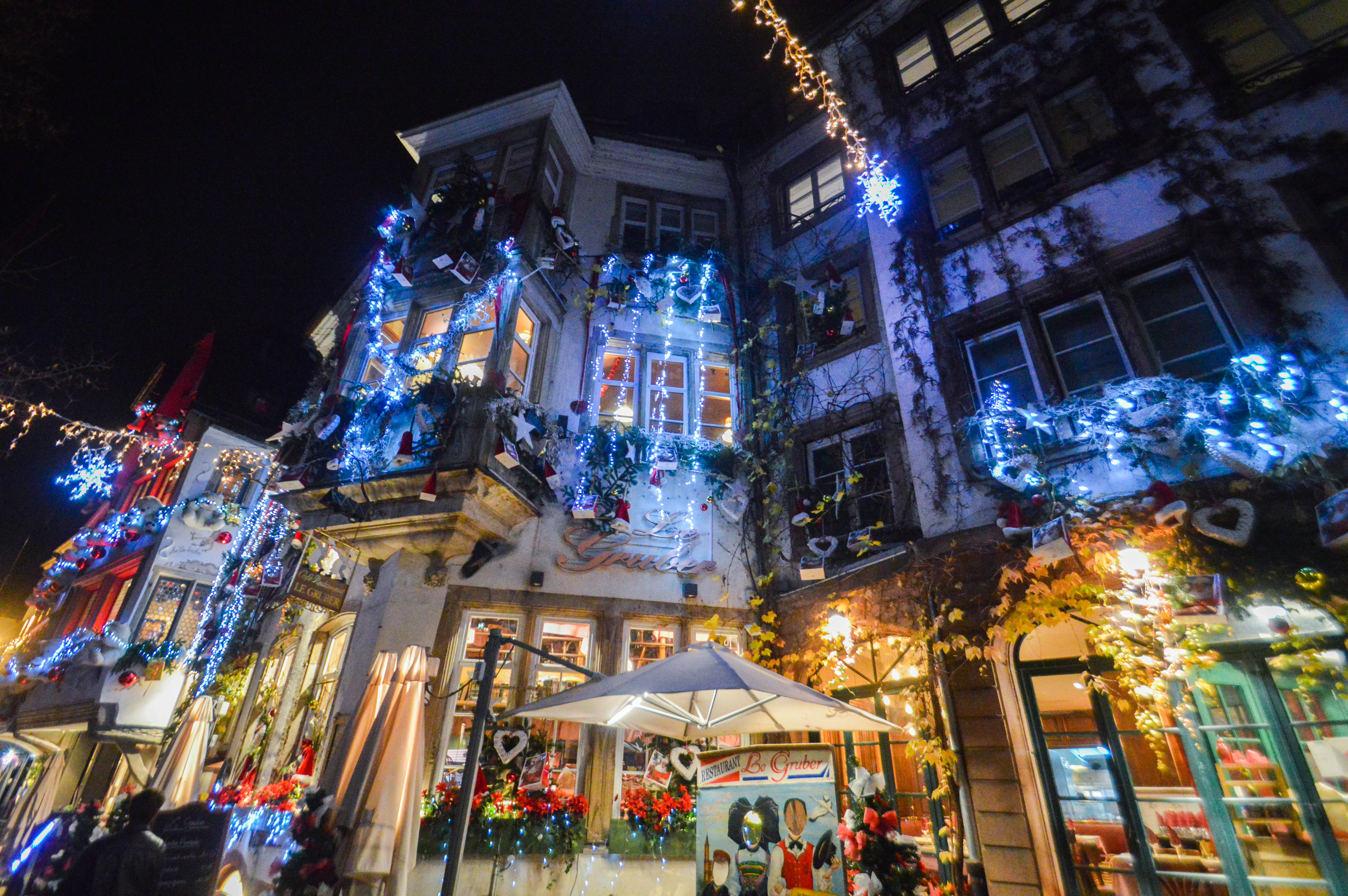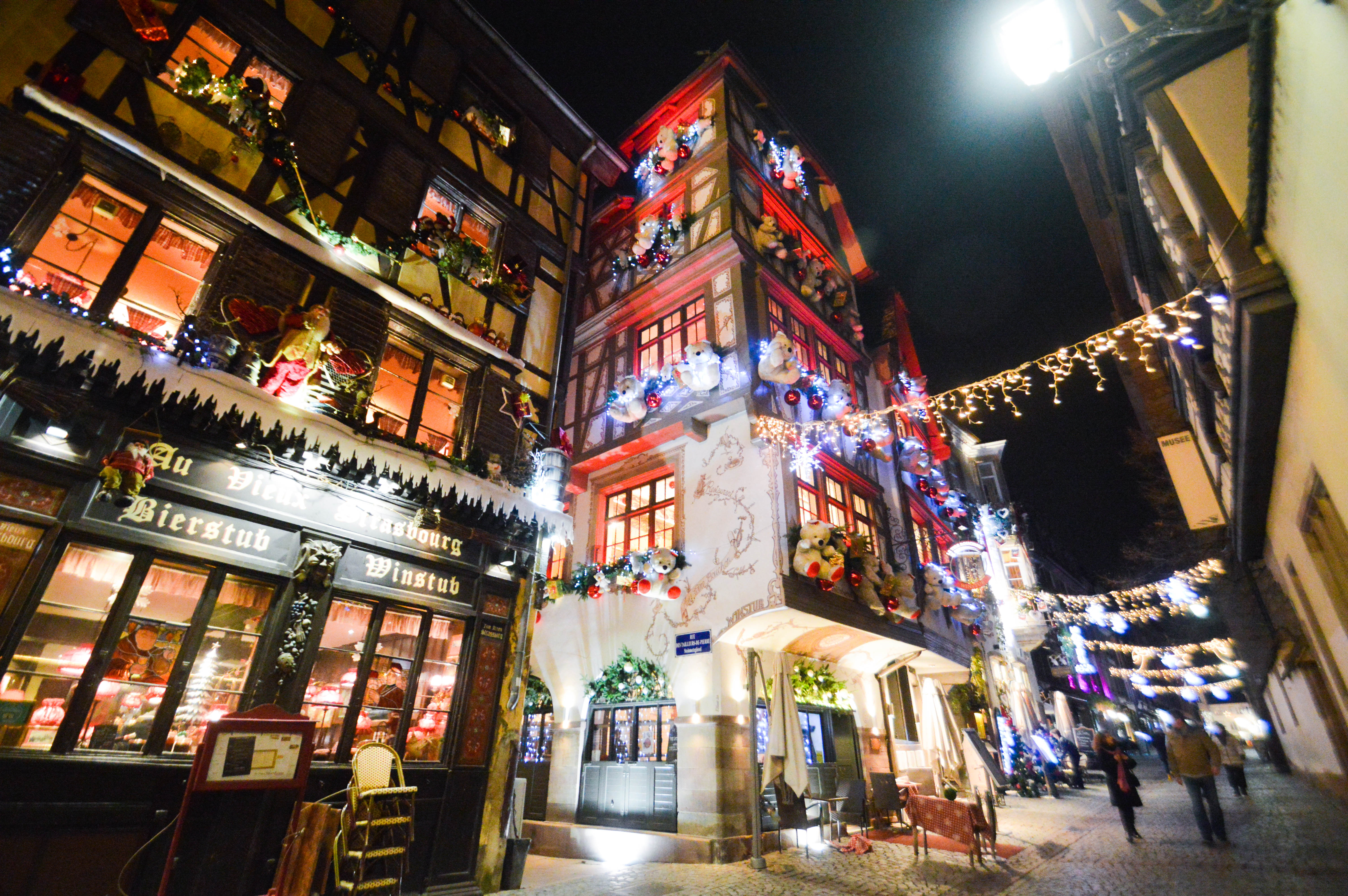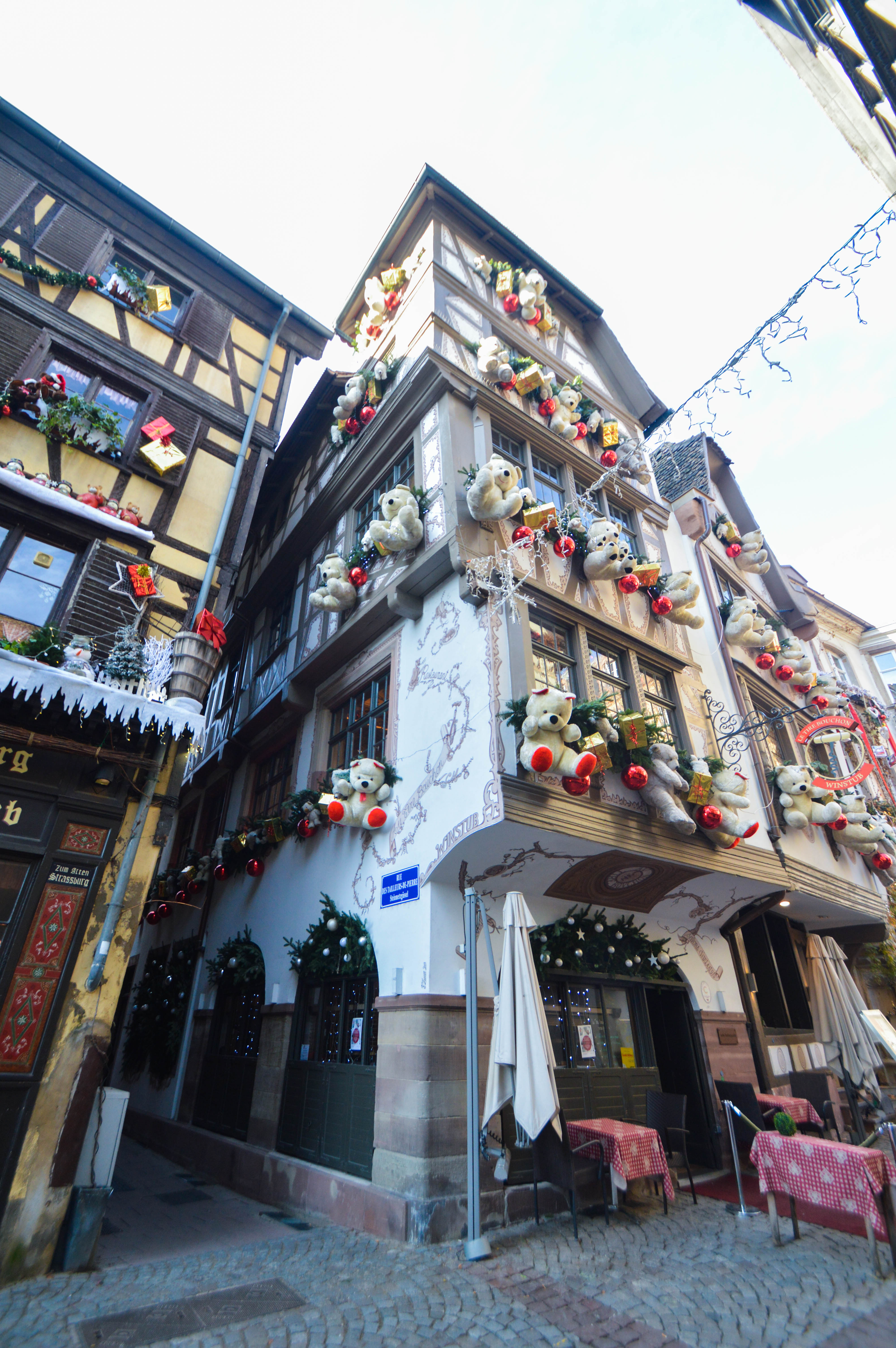 On commence avec la rue la plus prisée, la Rue du Maroquin. Au Vieux Strasbourg, Le Tire-Bouchon, Le Gruber, autant de façades de restaurants décorées avec le plus beau des excès, qu’il faut absolument voir. Des coeurs rouge vif, des cadeaux, des guirlandes en branches de sapins, des couronnes de houx, des nounours géants, des boules de Noël, tout ce petit monde qui égaye l’ambiance, on se régale les yeux et le coeur, c’est ça la magie !