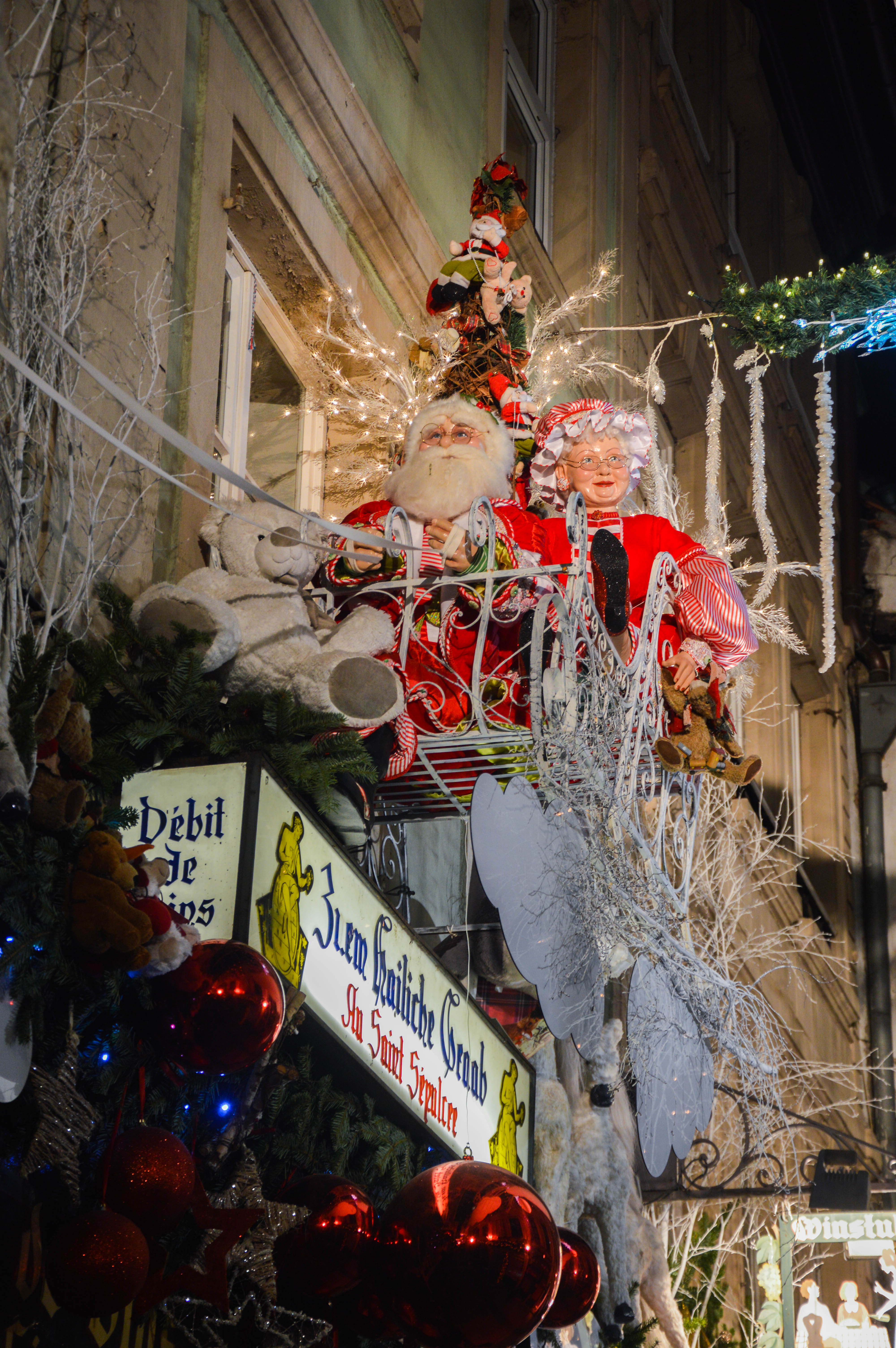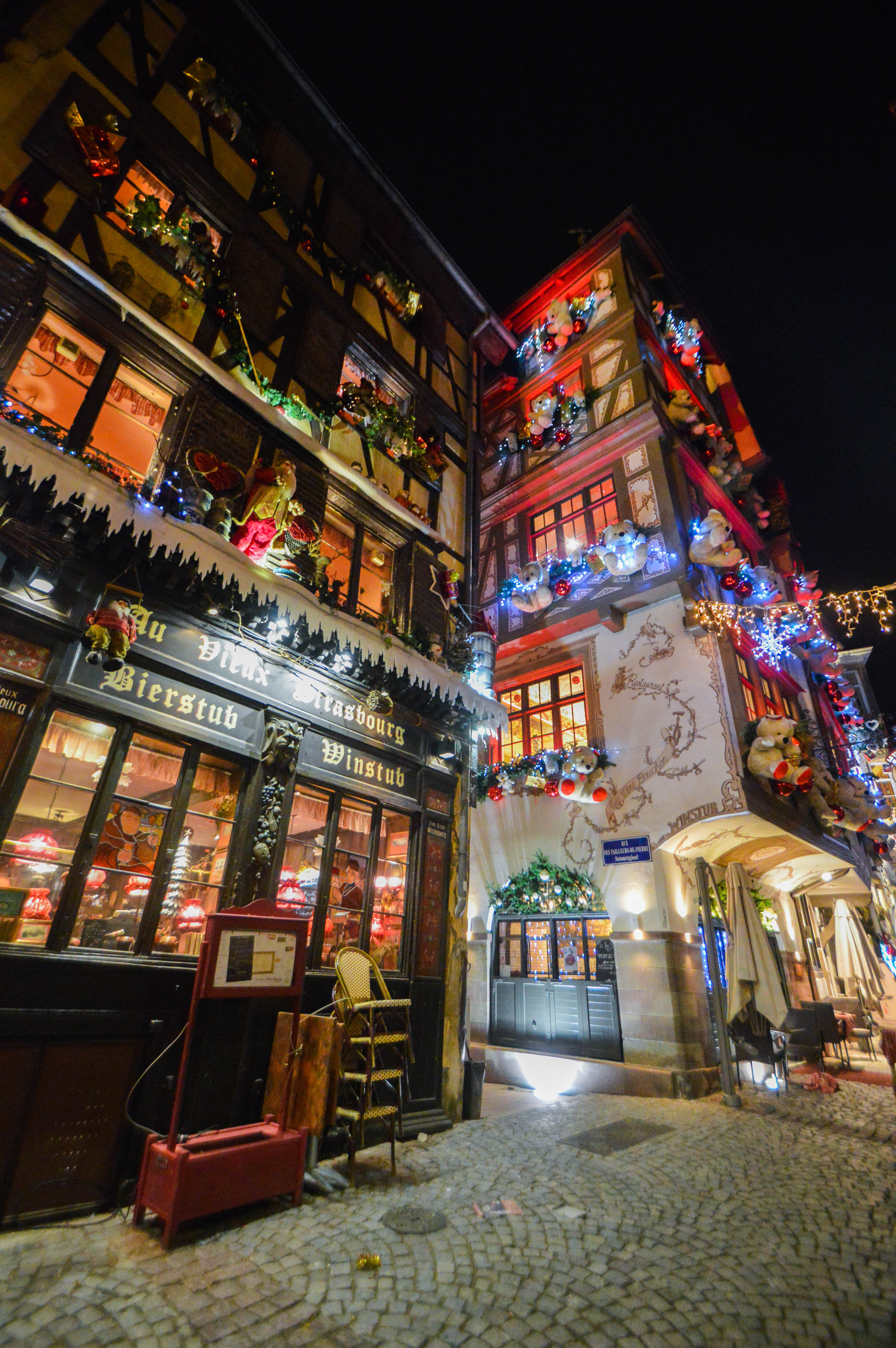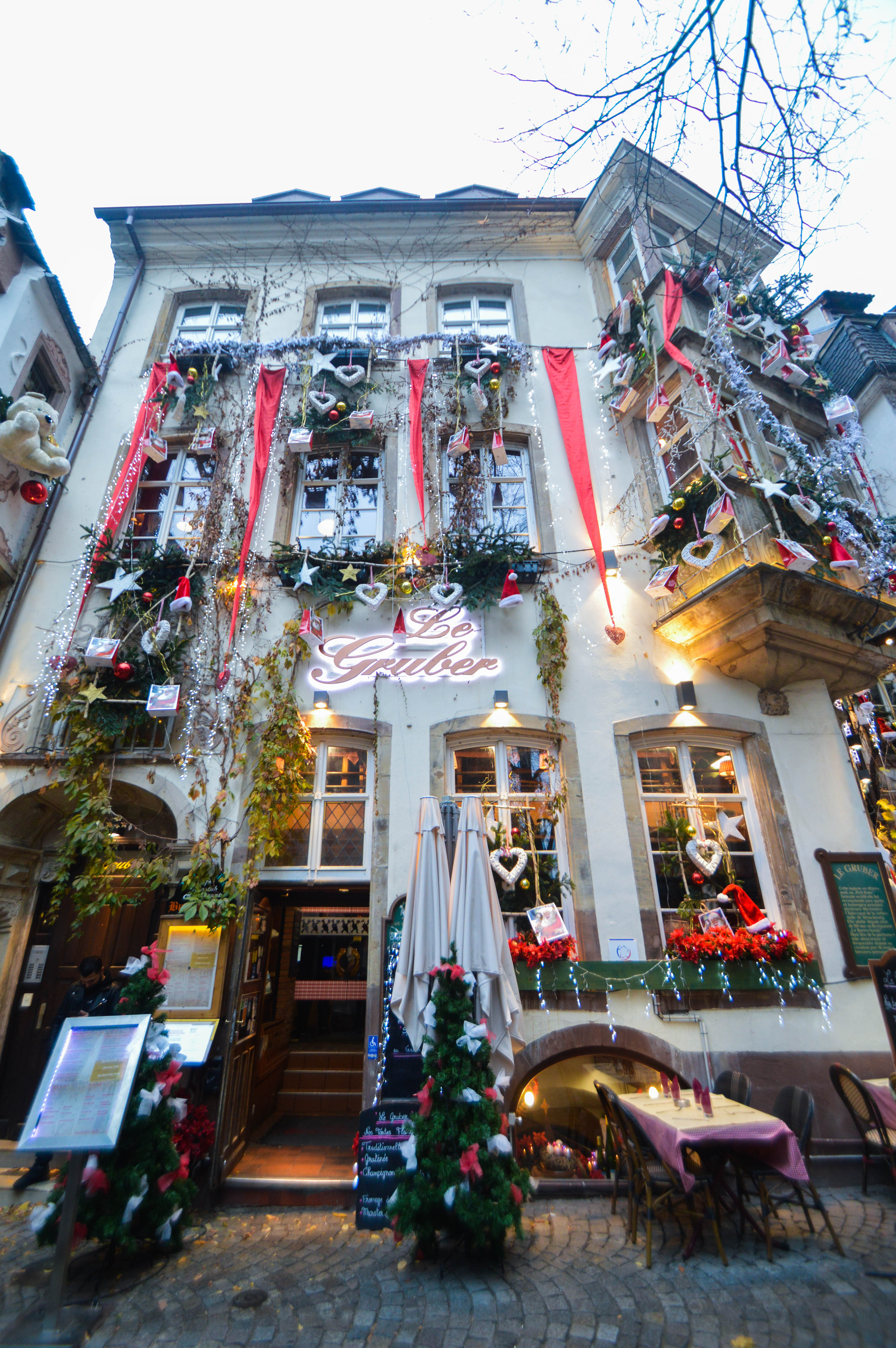 On commence avec la rue la plus prisée, la Rue du Maroquin. Au Vieux Strasbourg, Le Tire-Bouchon, Le Gruber, autant de façades de restaurants décorées avec le plus beau des excès, qu’il faut absolument voir. Des coeurs rouge vif, des cadeaux, des guirlandes en branches de sapins, des couronnes de houx, des nounours géants, des boules de Noël, tout ce petit monde qui égaye l’ambiance, on se régale les yeux et le coeur, c’est ça la magie !