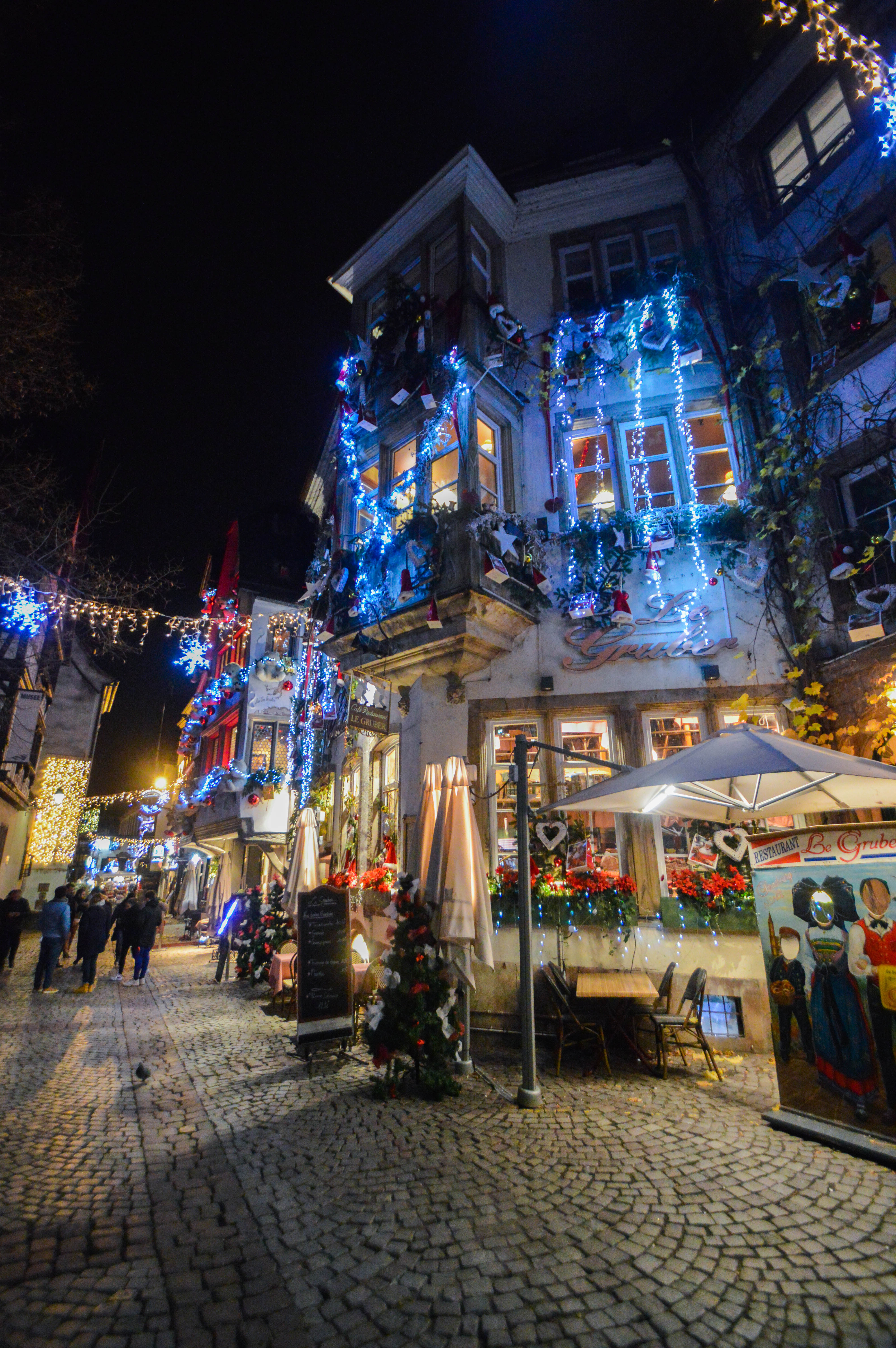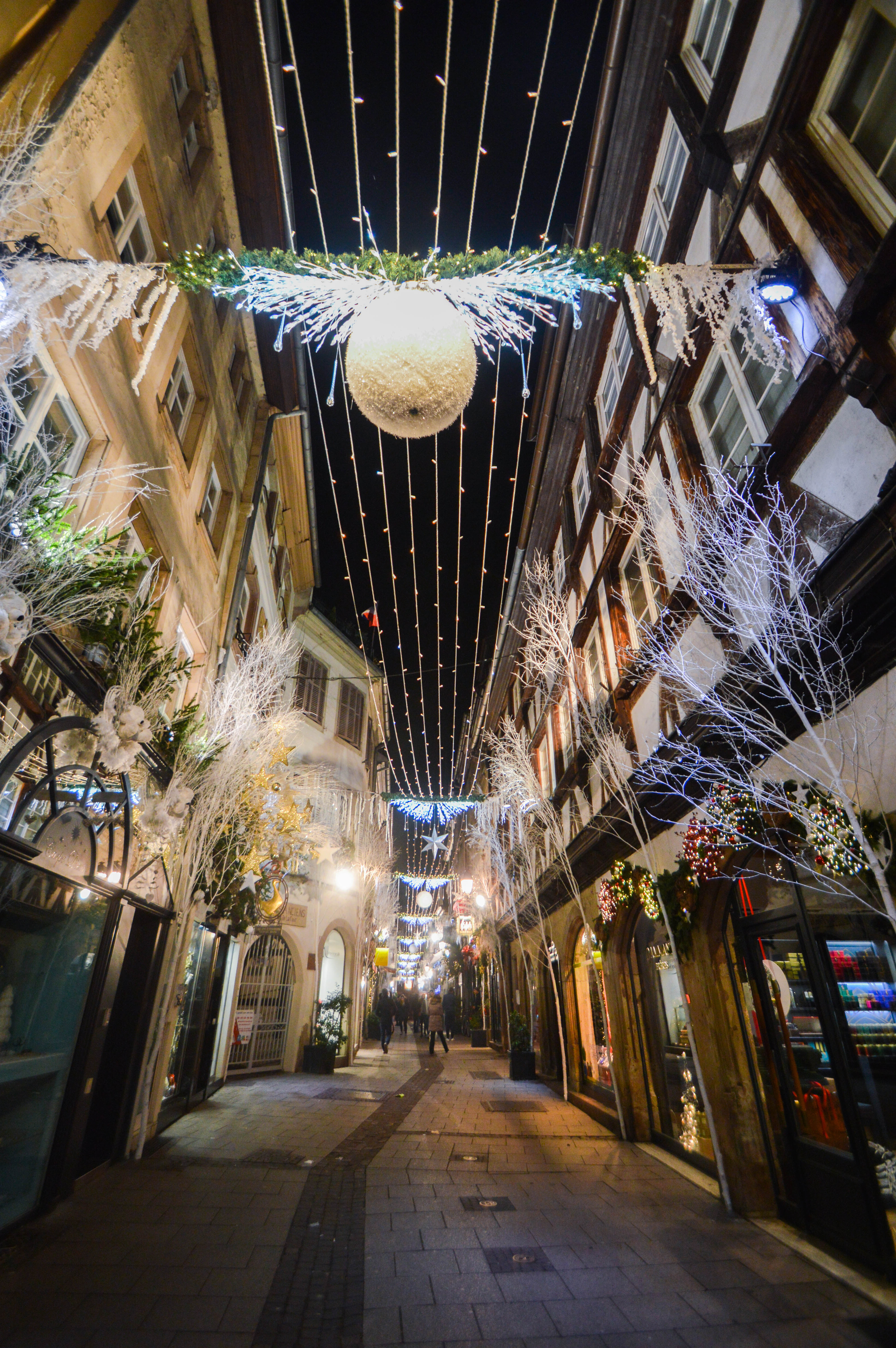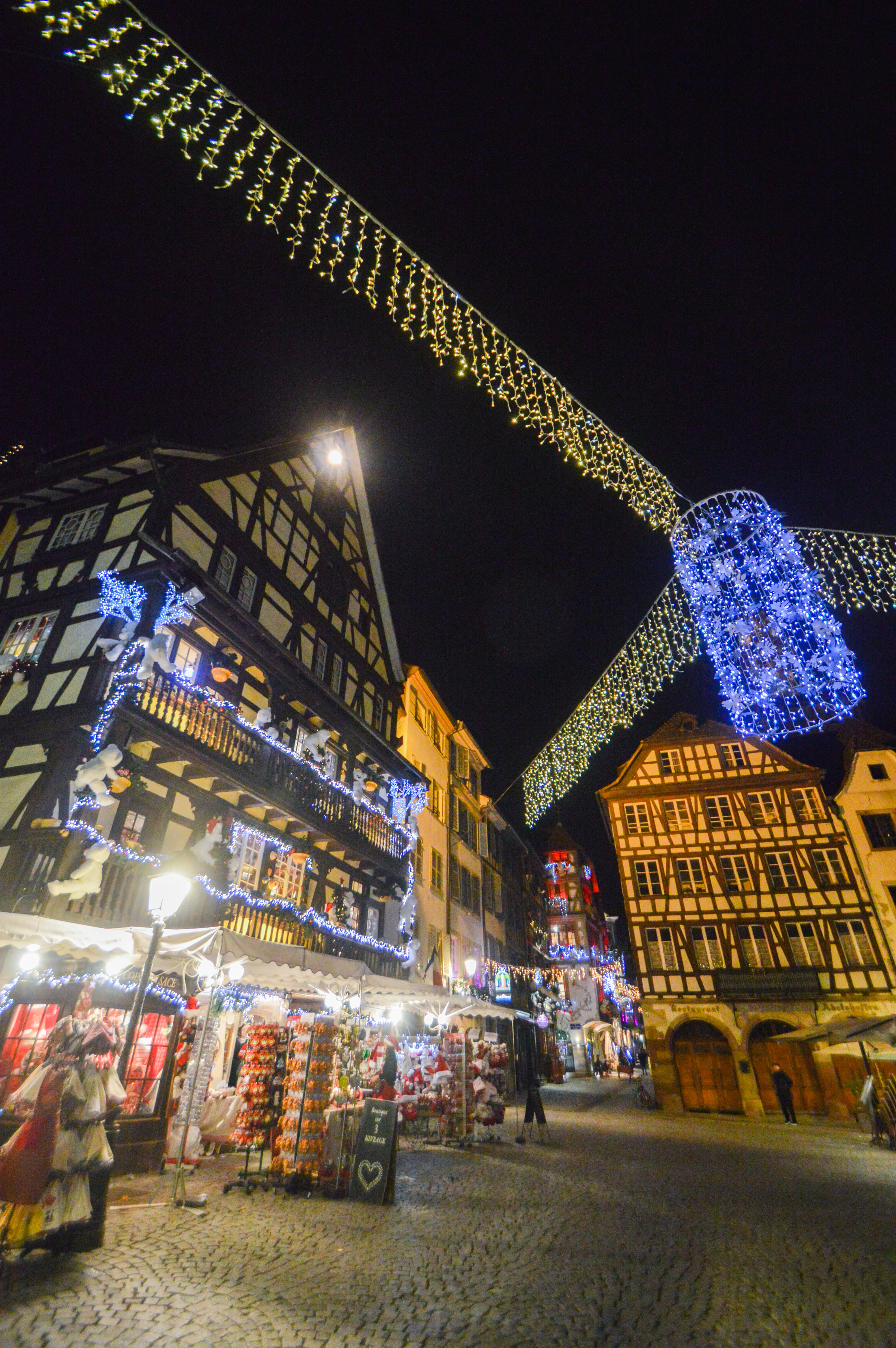Dans la continuité de cette rue, la Place du Marché-aux-Cochons-de-Lait, est elle aussi bien parée pour les fêtes. Avec sa boutique d’angle Le coin d’Alsace faisant face au Café Rohan, on trouve un bel angle de vue pour observer les maisons à colombage de style Renaissance et la pointe de la Cathédrale. Voici l’avant-après des décorations du jour et de la nuit 🙂