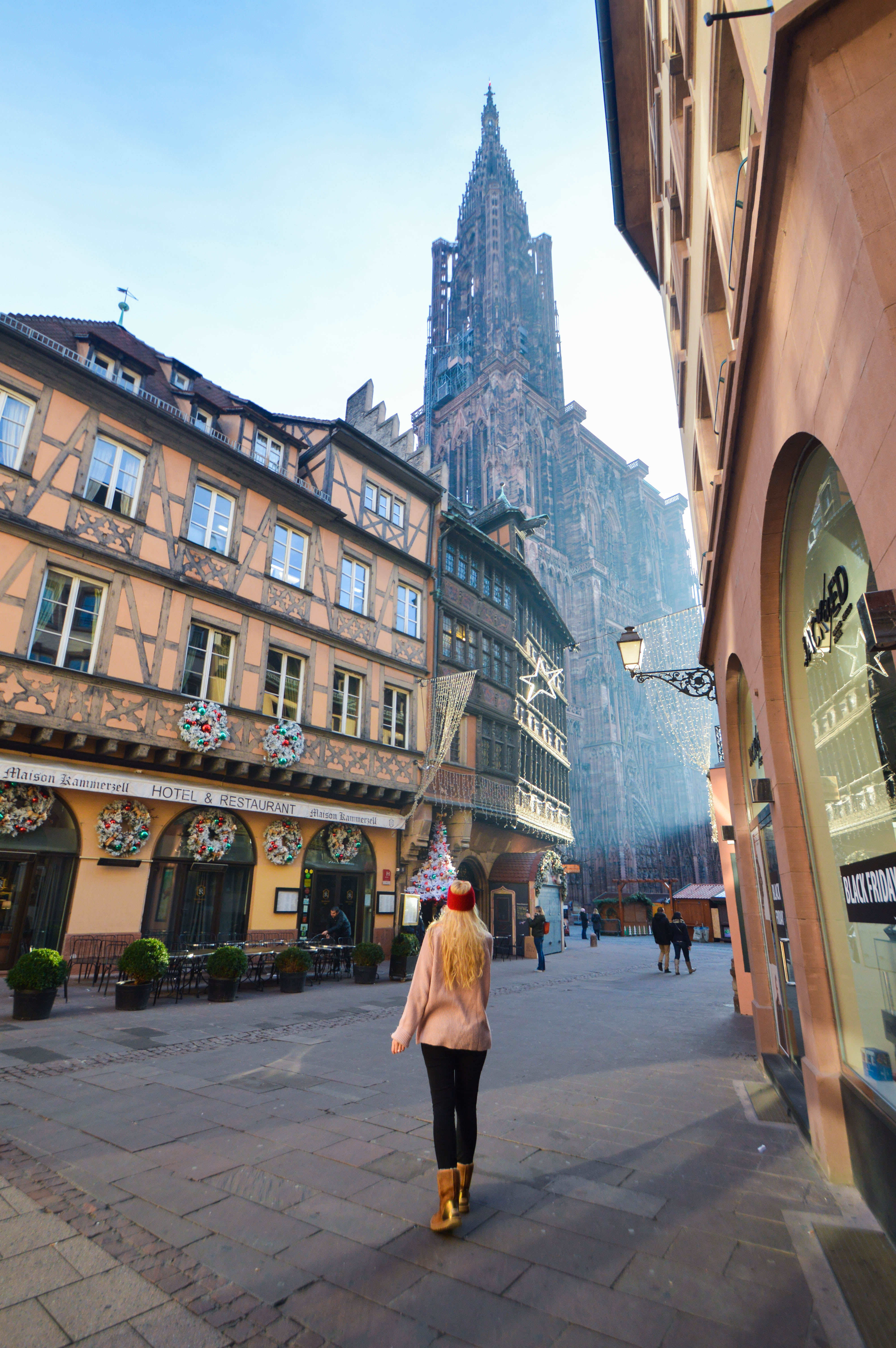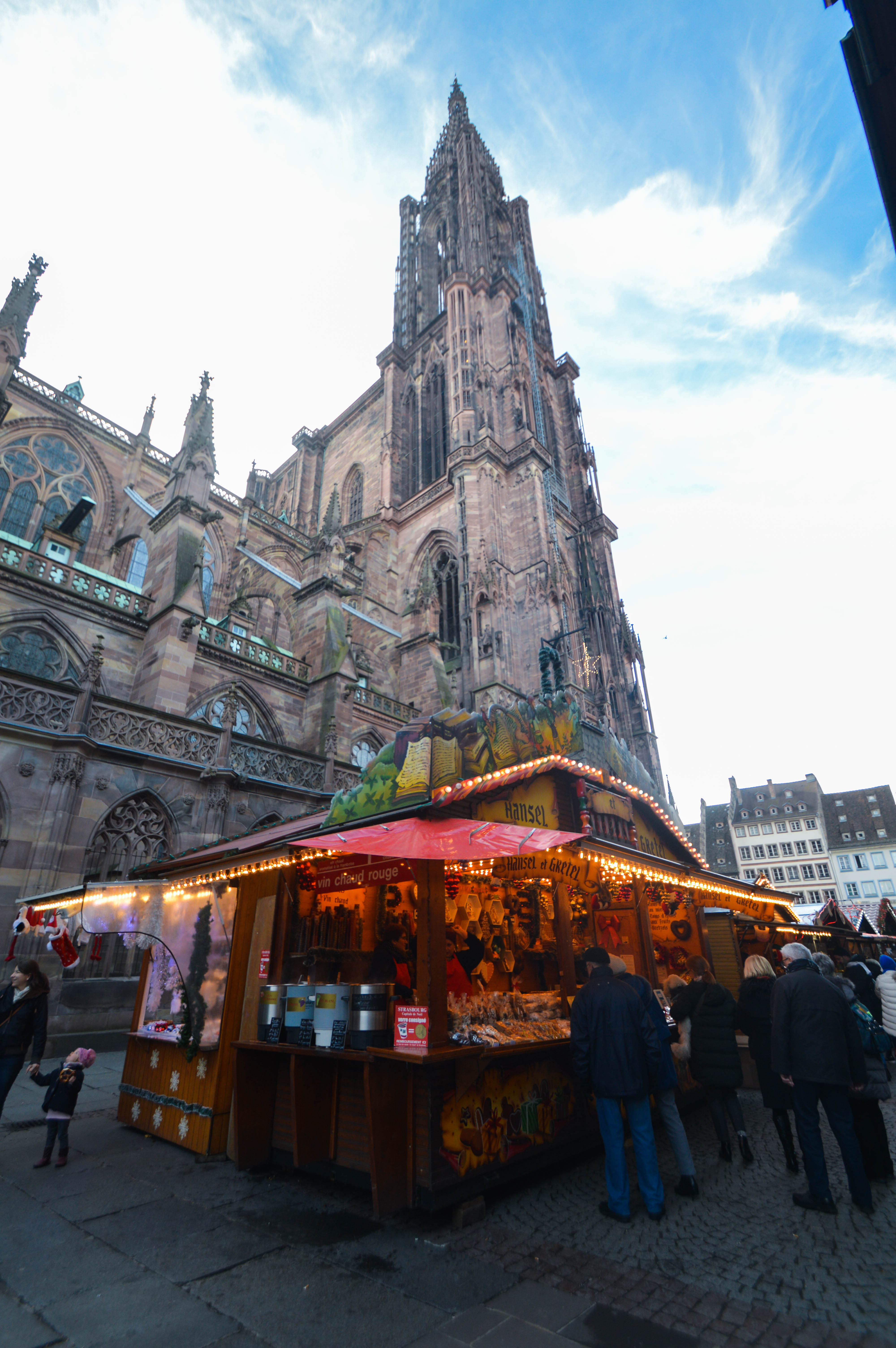 Tout s’anime et brille. Dans des senteurs de fondues et d’épices, du vin chaud qui s’élève dans les airs et des façades recouvertes d’animaux, ours et guirlandes lumineuses, on slalome entre des stands de poupées russes, de peluches à l’effigie du fameux bonhomme de pain d’épices, de bouillottes animaux ultra mignonnes et douces, d’objets décoratifs pour le sapin et les crèches. Partout de quoi contenter sa gourmandise avec les pains d’épices éparpillés sur plusieurs mètres, beignets, crêpes, gaufres, spécialités de la région, bretzels, raclette, vin chaud à la cannelle, à la pomme ou tout simplement nature. Apparemment, il y a aussi des chants de Noël dans les églises, des concerts et autres animations référant aux traditions alsaciennes ainsi qu’un pays mis à l’honneur mais lors de mon passage je n’en ai pas vu, c’était encore plutôt calme à cette période, le Marché venait d’ouvrir ses portes. Enfin, on peut monter en haut de l’horloge astronomique et du clocher de 142m pour une vue panoramique sur le Rhin.