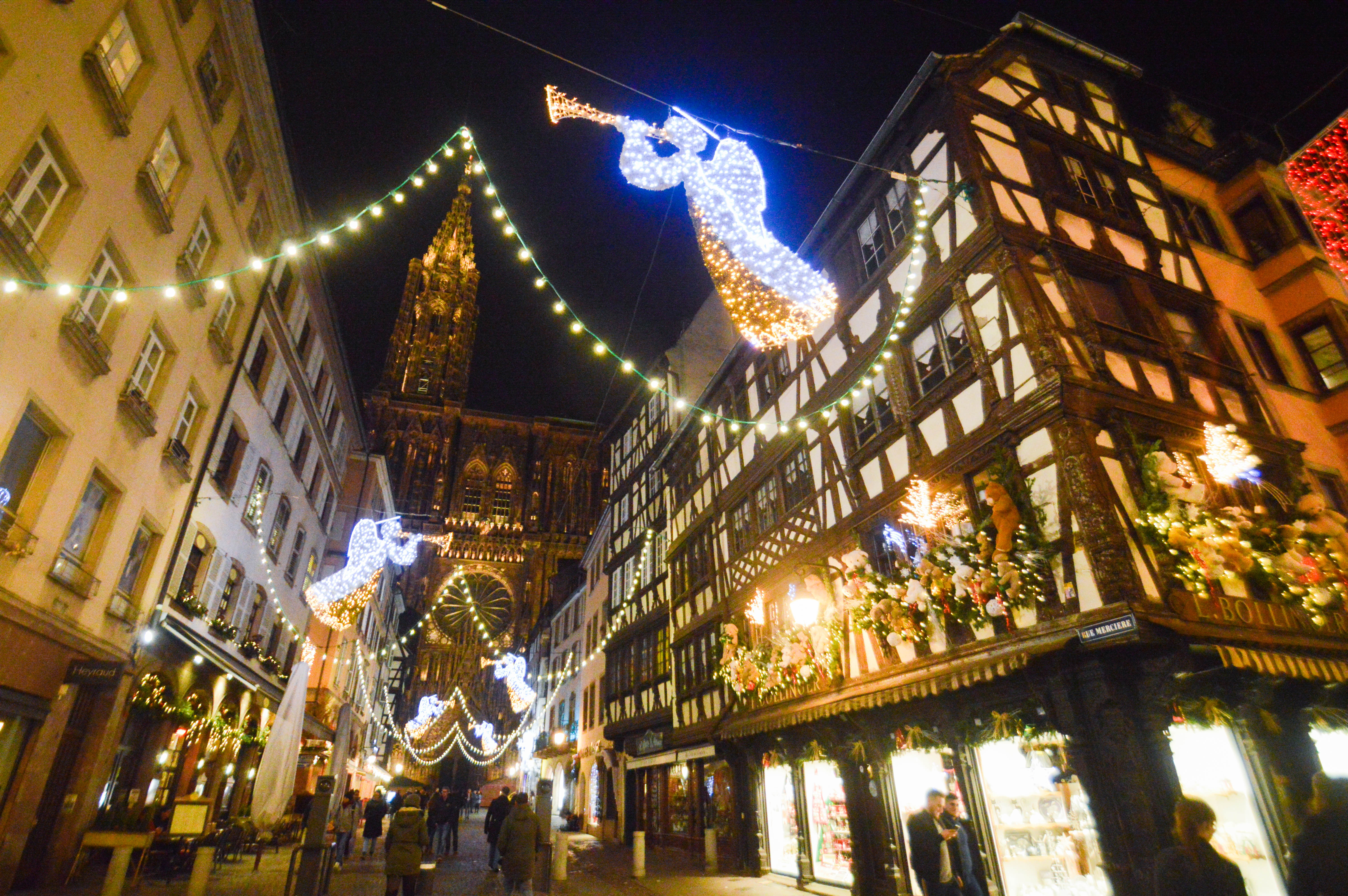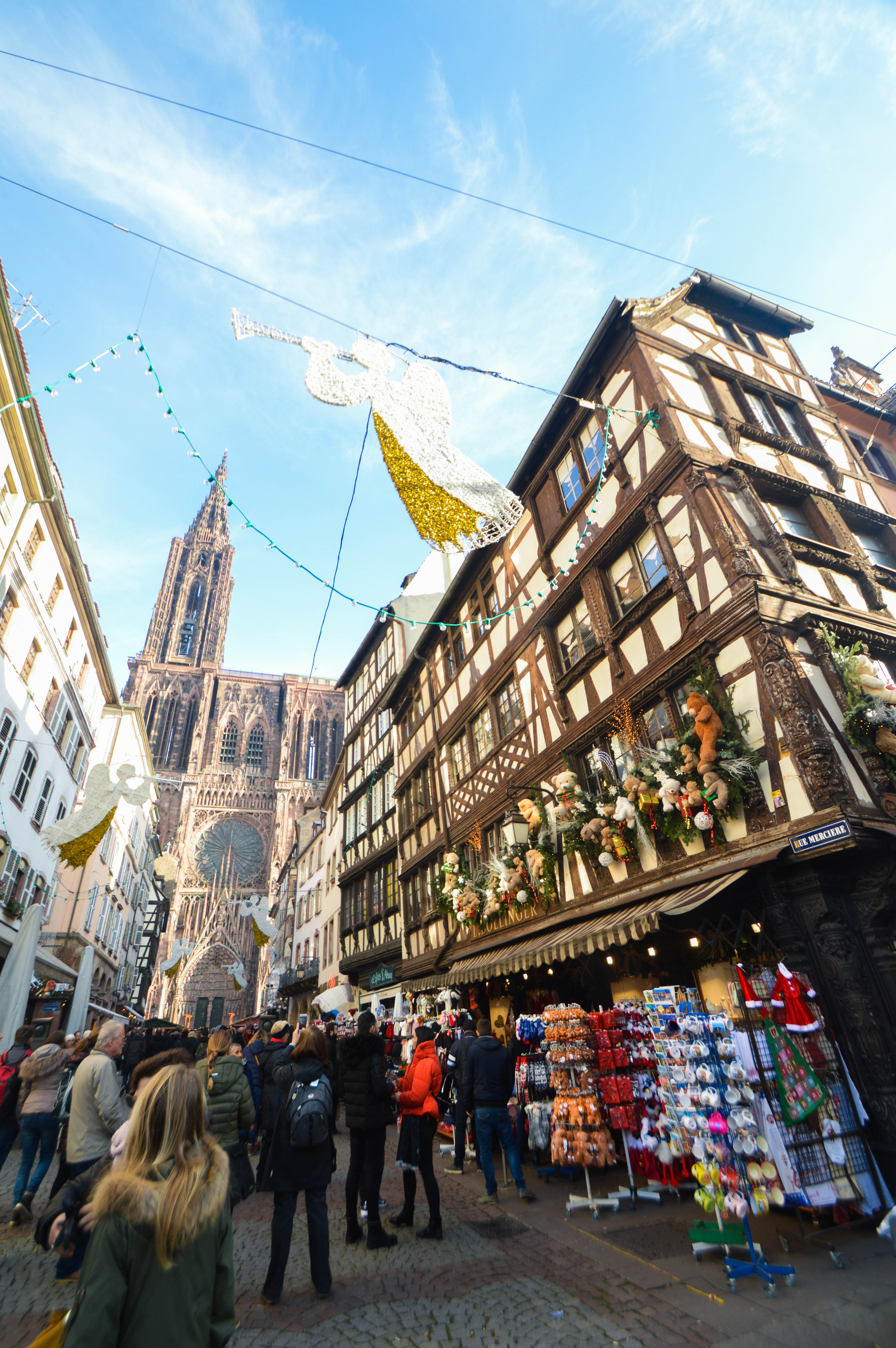 C’est cette image emblématique de Strasbourg que retiennent tous les journaux télévisés et guides pour illustrer la ville, la jolie perspective de la Rue Mercière. Ses anges de couleurs blanc vif et doré sonnant la trompette, placés en ligne droite pour mener jusqu’à la Place de la Cathédrale. Classée au patrimoine de l’Unesco, c’est l’une des plus anciennes places alsaciennes. A l’angle de la place avec la Rue Mercière, au numéro 10, on peut apercevoir d’anciennes arcades qui étaient celles de la Pharmacie du Cerf autrefois, la plus ancienne pharmacie de France dont l’activité a seulement cessé en 2000. Au numéro 16 également, on trouve la Maison Kammerzell, le tout bordé par plein de magasins de souvenirs.