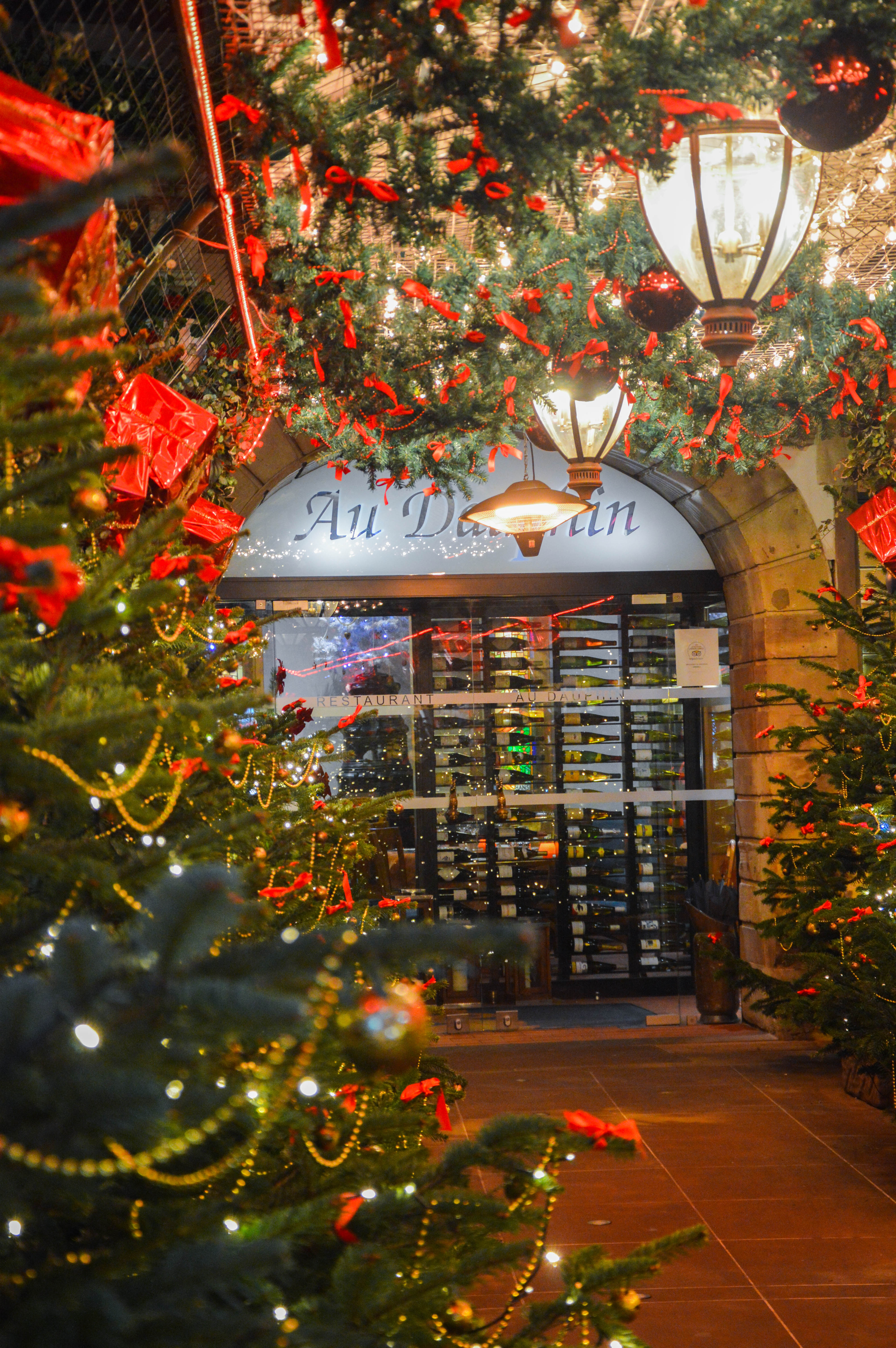 Sur le coin de la place, l’entrée du restaurant Au Dauphin interpelle avec une perspective de sapins de Noël illuminés et cette explosion de lumière, de rouge et de vert !