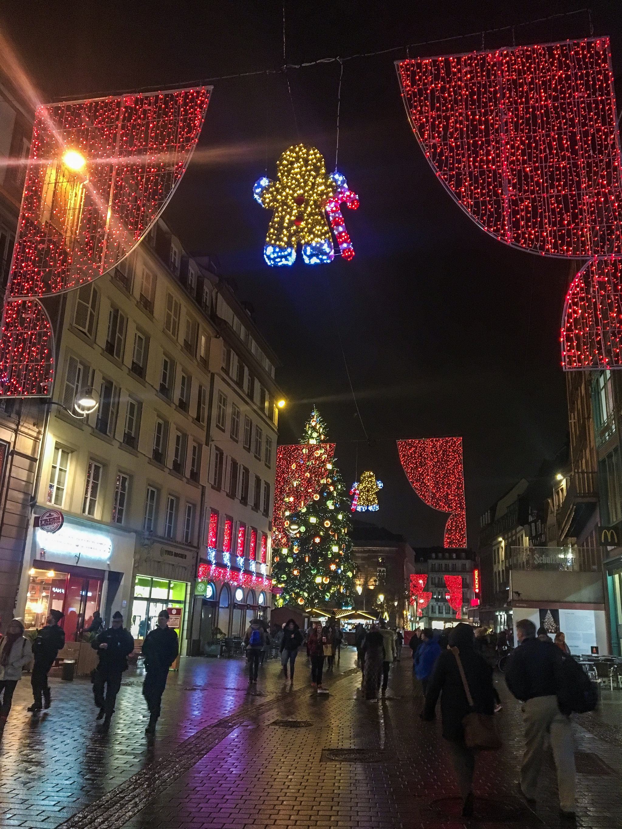 Vous la reconnaissez bien, c’est dans cette rue qu’est inaugurée chaque année la porte d’entrée du Marché de Noël de Strasbourg, la Porte des Lumières. Ornée de deux oursons gigantesques reliés par une arche étoilée qui scintille d’or et de blanc, l’entrée à la Capitale de Noël a conservé la tradition depuis le premier marché au 14ème siècle, le marché Saint-Nicolas. Parsemée de bonhommes de pain d’épice tenant fermement leurs cannes à sucre dans une belle perspective de rideaux rouges, elle est perpendiculaire à la Rue Mercière.