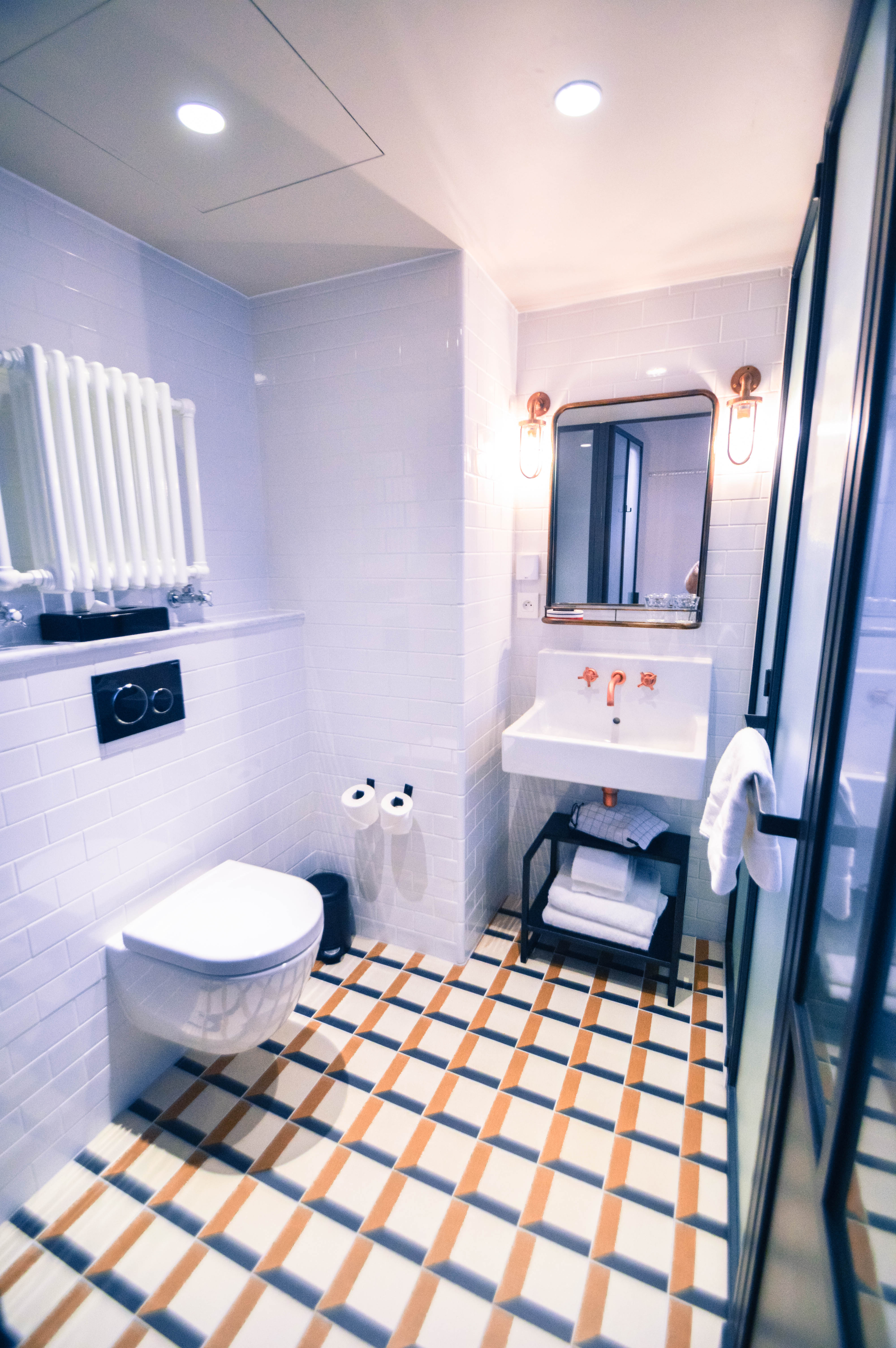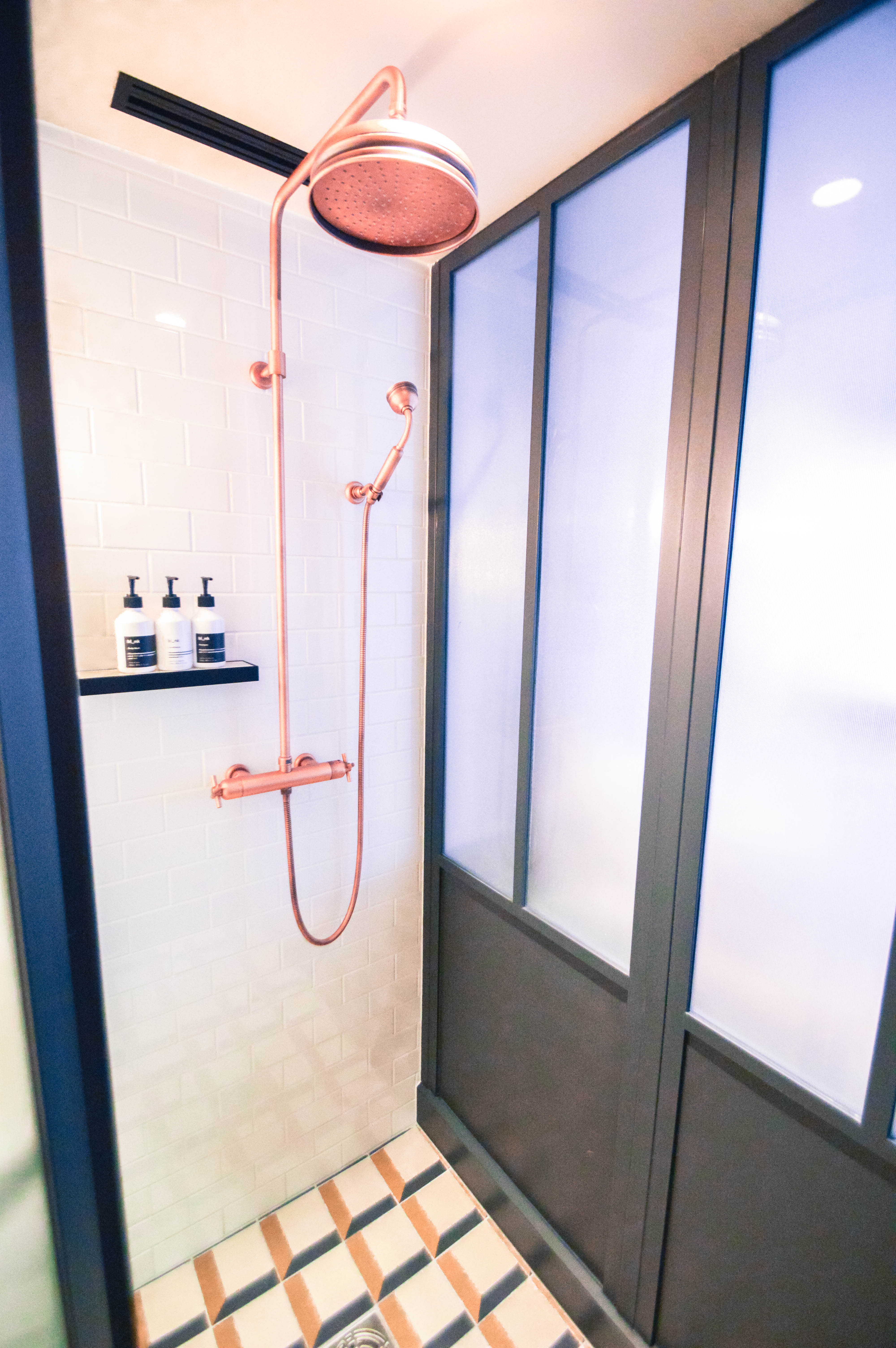 Il faut dire qu’il comporte 172 chambres, chacune donnant sur chaque recoin du bâtiment. Avec 4 tailles différentes pour celles-ci (vous avez le choix entre une petite Shoebox, une standard Cosy, une vaste Roomy ou la plus large Biggy) impossible donc, d’en rater une partie. Le chemin pour se rendre à sa chambre est organisé comme pour vous faire faire un tour de l’hôtel, je l’ai appelé le labyrinthe, c’est ce qui fait aussi son originalité. On tombe vite sous le charme de ses chambres au style rétro vintage très spécial : une radio et un téléphone sorti de l’ancien temps, le semblant de cuir par lequel le haut du lit est pendu au mur, sur un parquet en chevron digne d’un appartement parisien, un lit moelleux au couvre-lit à carreaux qui donne envie de se jeter dessus, des lumières tamisées, un coin bibliothèque et la salle de douche presque transparente pour donner l’impression que le tout ne fait qu’une pièce. L’espace est bien optimisé pour ne justement pas en perdre un recoin, ainsi le sofa couvre tout le long du mur et permet de profiter de la vue sur cette chambre atypique ou sur la cour. Avec un café ou un thé réalisé grâce à la machine présente et ce bon espace chill, on se sentirait presque comme à la maison ! Celle que je vous montre ici est la Double Standard Cosy Room, nous avons eu la même en Twin avec vue sur la rue.