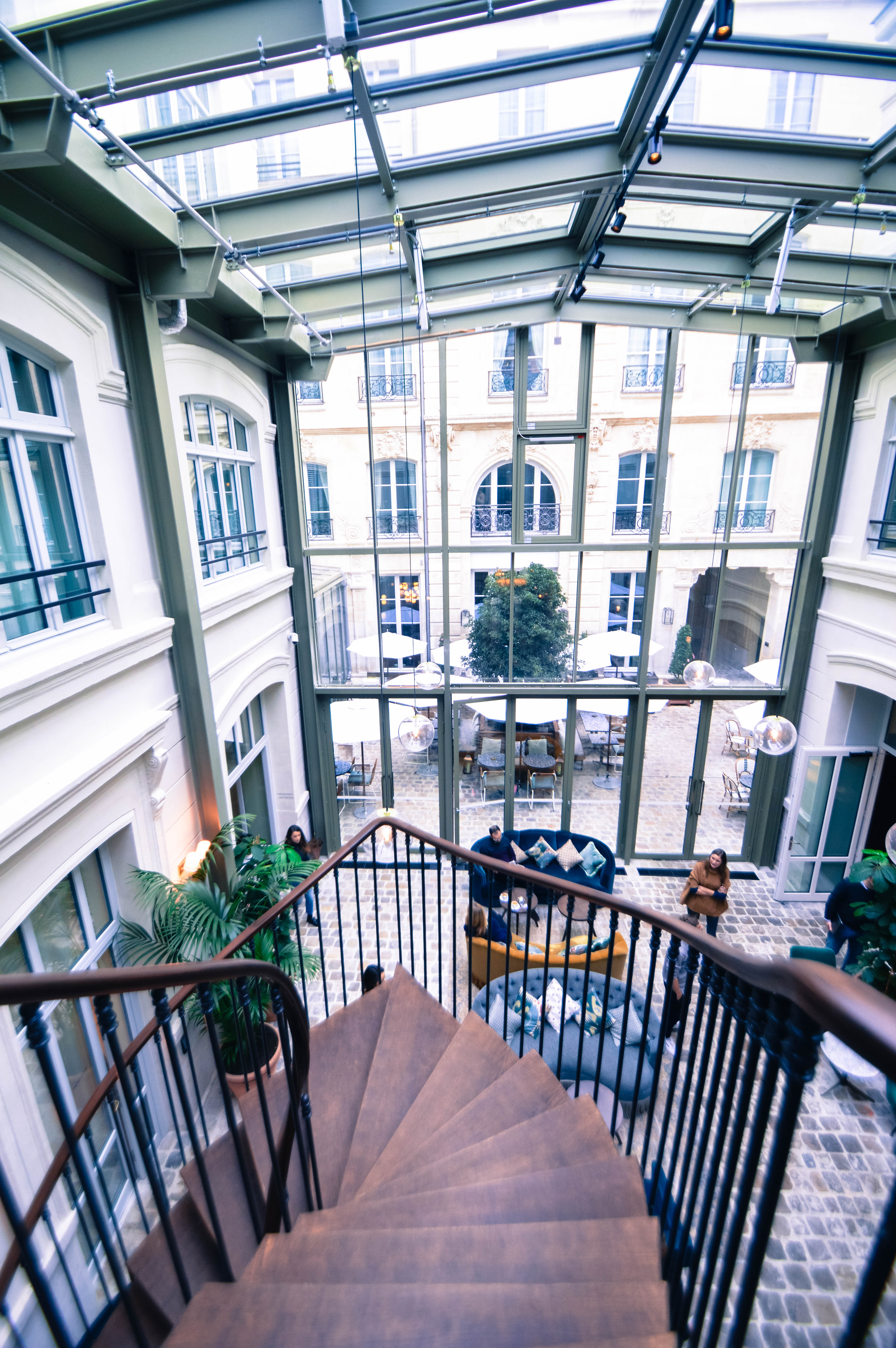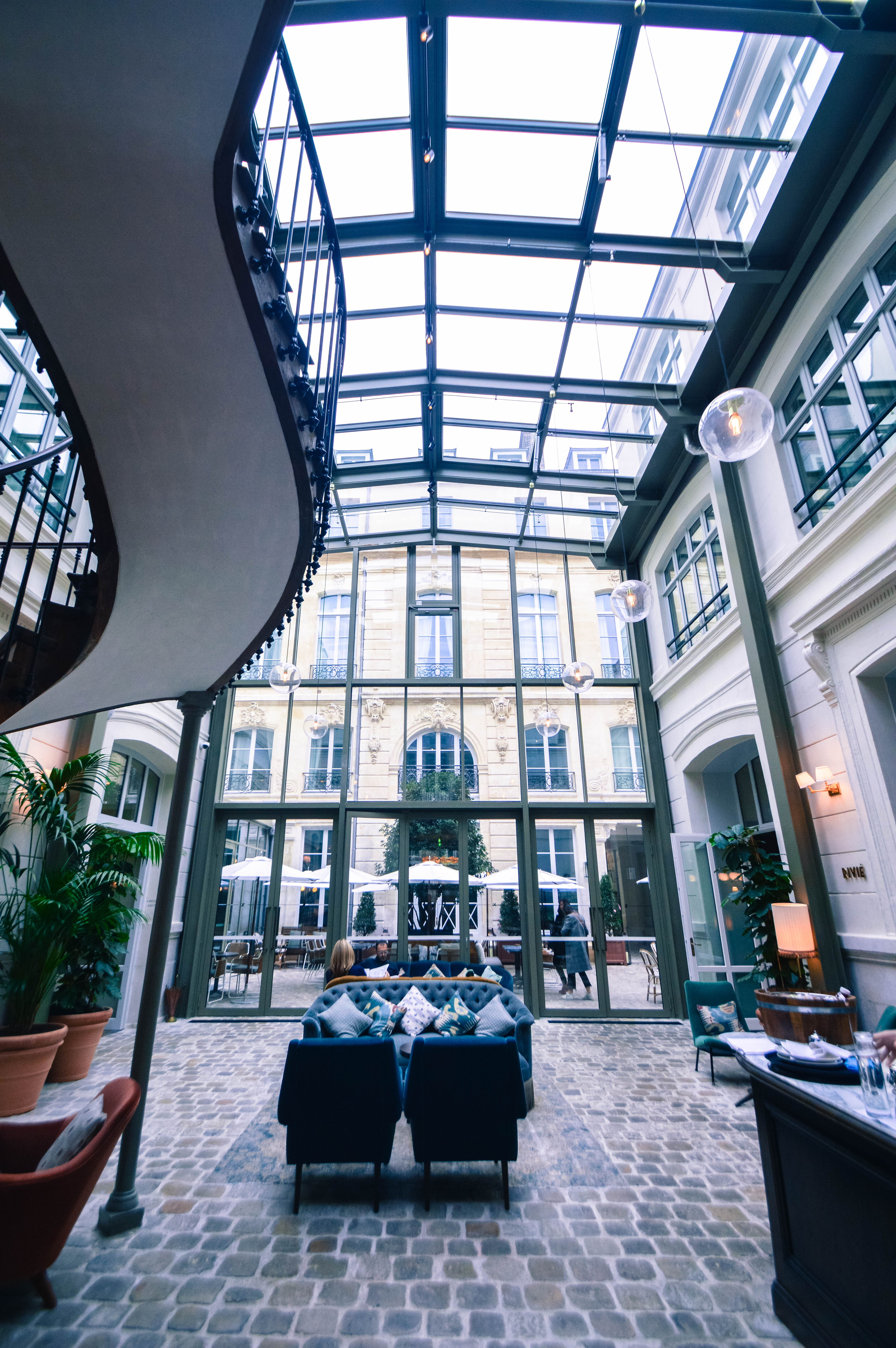 Le Hoxton Hotel Paris, c’est un élégant hôtel situé dans le 2ème arrondissement de Paris où l’animation des Grands Boulevards bat son plein. L’entrée de cet hôtel a quelque chose de magique, à peine franchie que l’on est basculé dans une autre dimension de la vie parisienne. Loin de la rue bruyante, le calme absolu règne sous cette verrière impressionnante. L’allure pavée confère au lieu un côté authentique pour rappeler que oui, nous sommes bien dans la plus belle ville du monde. Dans le lobby, la couleur vient redonner un peu de chaleur et d’éclat à cet endroit. L’escalier que l’on voit ne sert qu’à sortir de l’hôtel, pas d’y rentrer, et sa vue domine le hall ainsi que la jolie cour intérieure de cet ancien « hôtel particulier » du 18ème siècle.