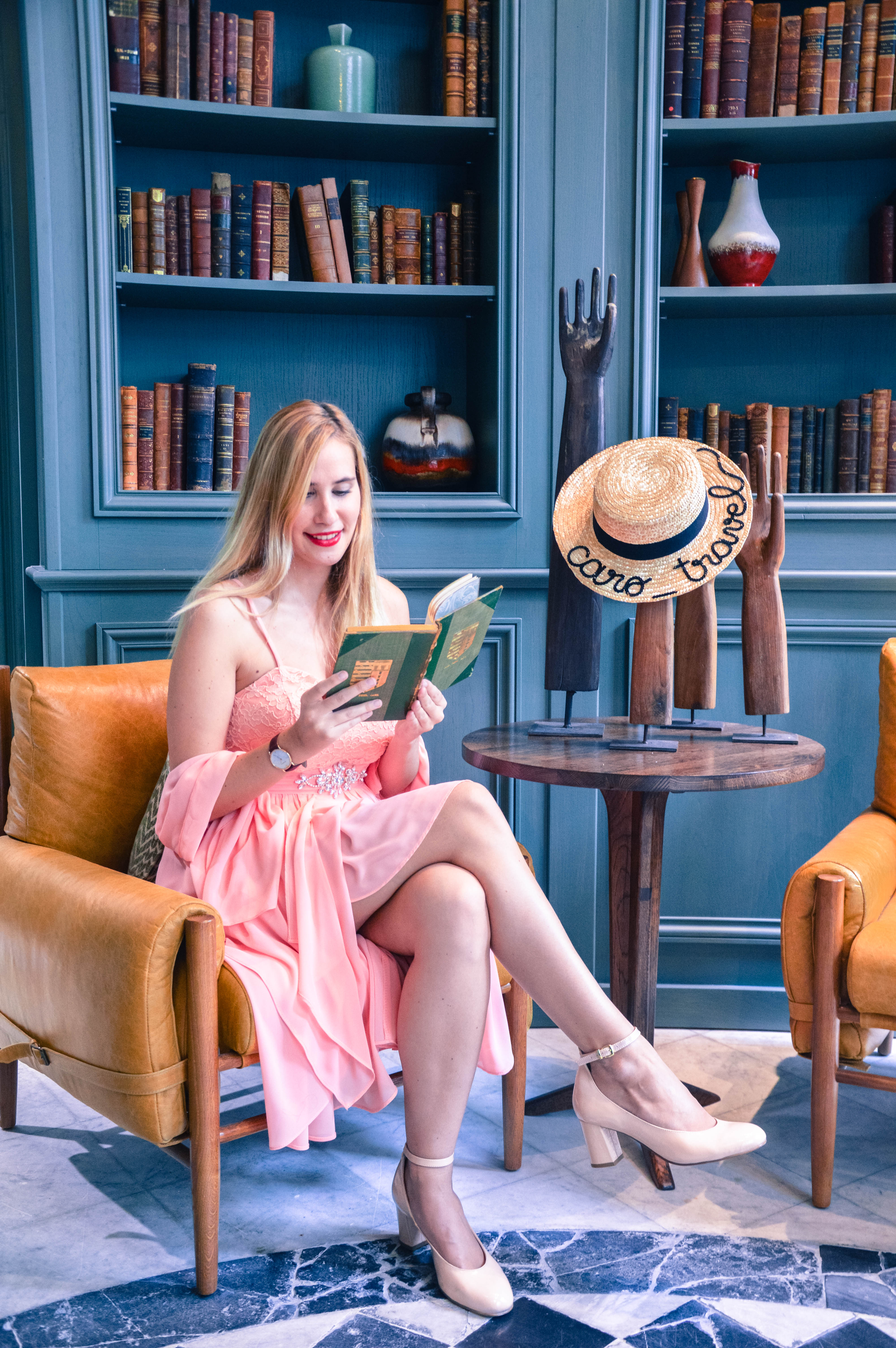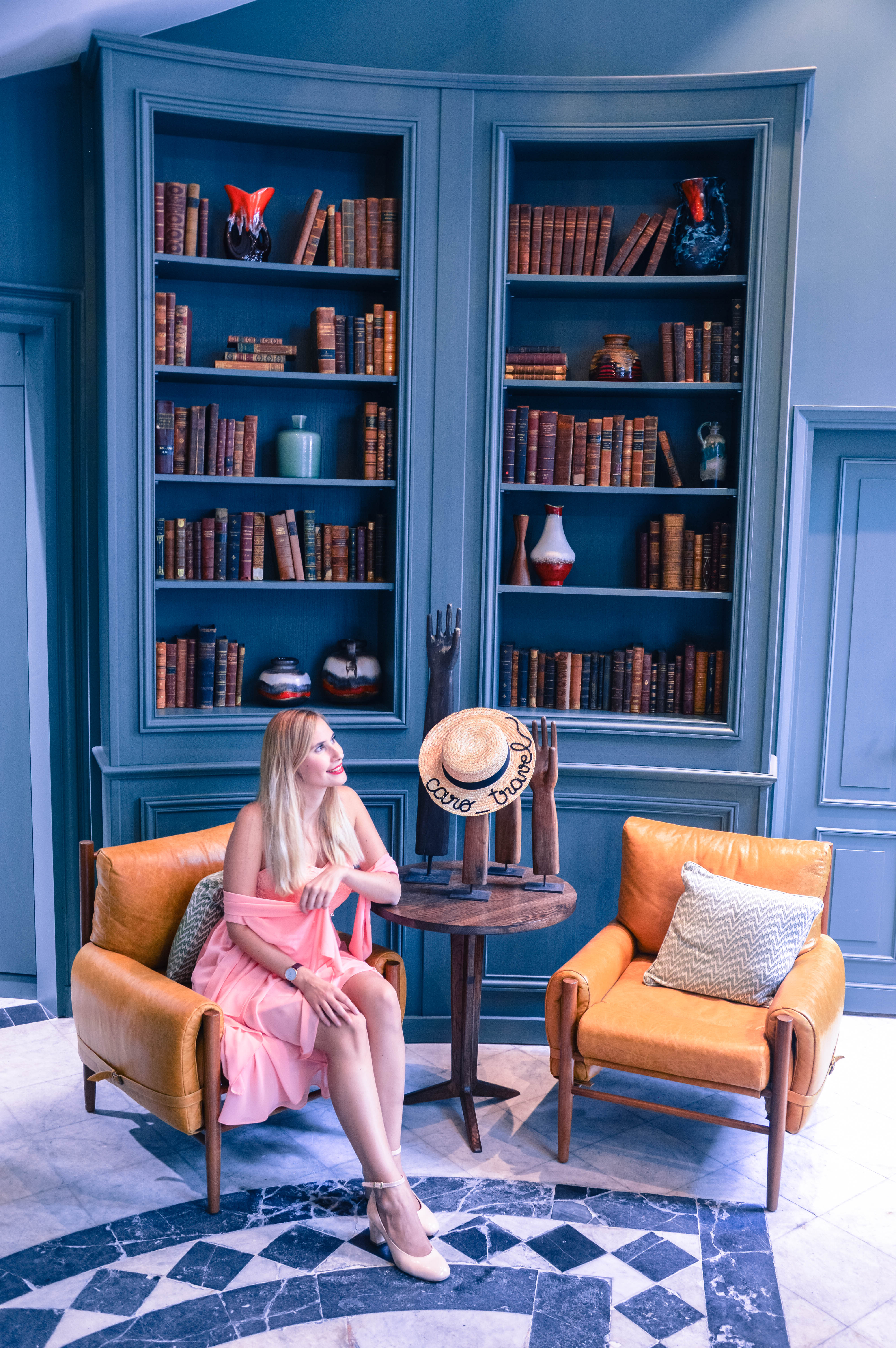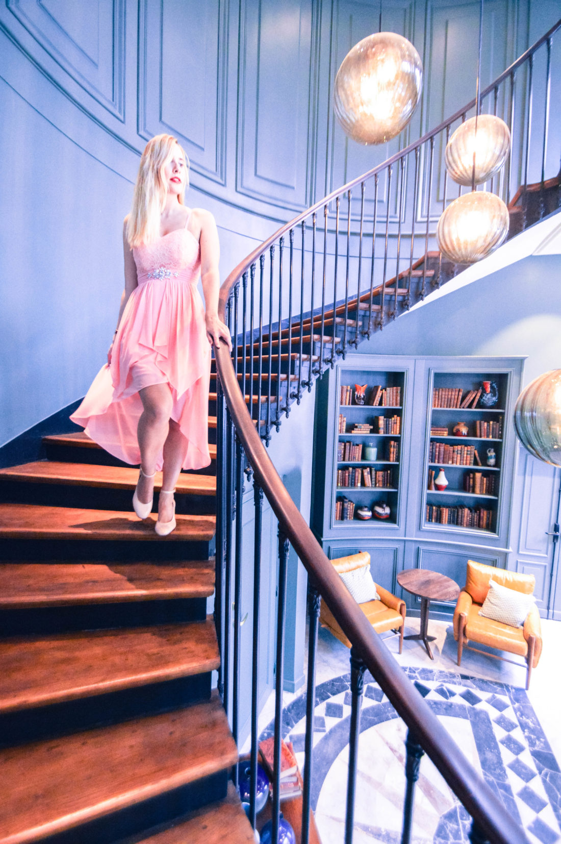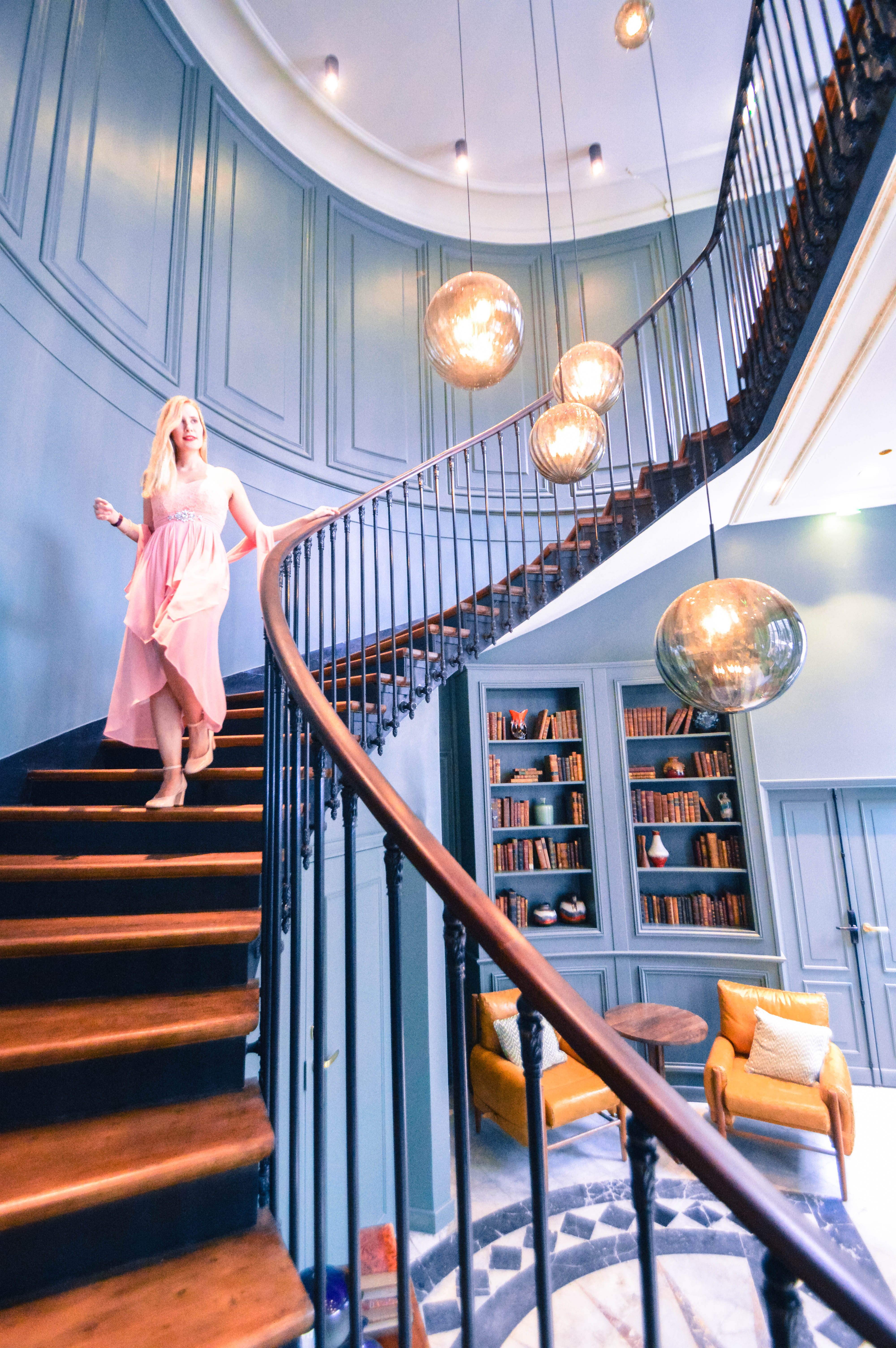 Dans la pièce voisine de la réception, se cache un incroyable escalier et son coin bibliothèque. Pour tout vous avouer, il est tellement instagrammable que c’est justement grâce à ce réseau social que j’ai découvert l’Hôtel Hoxton Paris. Dans ces couleurs et décorations lumineuses et les objets de voyages, je me suis sentie tout de suite à ma place ! 🙂