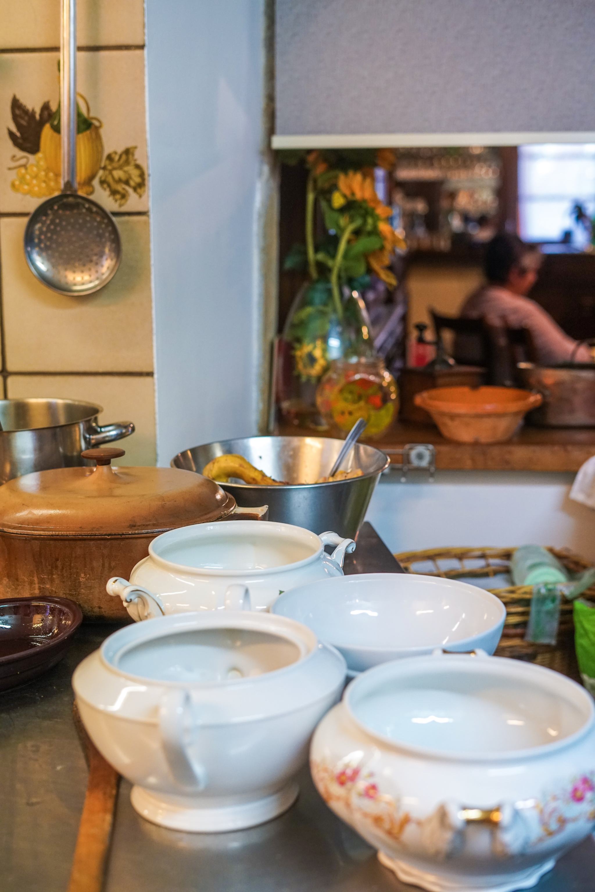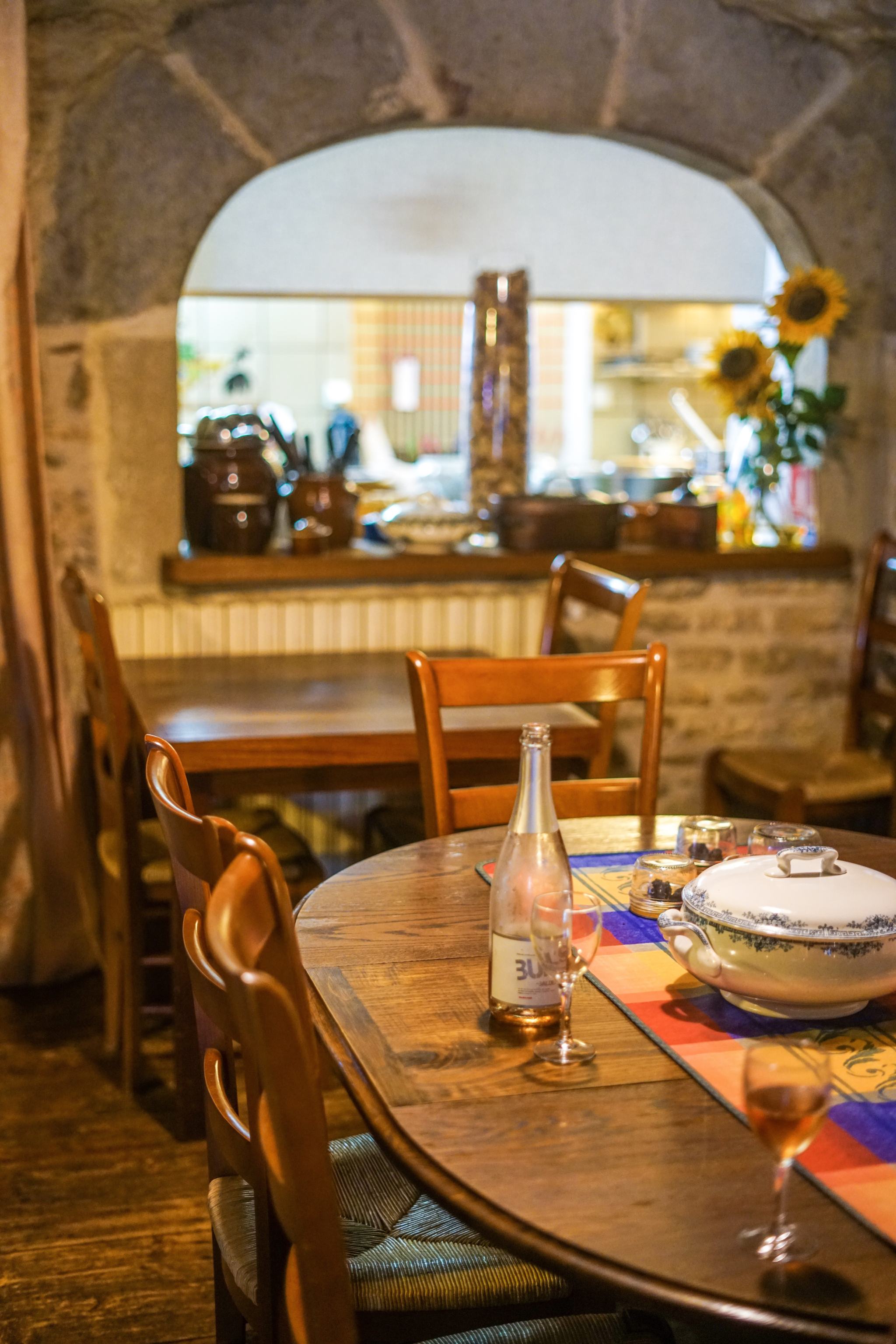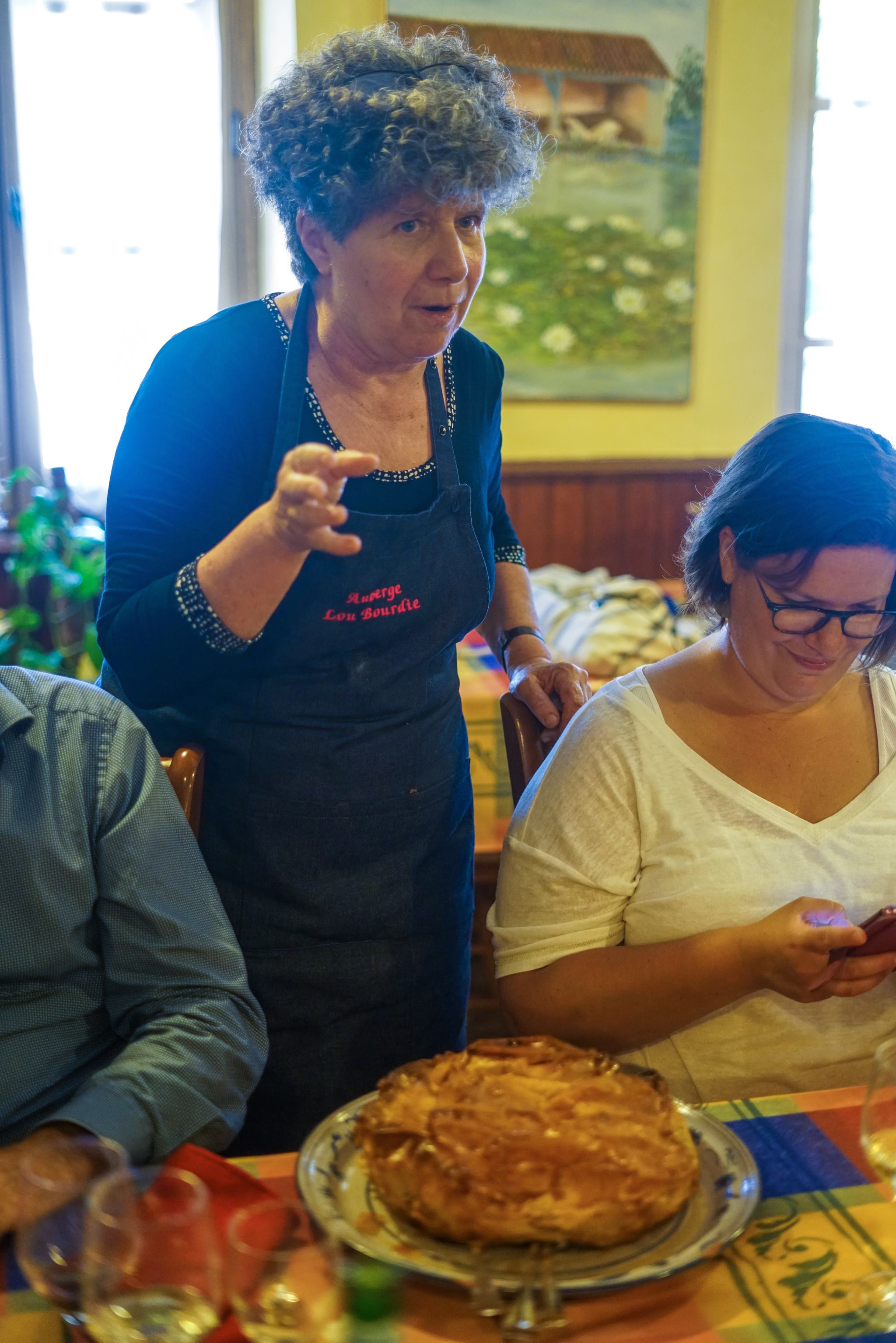 Vient ensuite l’heure de déjeuner, et ce midi c’est à la bonne franquette chez « Monique » dont nous avons entendu tant de bien, que nous nous rendons. Plus que hâte de découvrir cet endroit et de rencontrer Monique Valette qui tient l’Auberge Lou Bourdié. Une incroyable émotion en arrivant sur place, ce lieu en pleine campagne et l’intérieur de cette auberge familiale me ravissent. Nous croisons et discutons avec des dames réalisant le chemin de Saint-Jacques de Compostelle qui prenaient une pause sur la terrasse extérieure. Nous en venons ensuite enfin aux présentations avec la célèbre Monique, qui nous accueille avec un sourire et une gentillesse incomparables, elle me rappelle quelqu’un de ma famille qui nous a quitté il y a longtemps mais que j’aimais beaucoup alors ça m’a fait l’aimer encore plus 🙂 Elle nous présente ensuite l’auberge, la cuisine où elle concocte tous ses bons petits (enfin plutôt graaands!) plats. Nous passons ensuite à l’étape dégustation de tout ça ! Quel festin gargantuesque, nous n’avions plus de place tant c’était succulent !