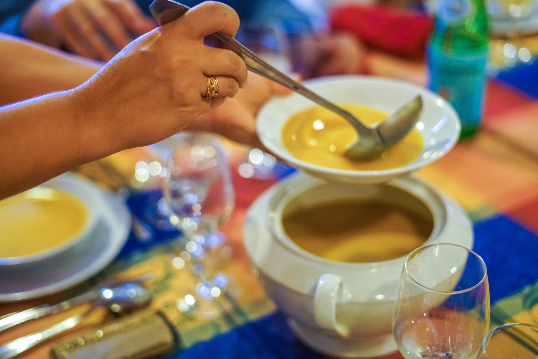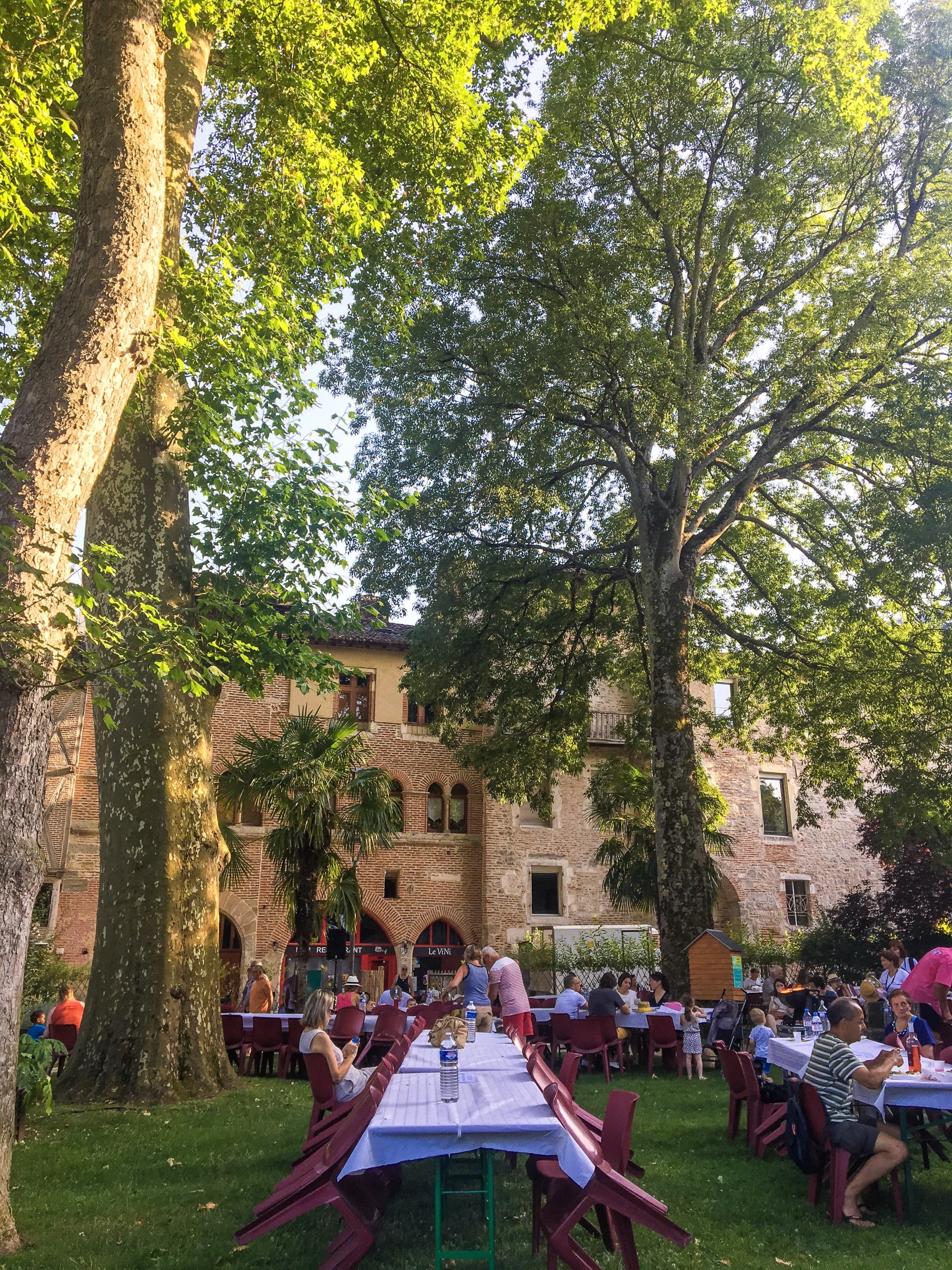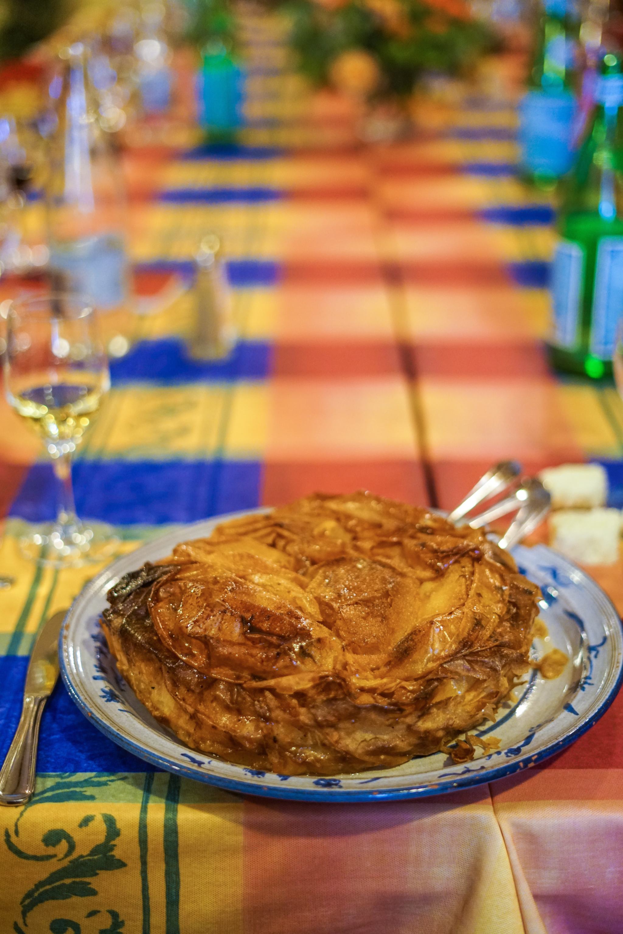 Vient ensuite l’heure de déjeuner, et ce midi c’est à la bonne franquette chez « Monique » dont nous avons entendu tant de bien, que nous nous rendons. Plus que hâte de découvrir cet endroit et de rencontrer Monique Valette qui tient l’Auberge Lou Bourdié. Une incroyable émotion en arrivant sur place, ce lieu en pleine campagne et l’intérieur de cette auberge familiale me ravissent. Nous croisons et discutons avec des dames réalisant le chemin de Saint-Jacques de Compostelle qui prenaient une pause sur la terrasse extérieure. Nous en venons ensuite enfin aux présentations avec la célèbre Monique, qui nous accueille avec un sourire et une gentillesse incomparables, elle me rappelle quelqu’un de ma famille qui nous a quitté il y a longtemps mais que j’aimais beaucoup alors ça m’a fait l’aimer encore plus 🙂 Elle nous présente ensuite l’auberge, la cuisine où elle concocte tous ses bons petits (enfin plutôt graaands!) plats. Nous passons ensuite à l’étape dégustation de tout ça ! Quel festin gargantuesque, nous n’avions plus de place tant c’était succulent !