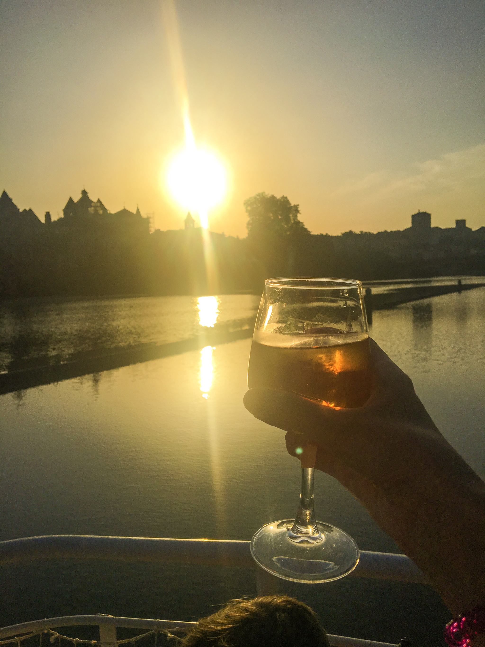 Après le spectacle, nous avons poursuivi avec une petite croisière sur la rivière du Lot, qui, à l’époque, permettait d’assurer le transport des marchandises à moindre coût avant l’apparition du chemin de fer plus rapide, jusqu’au majestueux et emblématique Pont Valentré, classé au Patrimoine Mondial de l’Unesco. Un coucher de soleil qui ne s’oublie pas ! Nous avons également fait l’expérience de passer dans une écluse, qui ont d’ailleurs fait leur première apparition sous le règne de Louis XIV.
