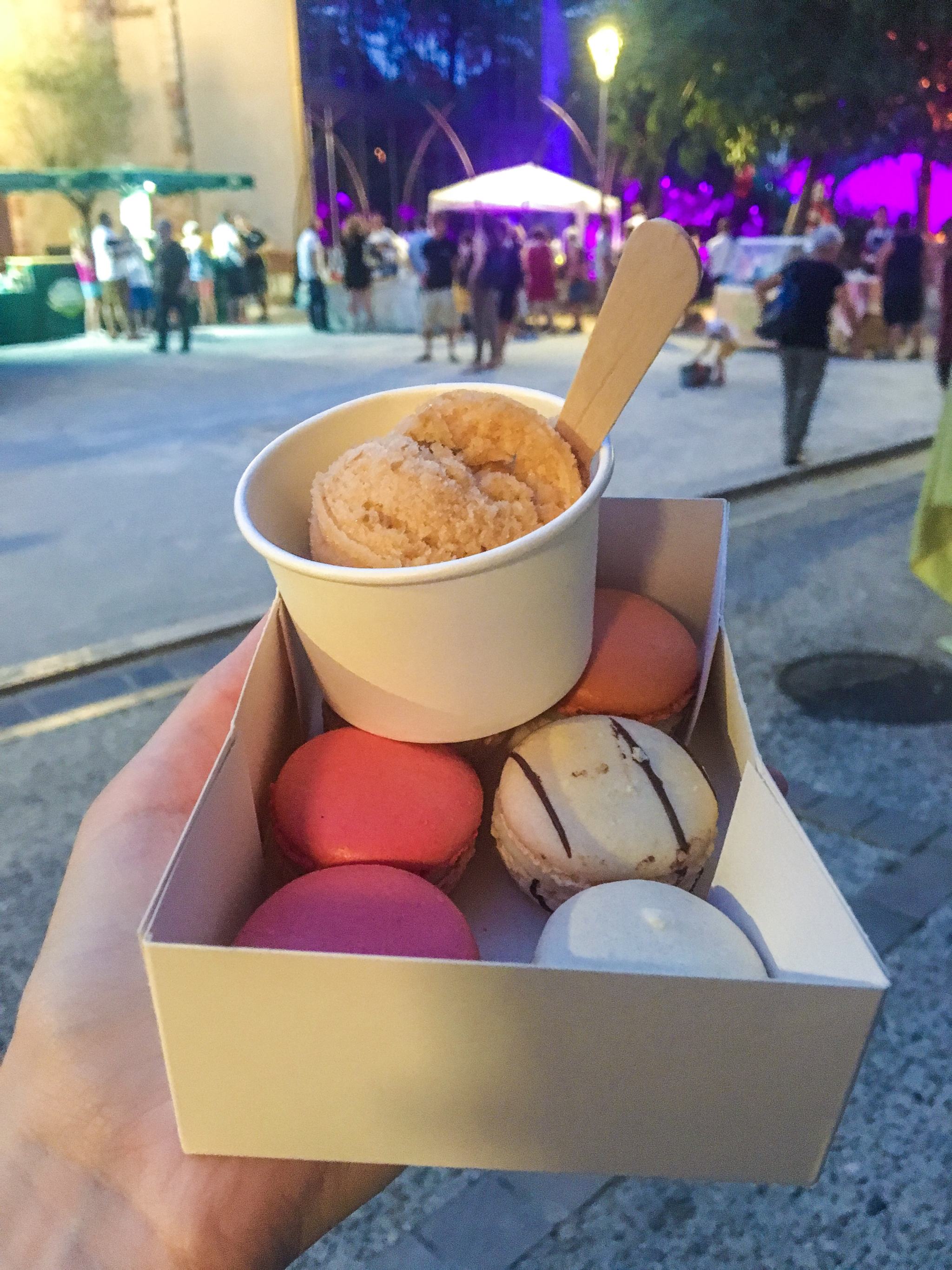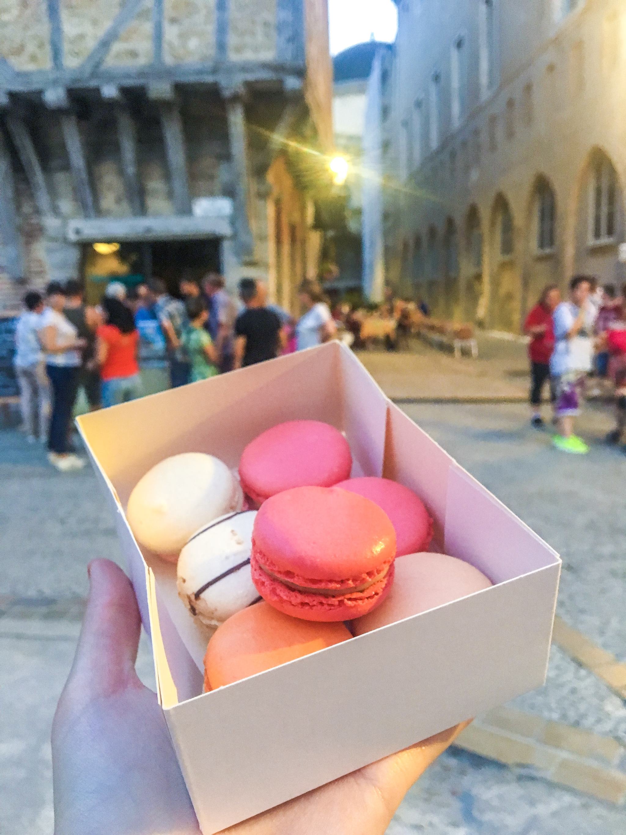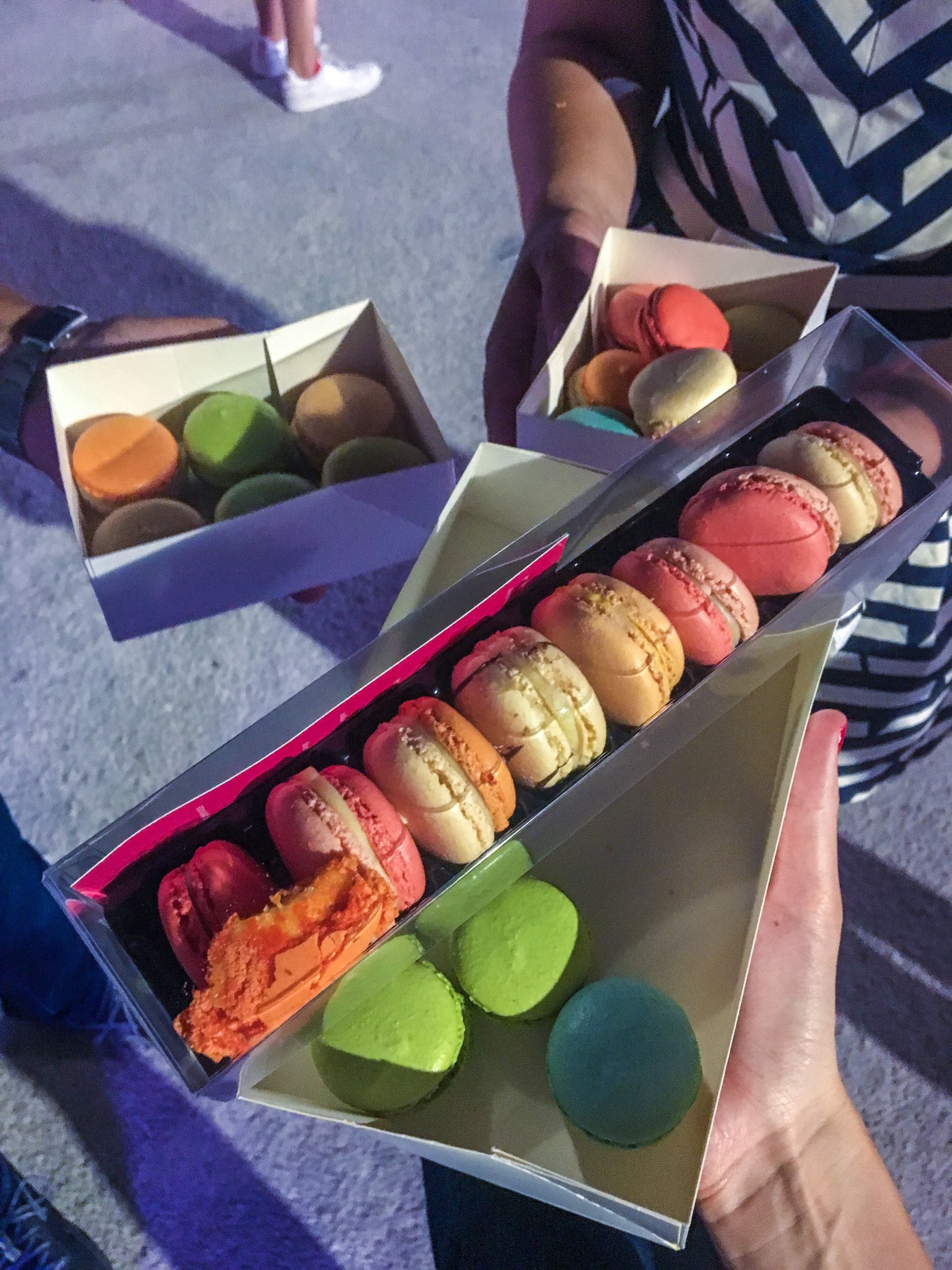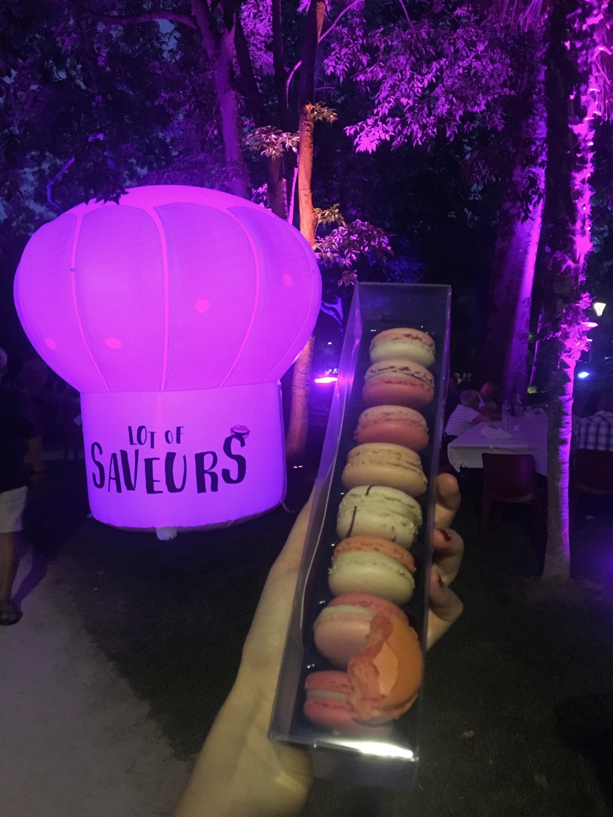 La soirée s’est terminée au Marché Gourmand pour un excellent dîner et moment partagé tous ensemble dans le Square Olivier-de-Magny. Une ambiance festive et chaleureuse au milieu des arbres recouverts de décorations lumineuses colorées, de grandes tablées d’hôtes pour recevoir tout le monde. Tous les producteurs de la région se sont réunis sur cette place pour servir des denrées locales, entre salades fraîches, fromages, pains, vins, glaces et aussi ces macarons de fabrication artisanale de la Maison Pim chez qui nous avons fait une razzia ! Des goûts comme jamais je n’ai goûté et des parfums assez peu communs qui nous ont de suite conquis…rose framboise, thé agrumes, safran-fleur d’oranger, chocolat blanc-framboise, bounty, noix-caramel beurre salé entre autres…