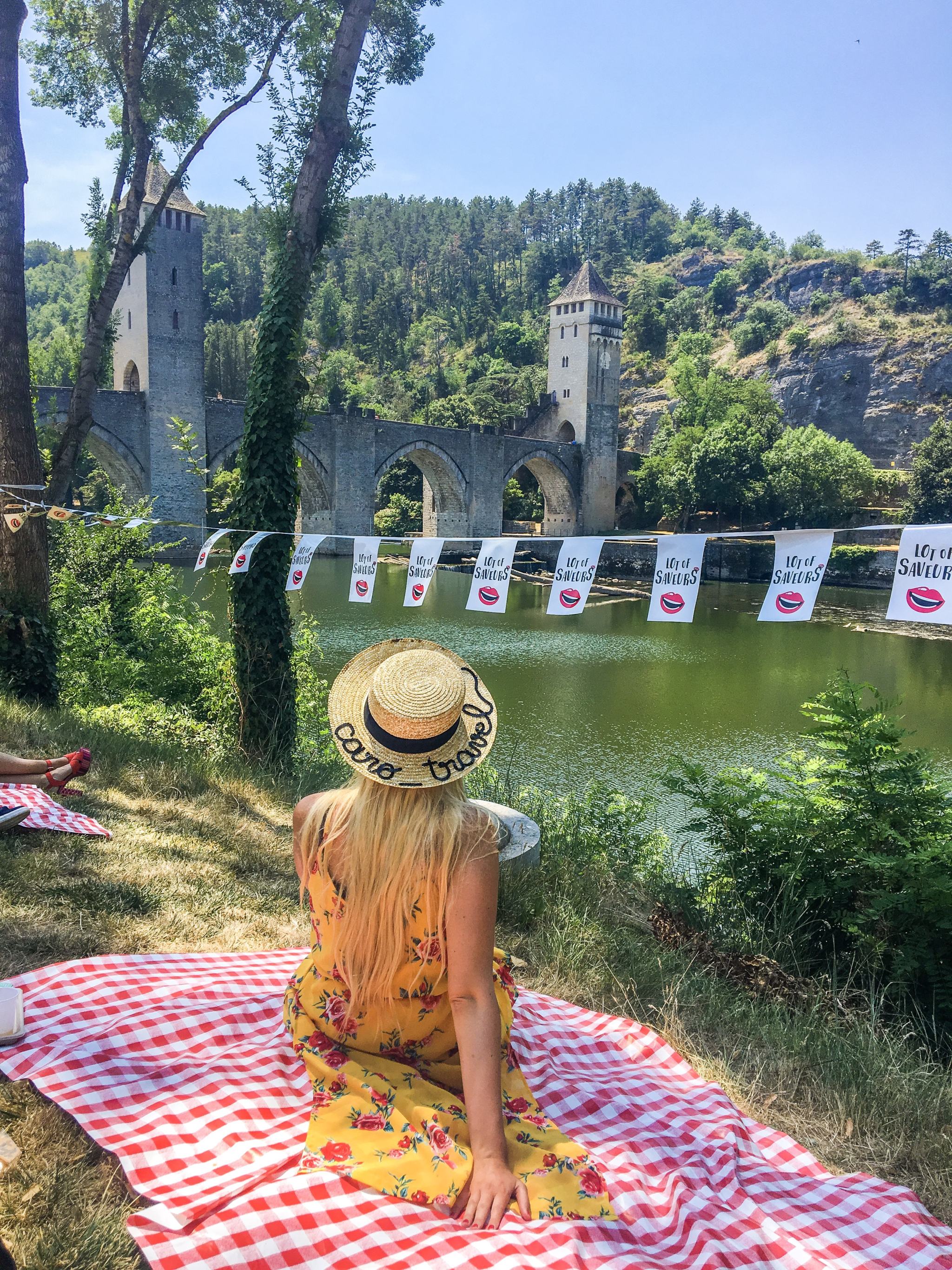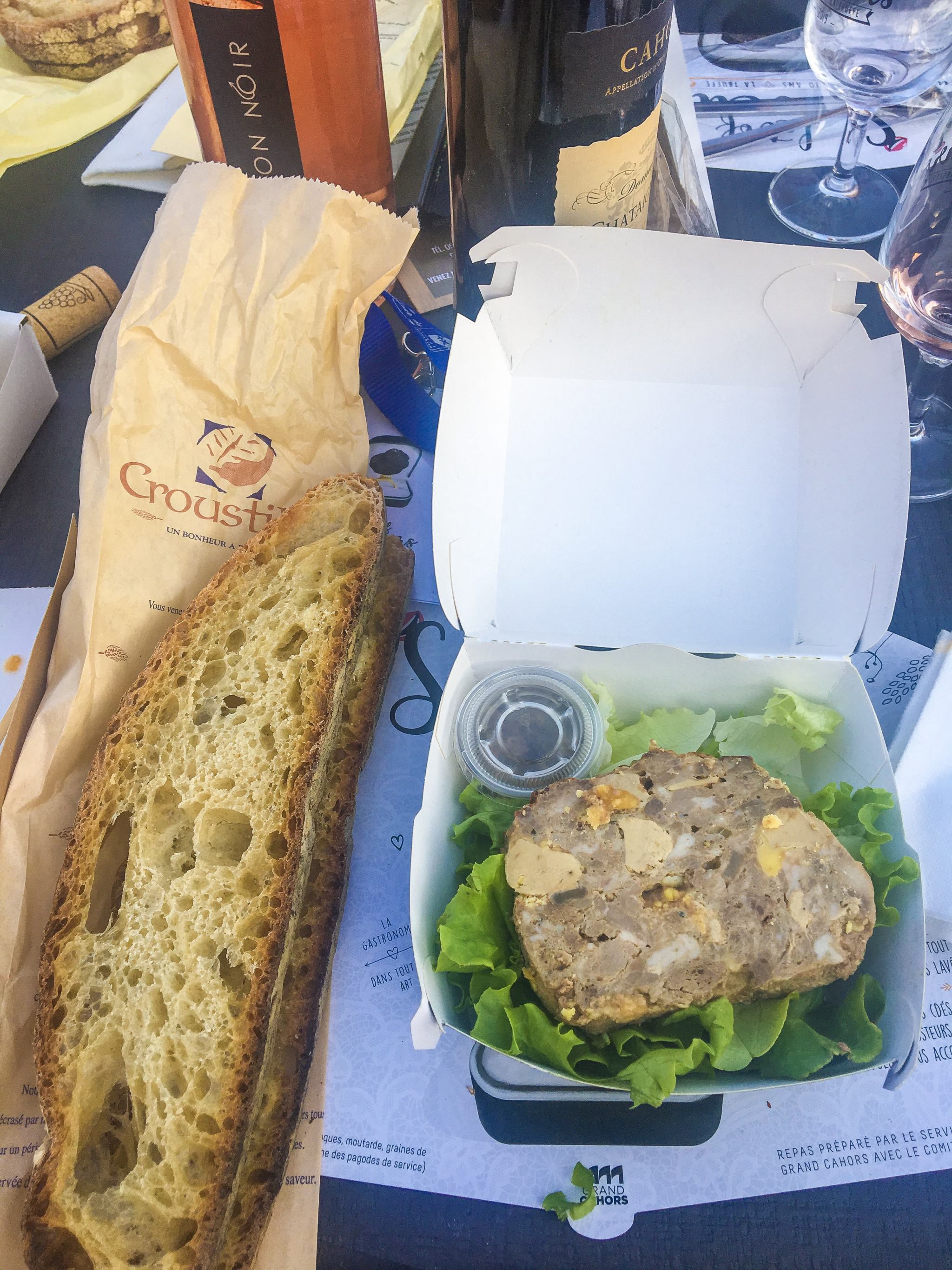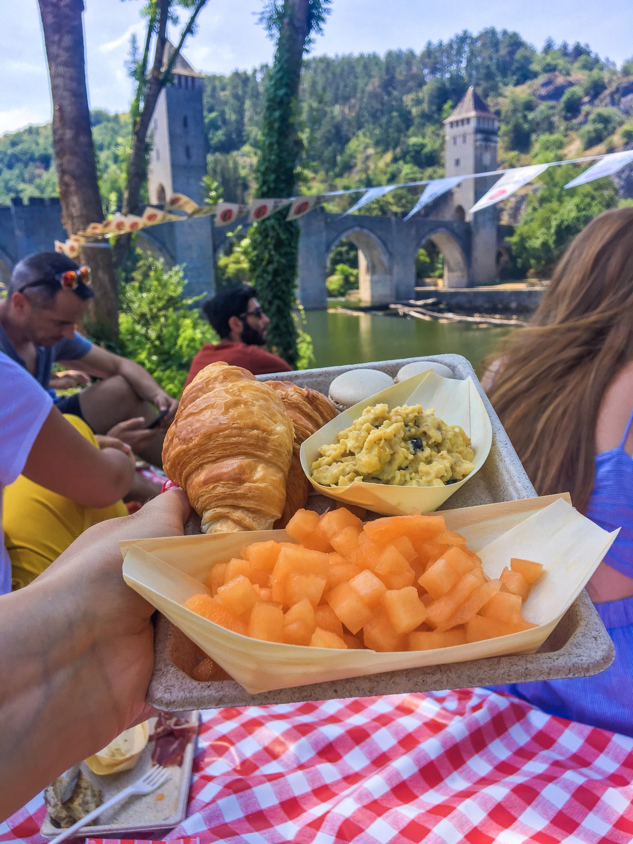 Après cette excellente découverte et dégustation, nous retournons à Cahors pour bruncher. Le cadre de ce midi est très bucolique puisqu’il s’agit de la promenade le long du Pont Valentré où nous allons déjeuner mets salés et sucrés du Syndicat des traiteurs du Lot et de la Maison de l’Artisan, viennoiseries, jus de fruits, charcuterie et truffe.