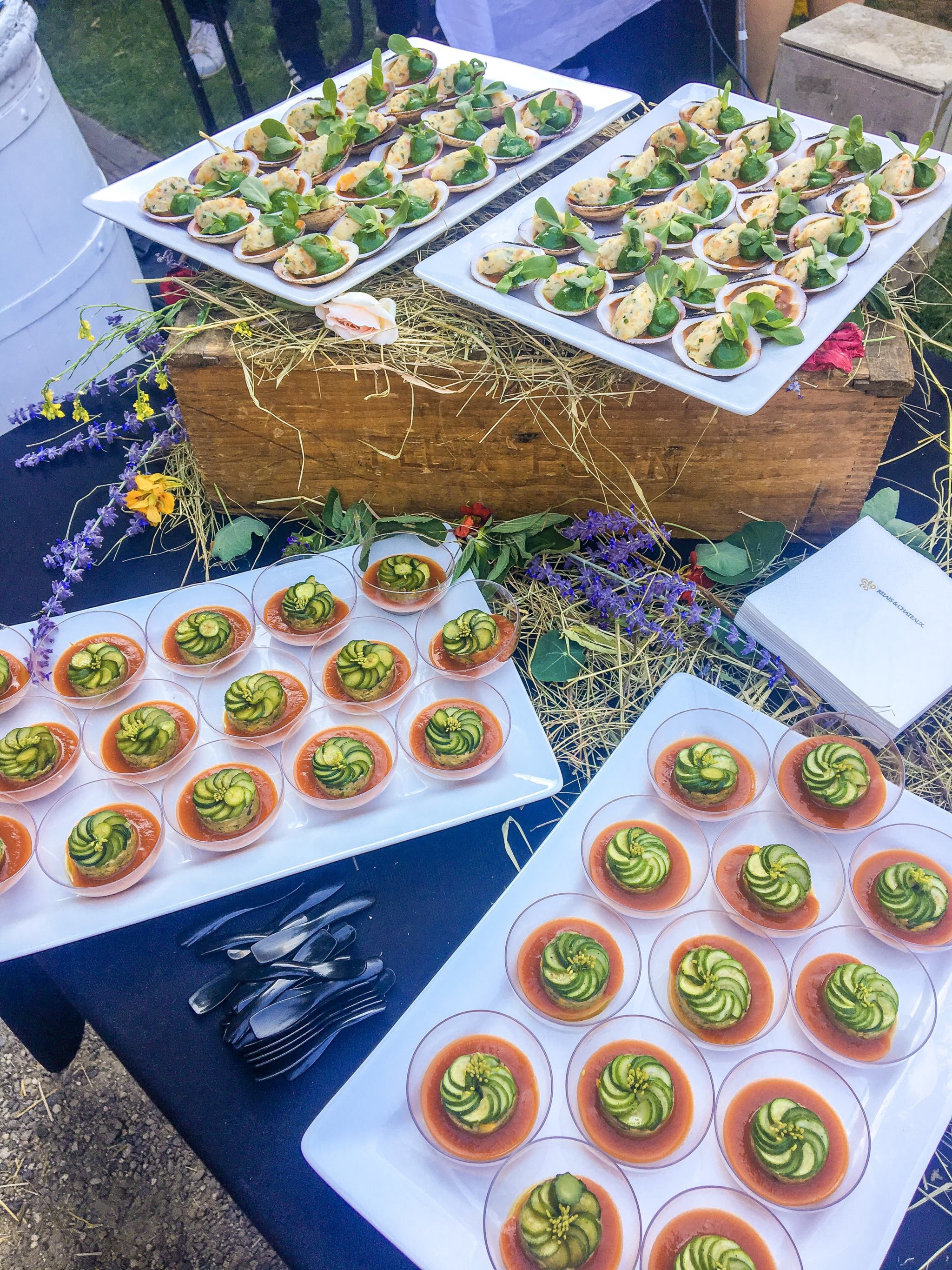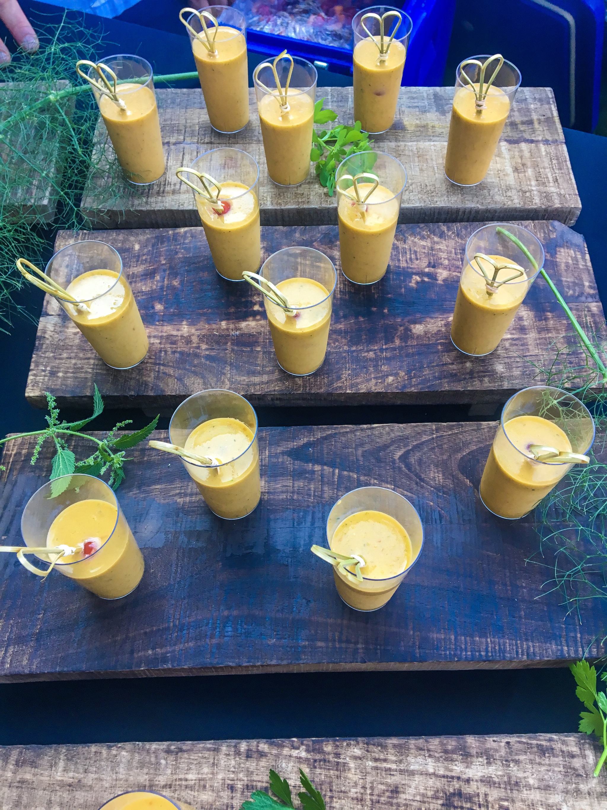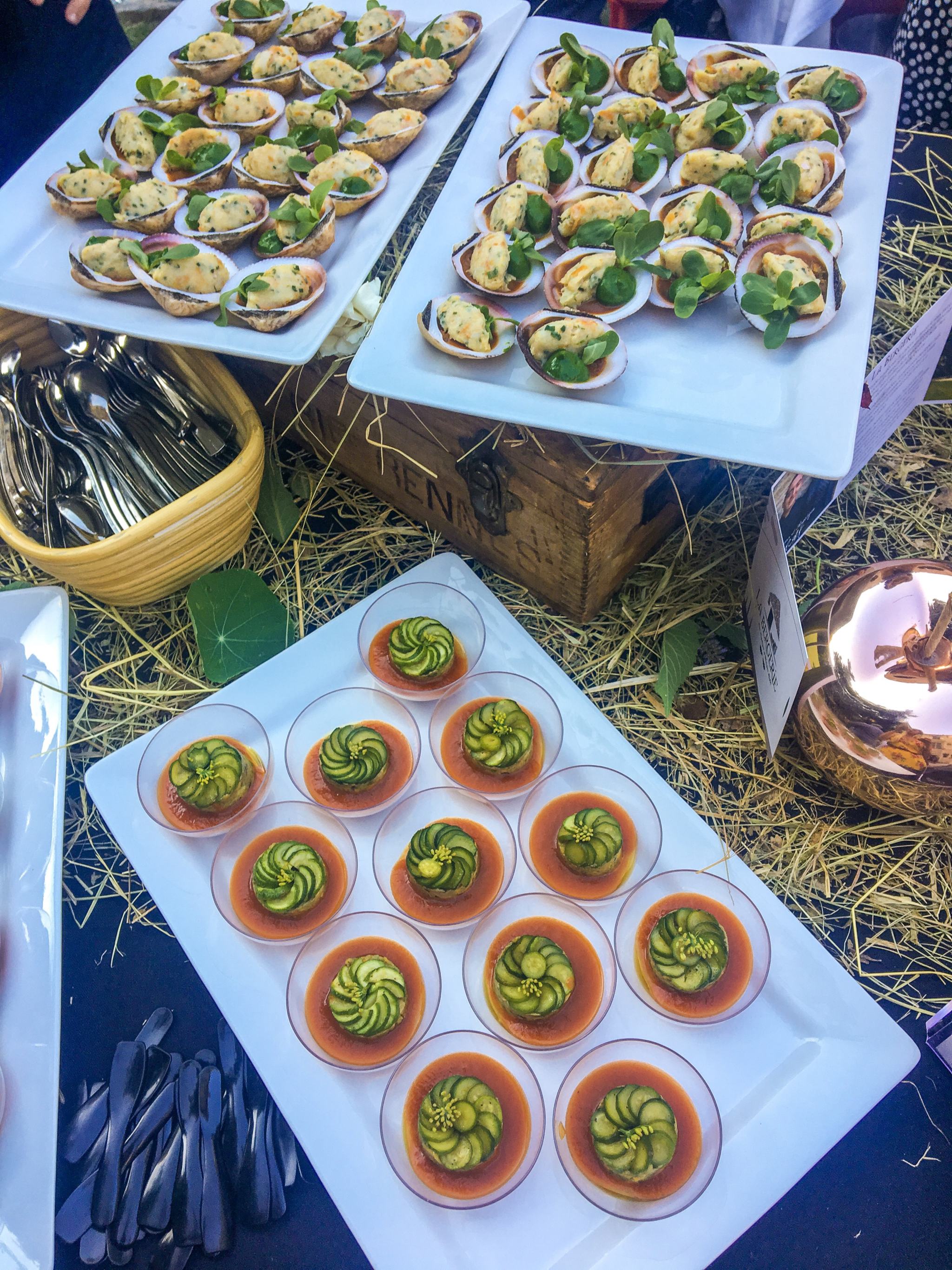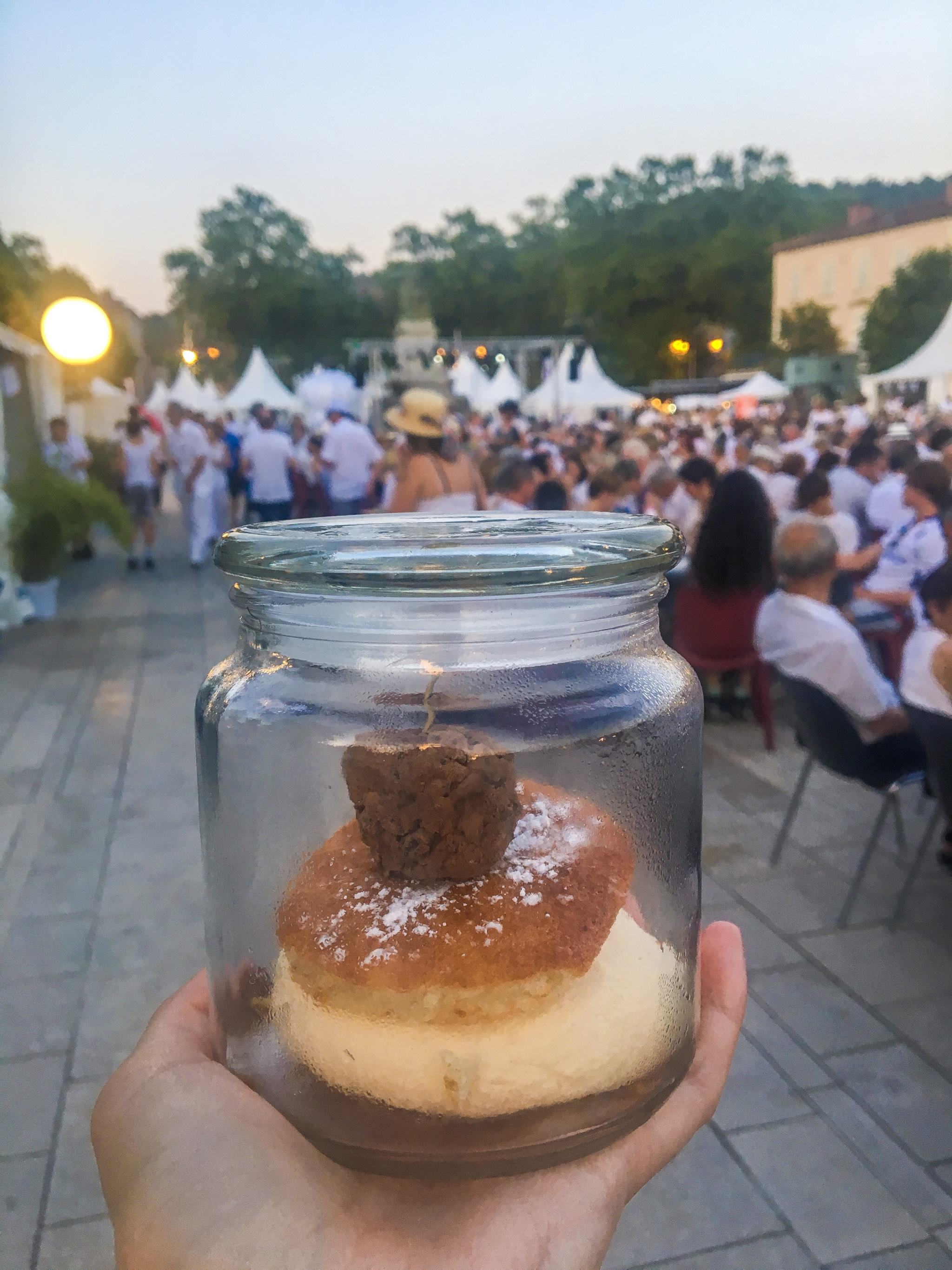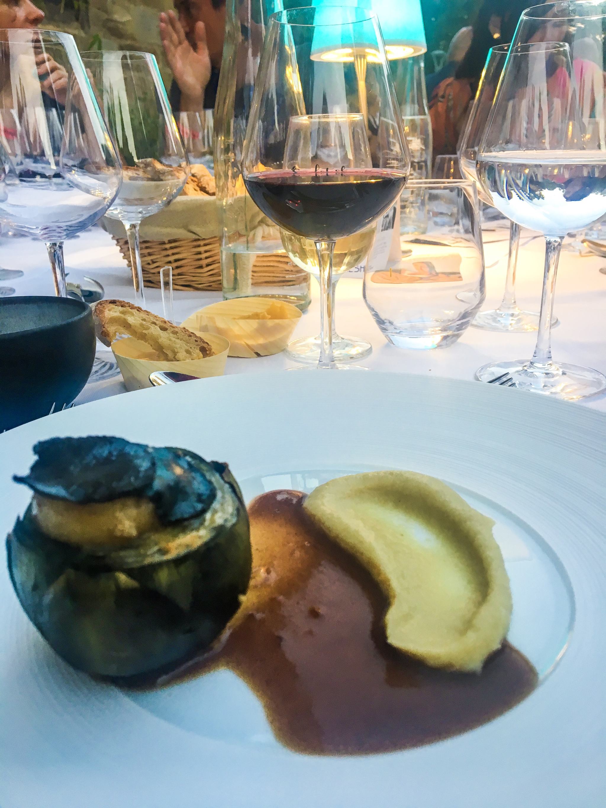 Lors de ce dîner convivial dressé sur des nappes noires en référence au nappage noir de la truffe, nous avions un dress code « tout de blanc vêtu » (la truffe d’été est blanche) pour rendre hommage à la truffe dont la couleur a tendance à changer, le menu était :