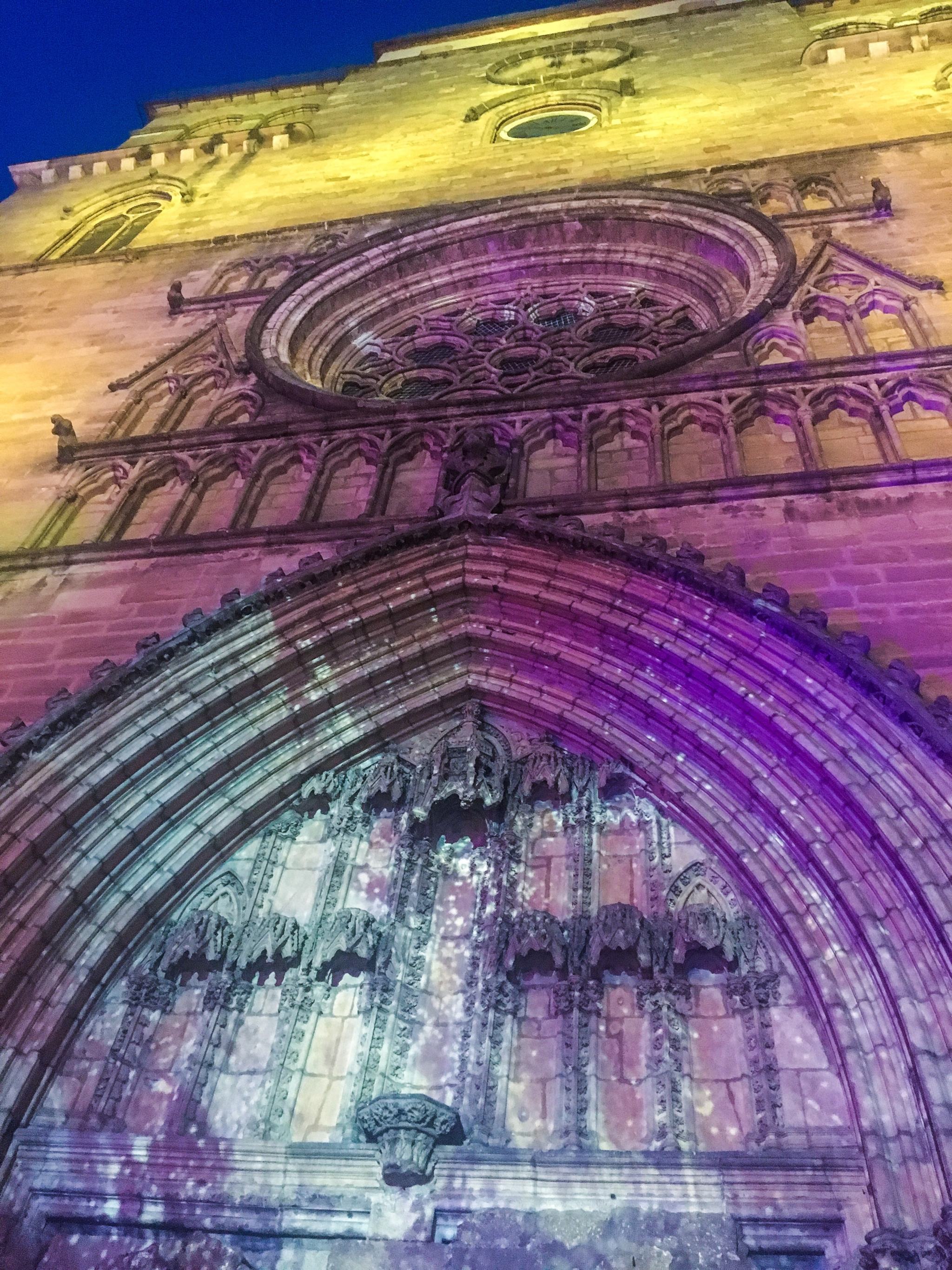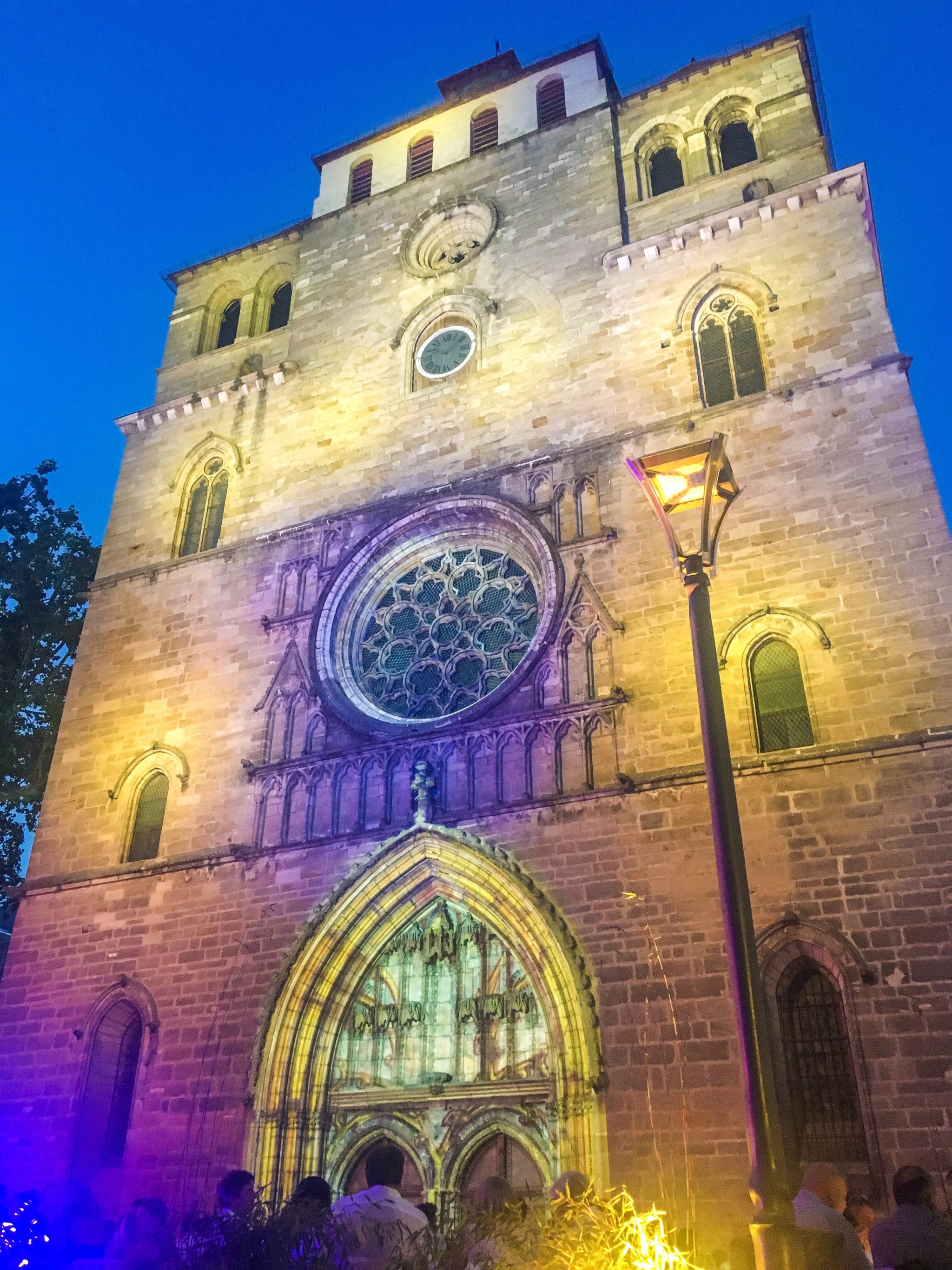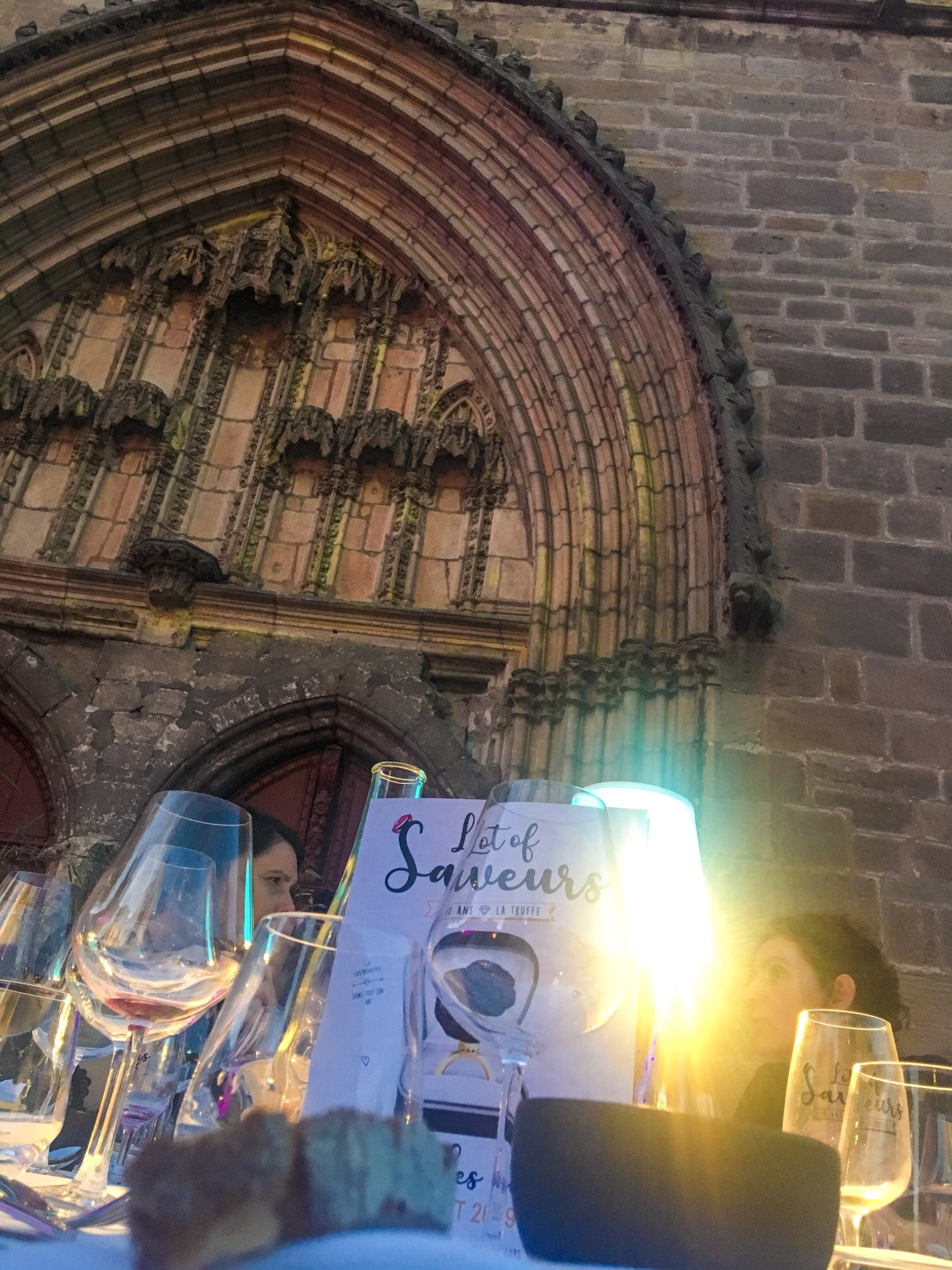 Nous terminons cette belle expédition dans le Sud par un dernier apéro dans un lieu bien choisi et atypique, le cloître de la cathédrale de Cahors. Pour fêter les 900 ans de cette dernière, le dîner de clôture Repas des Chefs des Bonnes Tables du Lot est organisé au pied de la cathédrale sur laquelle sont projetés des jeux de lumières. Un cadre fabuleux pour cette dernière soirée dont voici le menu :